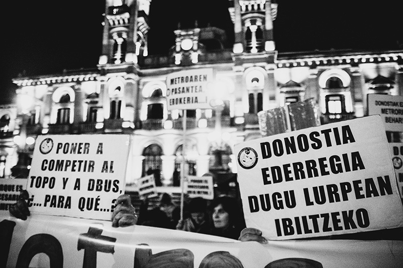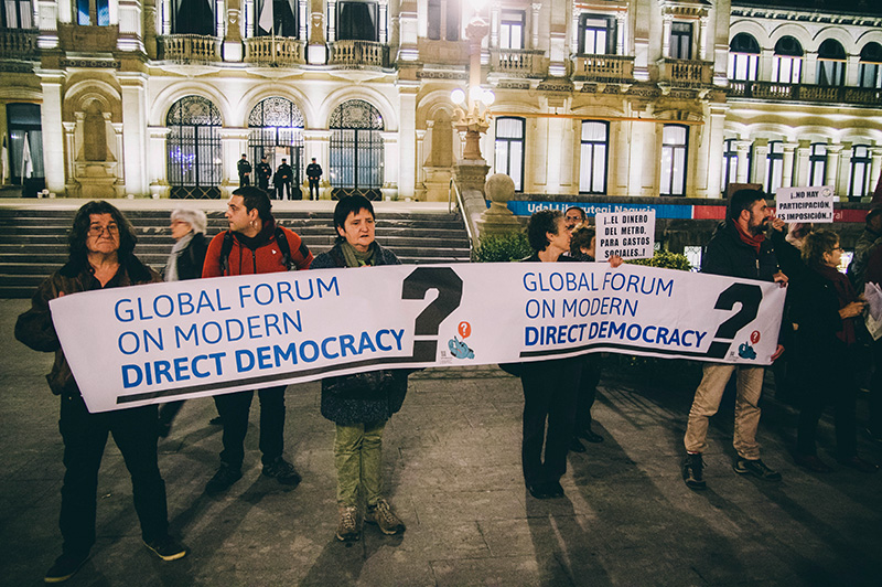 Cerca de 200 personas se han manifestado hoy frente al Ayuntamiento con motivo del Foro Global sobre Democracia Directa Moderna que se empieza a celebrar mañana jueves en el Palacio Miramar y en representación de las plataformas que a día de hoy están movilizadas en Donostia y piden consultas populares para resolver determinados temas: Satorralaia (en contra del metro), el Movimiento contra la Incineración, la Plataforma Donostia Antitaurina Orain, la Plataforma Stop Desahucios, el colectivo SOS Miracruz 19 (en contra del derribo del edificio de Gros) y Viveros de Ulia. A estos se les han unido Eleak-Libre, el sindicato LAB, el grupo Irabazi Donostia y varios miembros de EH Bildu y del Grupo Juntero de Podemos. Todos los presentes han coreado consignas a favor de la participación, «no de la imposición», y han mantenido la protesta hasta que ha entrado el último de los participantes en el Foro Global sobre Democracia, que empieza mañana, pero que hoy tenía un acto de bienvenida en el Consistorio.
