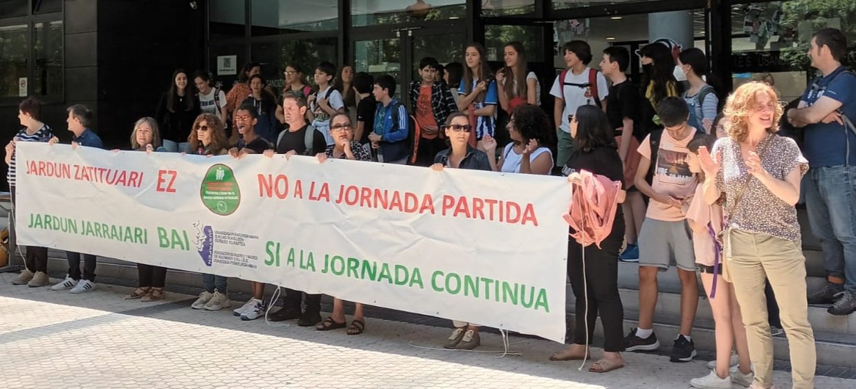 Asociaciones de Madres y Padres de Alumnos de la CAV reiteran su rechazo a la «imposición que ha llegado desde el Departamento de Educación, ya que a partir del próximo curso la jornada lectiva partida será de obligado cumplimiento para todos los centros. Esto, después de dos años en que, a partir de las medidas tomadas por la pandemia, hemos funcionado con jornada continua de manera satisfactoria para todos».