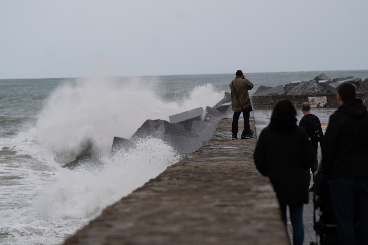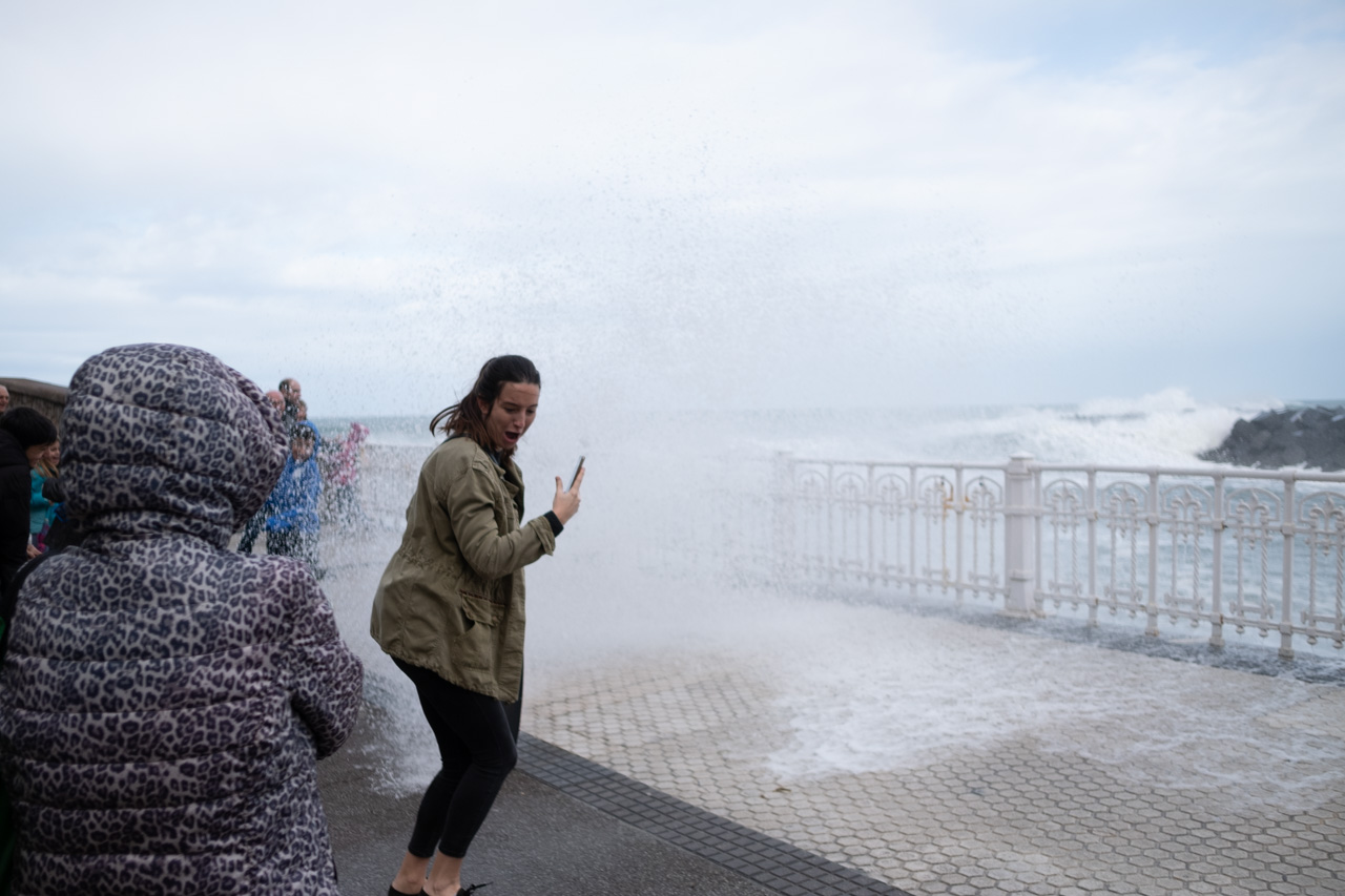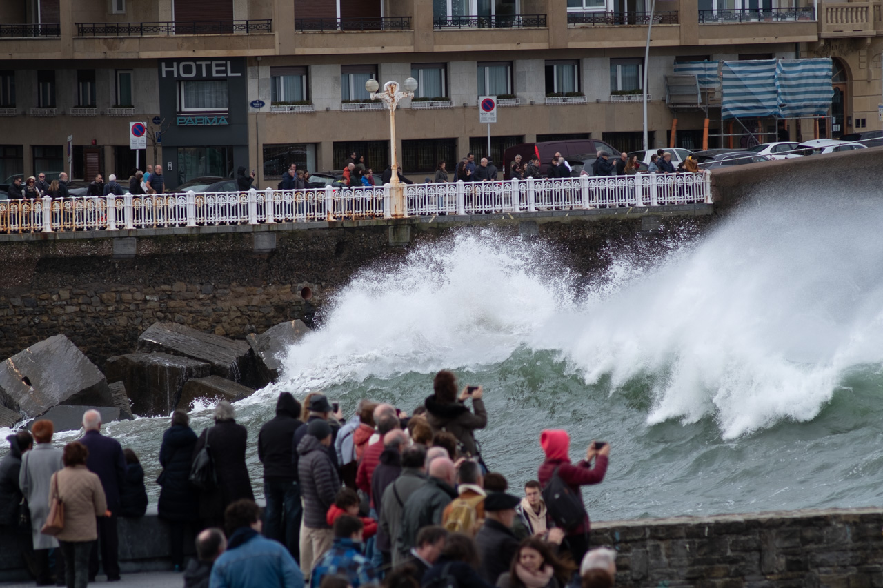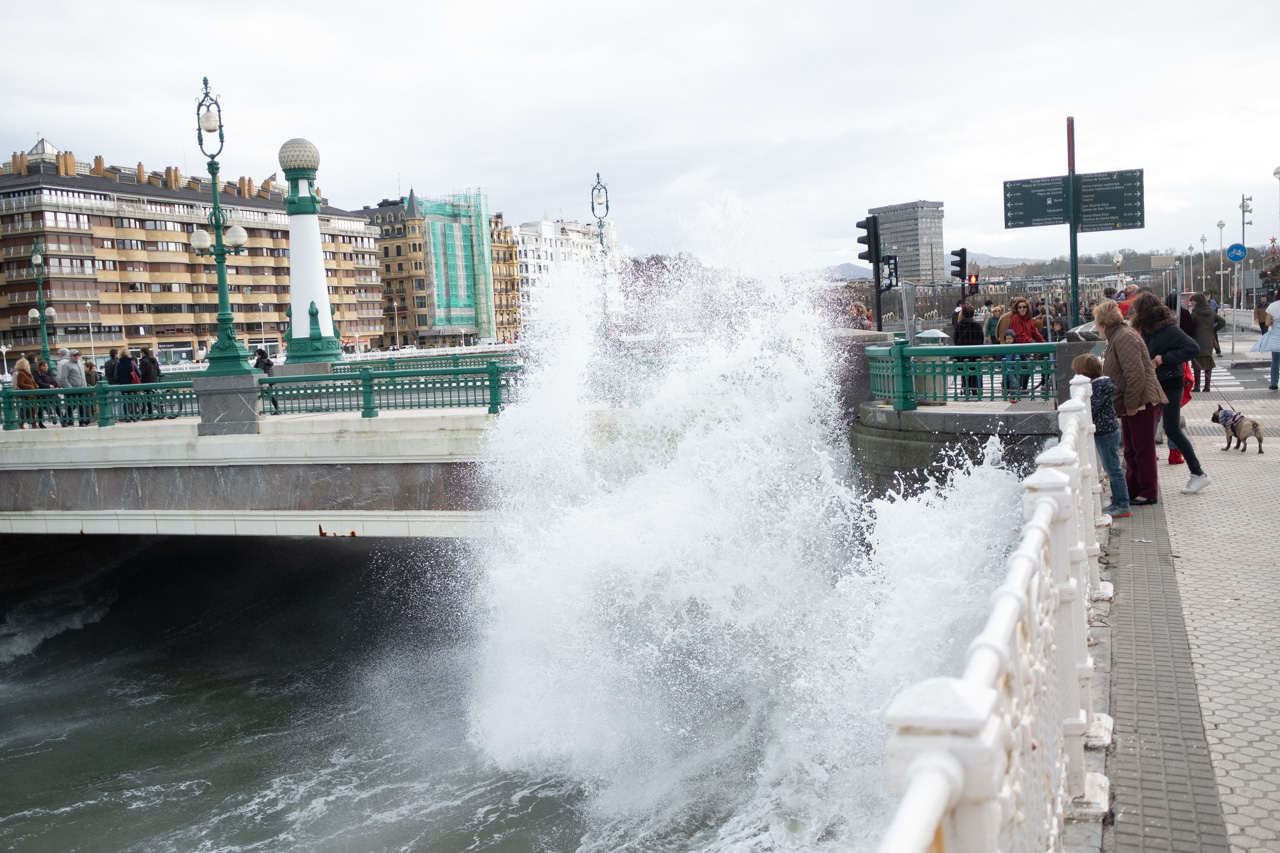 Las olas han golpeado la costa donostiarra durante la intensa pleamar pasadas las 13 horas y en plena Alerta Naranja decretada por Euskalmet. Pocos han resistido la tentación de acercarse a las orillas, aunque con las advertencias del Ayuntamiento (y las multas) ha aumentado claramente el respeto por las zonas precintadas.