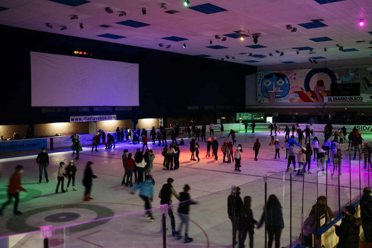 Las 19:20 es la hora de la metamorfosis. El Palacio se transforma en una enorme sala de fiesta. Suena una versión atronadora del Gangnam Style. Se suprimen las luces, los focos discotequeros toman la pista en todas las direcciones. Apenas se distinguen los dibujos de los murales. Solo quedan jóvenes y adultos. Los más pequeños, que patinaban ayudados por unos simpáticos taca-taca de colores, han abandonado el hielo. Se mueven cómo pueden por el suelo de goma, van a cambiar su calzado en los vestuarios. Llega el turno de un clásico, el Lau Teilatu de Itoiz. Aunque la gente sigue patinando a su aire, el ambiente es otro. “Esto se parece a cuando en el Young Play ponían las lentas”, comenta Ainara.