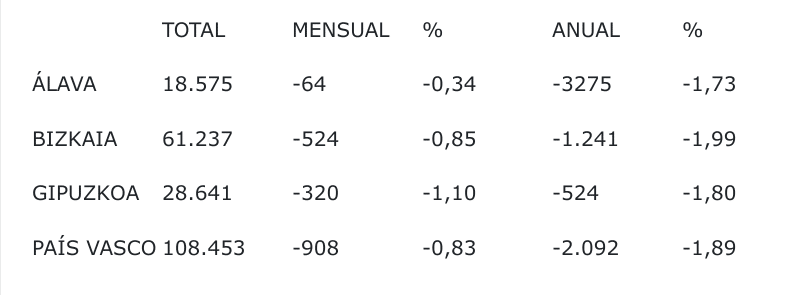 (EFE). El paro registrado en febrero en Euskadi ha bajado en 908 personas respecto a enero, un mes tradicionalmente malo para el empleo, lo que supone un descenso del 0,83 %, hasta situar el total en 108.453. Gipuzkoa ha registrado un descenso de 320 personas desempleadas, un 1,10 %, hasta las 28.641;