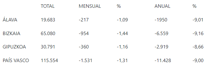 En Álava la bajada ha supuesto un 1,09 %, lo que da un descenso de 217 personas, con un total de 19.683 actualmente en paro.