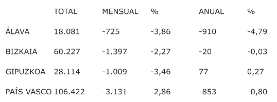 Por territorios, el paro se ha reducido en 725 personas en Álava, lo que supone un 3,86 %, hasta situar la cifra total de parados en este territorio en 18.081.