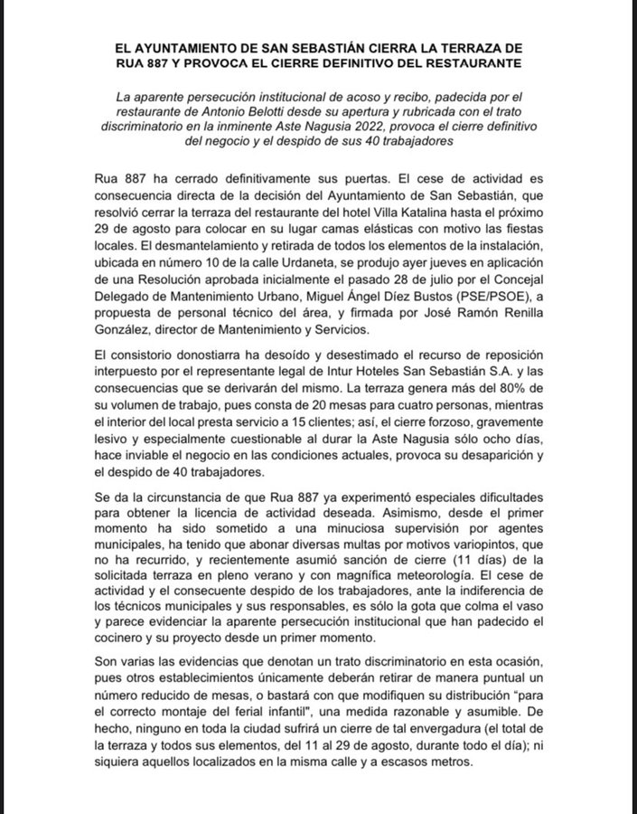Los responsables de Rua 887 consideran la medida «forzosa, gravemente lesiva y especialmente cuestionable». Y aseguran que ya en su momento experimentaron dificultades para obtener la licencia de actividad. «Esto es la gota que colma el vaso de la aparente persecución institucional» que, en sus palabras, sufrirían el proyecto y el cocinero.