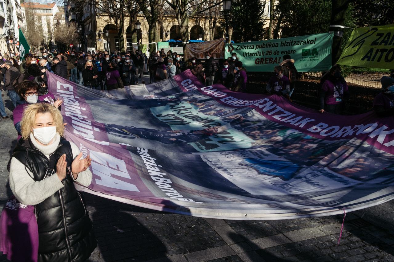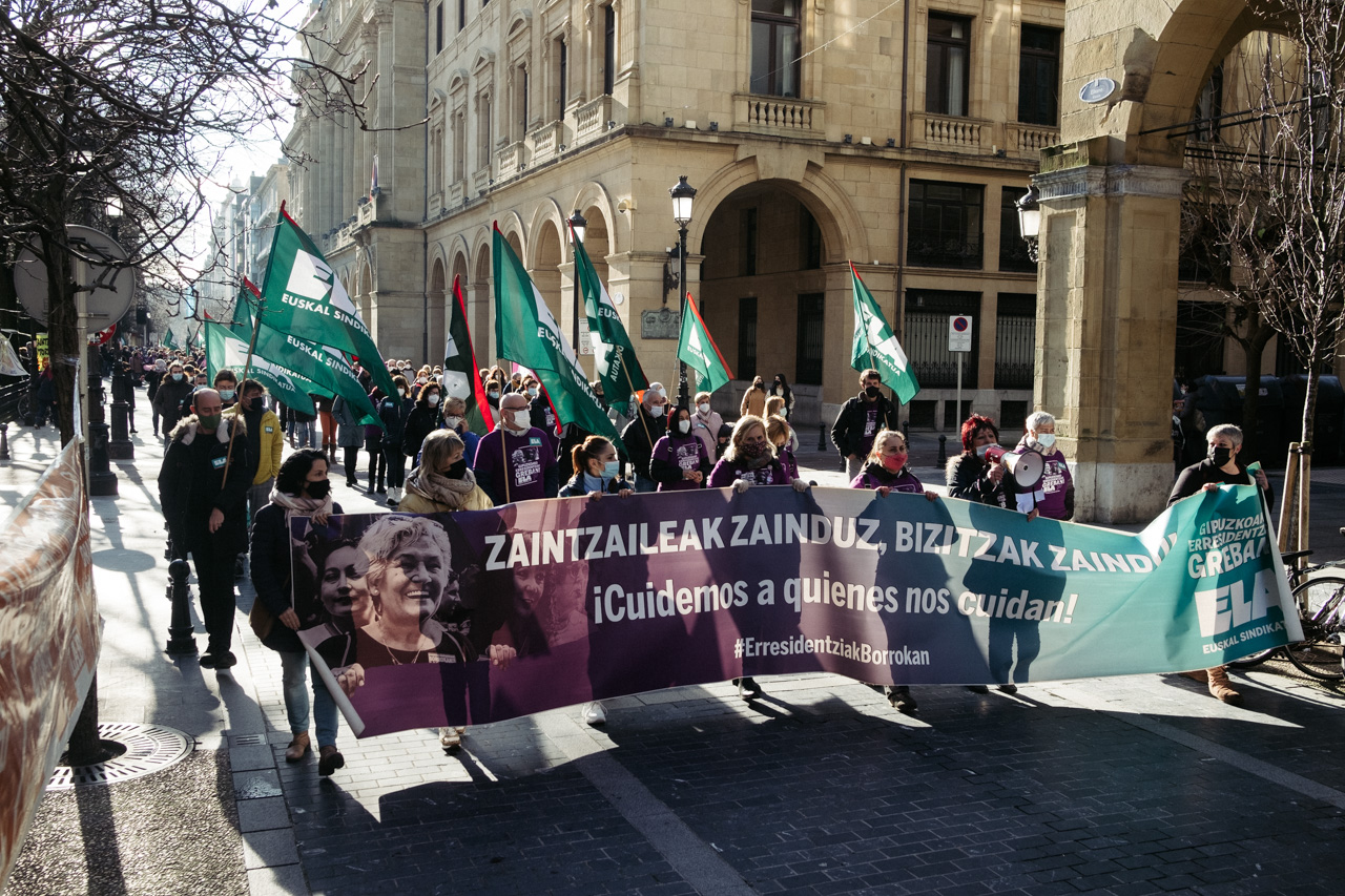 Miles de trabajadoras y ciudadanía, en general, han participado en las manifestaciones convocadas, que han contado con el apoyo de asociaciones de familiares como Babestu o Gipuzkoako Senideak, asociaciones de trabajadoras del hogar, diferentes plataformas de pensionistas y colectivos feministas, entre otras. Una vez más ELA ha denunciado los servicios mínimos totalmente abusivos decretados por el Gobierno Vasco.