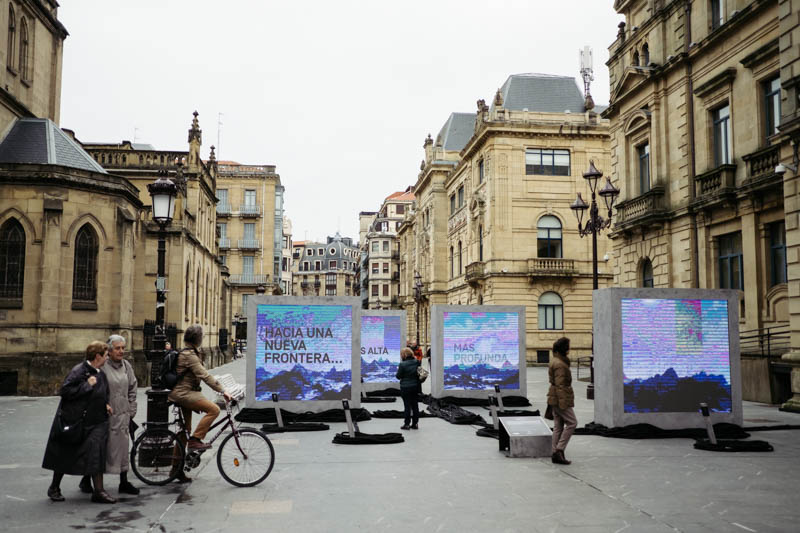 Esta singular exposición se compone de cuatro grandes módulos audiovisuales, de doble cara, levantados sobre una instalación formada por más de dos mil metros de cabos de amarre que, representando el largo y continuo viaje del hombre ante lo desconocido, convertirán durante las próximas semanas la plaza en un muelle listo para la exploración.