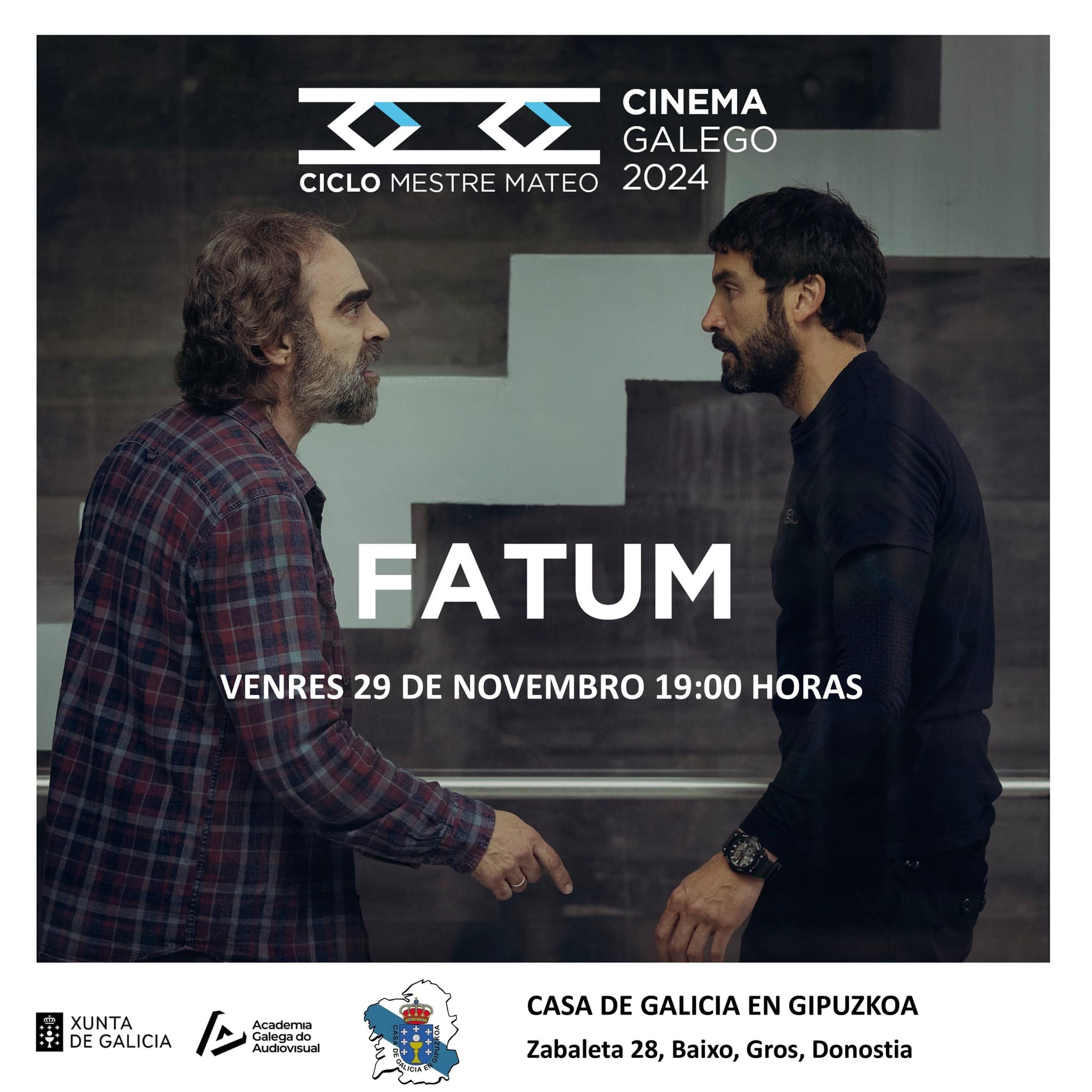 La Casa de Galicia en Donostia (calle Zabaleta, 28) va a programar este viernes 29 de noviembre, en gallego y subtitulada, la película ‘Fatum’. La sesión será a las 19 horas y la entrada será gratuita hasta completar aforo.
