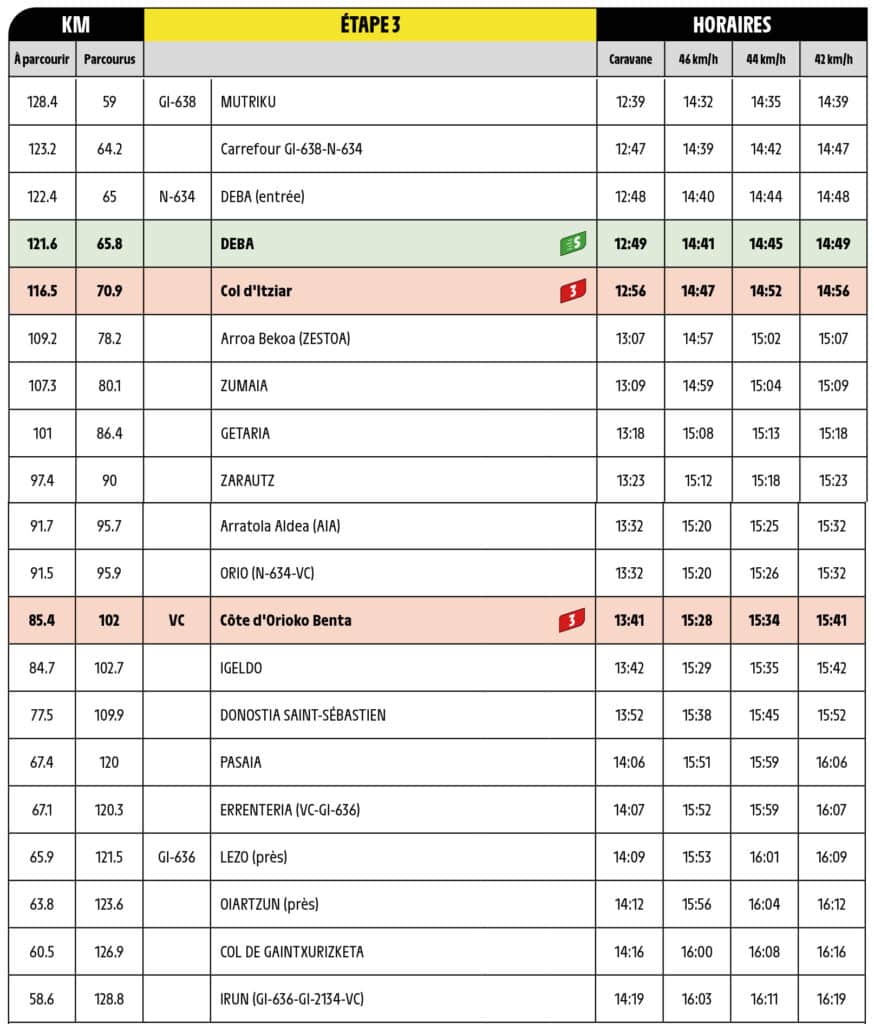En lo que afecta a Gipuzkoa la carrera entrará en Mutriku por la GI-638 a partir de las 13.42, pasará por Deba a partir de las 14.40, por Zumaia a partir de las 14.59, por Zarautz a partir de las 15.12, Orio a partir de las 15.20, Igeldo a las 15.29 (bajando desde Ventas de Orio).