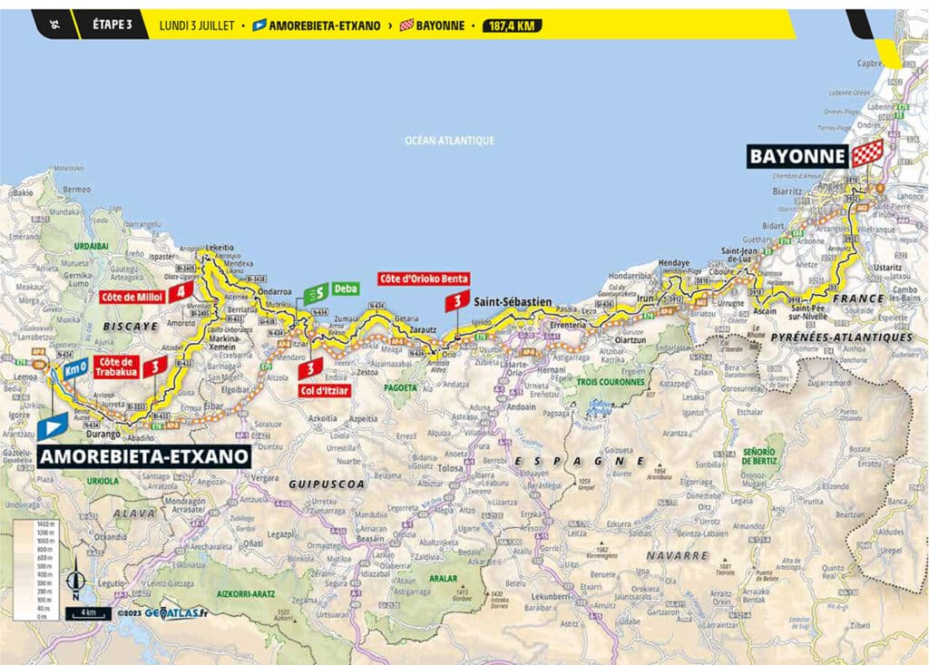 Repasamos el trayecto gipuzkoano de la etapa del lunes y algunos horarios. La etapa completa partirá de Amorebieta Etxano y terminará en Bayona.