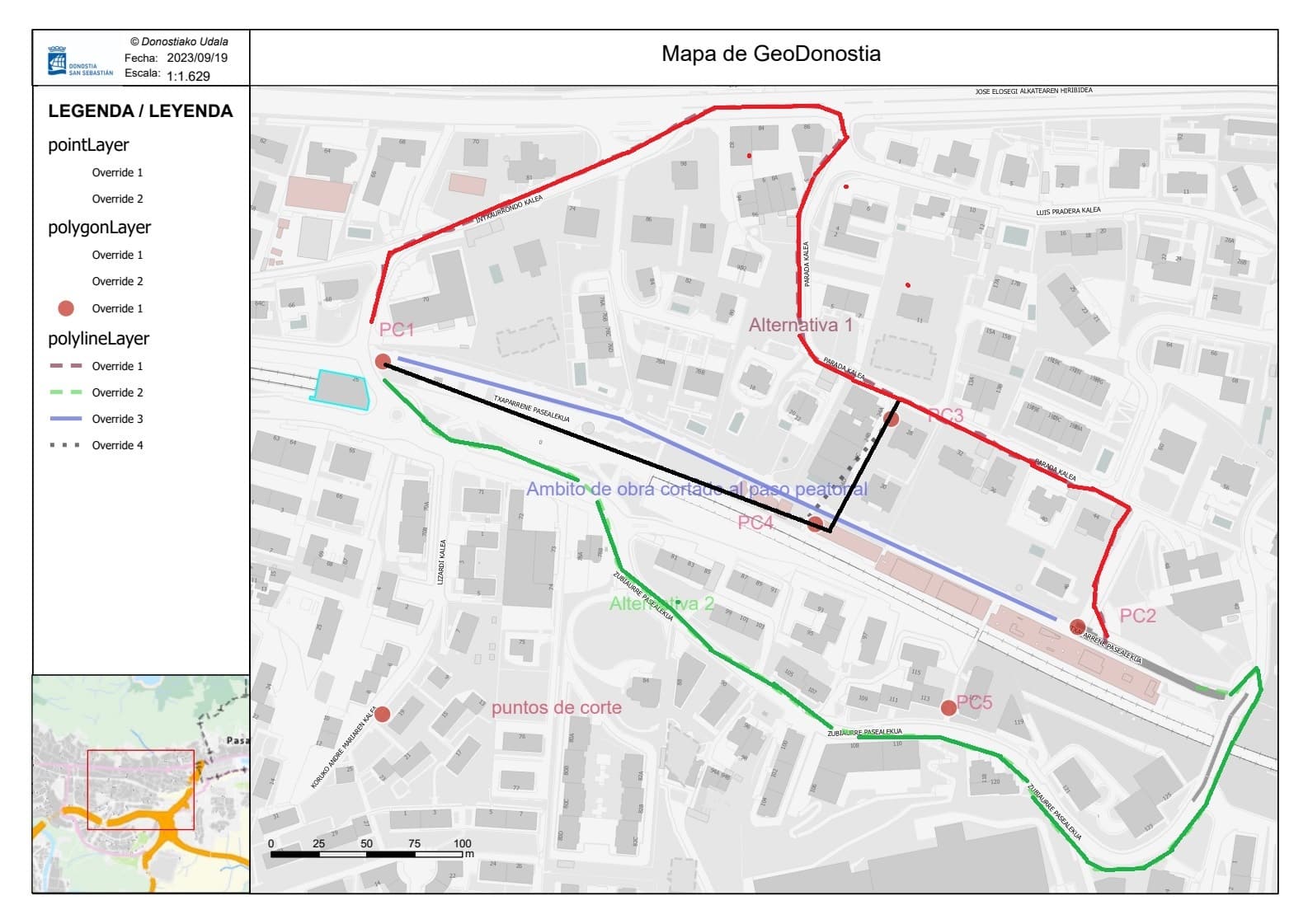 Para estos días de obras, las alternativas de paso peatonal “se alejan un tanto los itinerarios cómodos”. Una primera posibilidad (línea roja) sube por la calle Caserío Parada, con unas aceras bastante estrechas y un recorrido mucho más largo hasta Ategorrieta. Para la segunda alternativa (línea verde), se debe subir al puente de Garro, cruzar las vías del ferrocarril y tomar la calle Zubiaurre. Tras los primeros días de obras, en torno a la primera semana de octubre, se habilitará un “atajo” (marcado en negro en el mapa) por el propio Paseo de Txaparrene hasta alcanzar la calle Parada, acortando así el itinerario por esa zona.