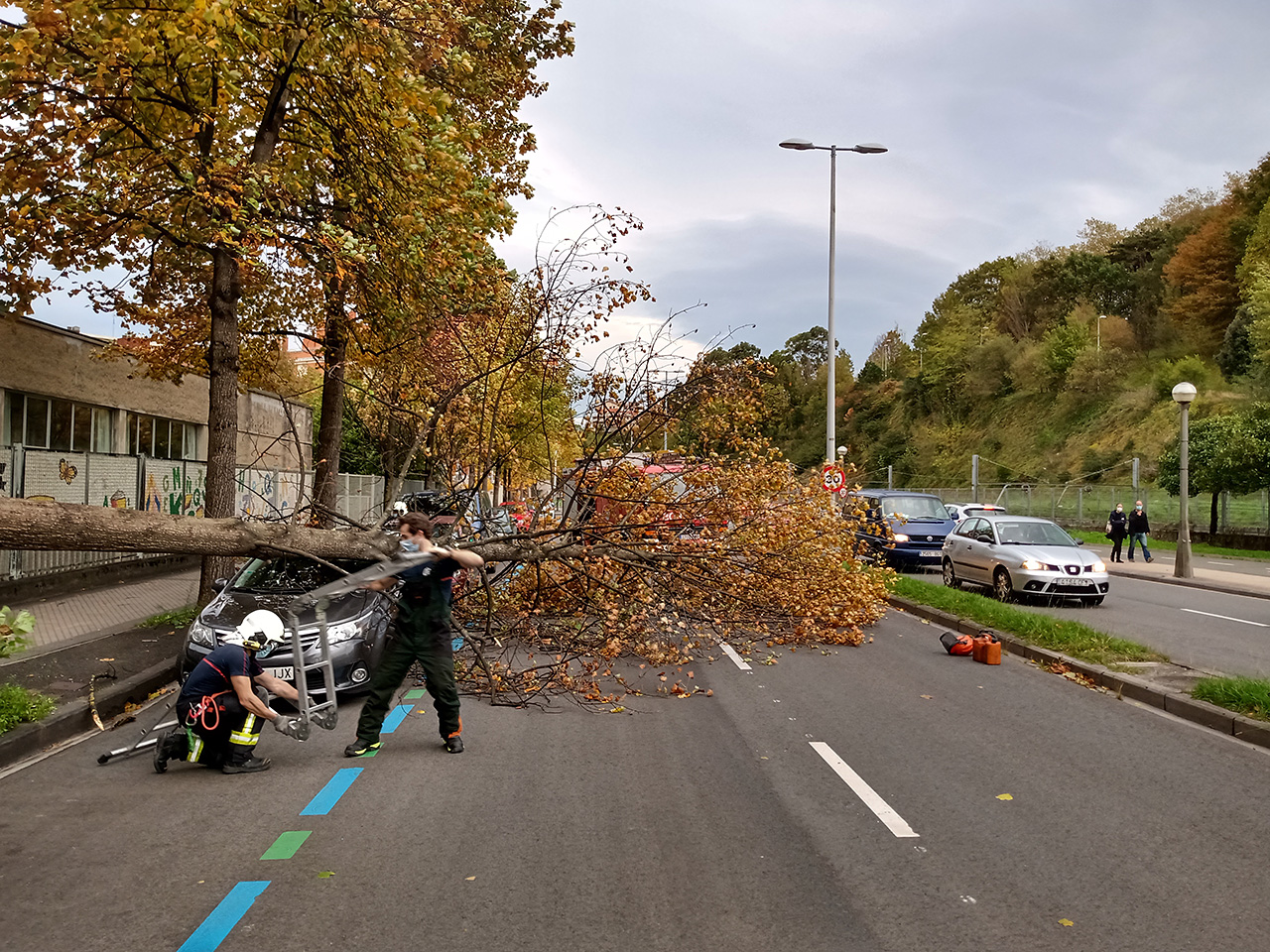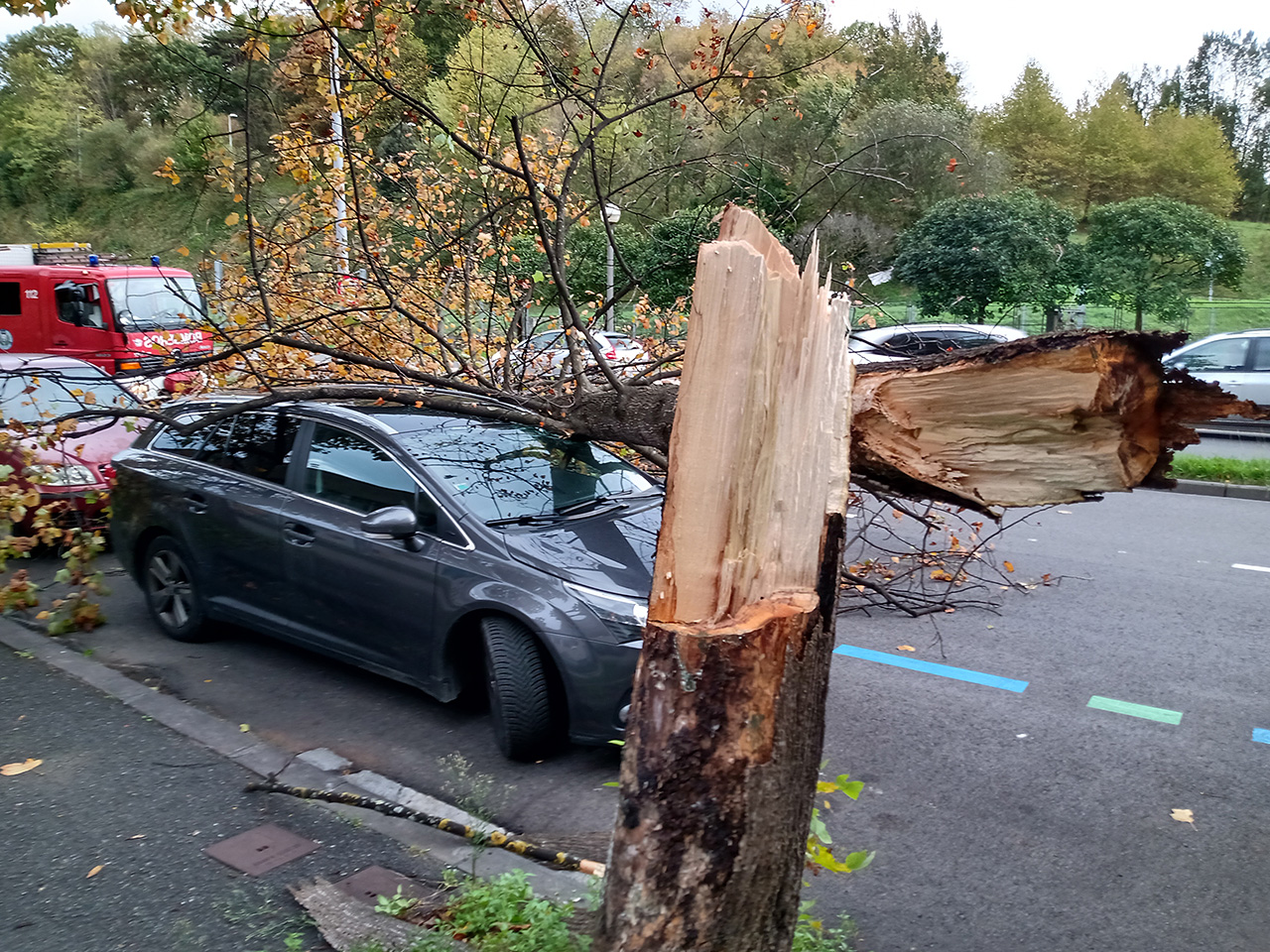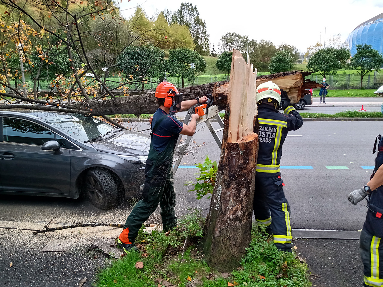 El viento ha podido con un árbol que ha caído sobre un coche que estaba aparcado en el Paseo de Zorroaga 7. Los bomberos se afanaban en retirarlo esta tarde. Las rachas de viento han sido muy fuertes en las últimas horas (110 km/h en Jaizkibel según Euskalmet).