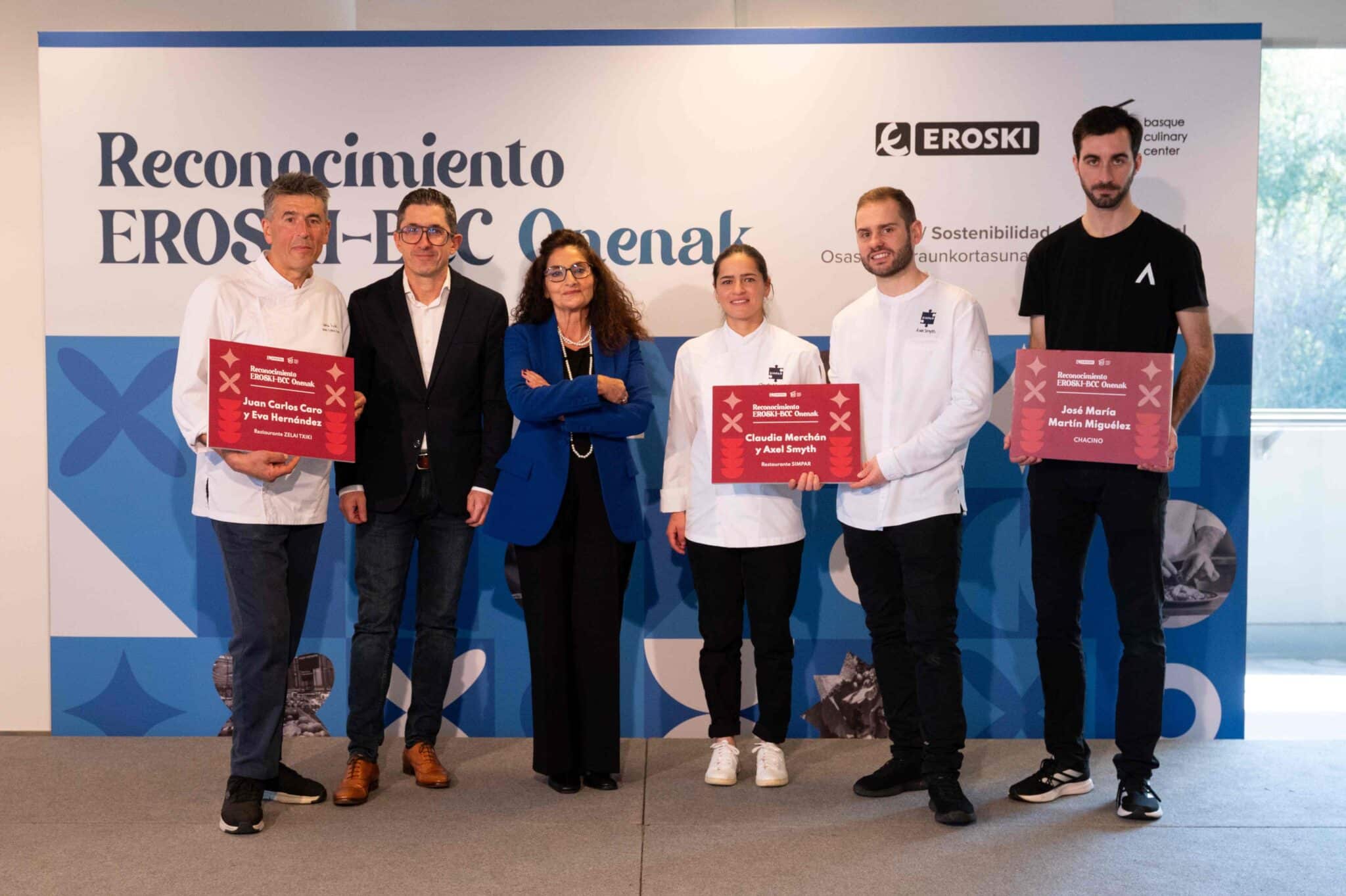 Eroski y Basque Culinary Center (BCC) reconocieron este viernes tres proyectos fraguados en el BCC que se desarrollan en los ámbitos de la sostenibilidad, el producto local y la innovación. Los cocineros Axel Smyth y Claudia Merchán (restaurante Simpar), Juan Carlos Caro y Eva Hernández (restaurante Zelai Txiki) y José María Martín Miguélez (Chacino) fueron los galardonados en esta nueva edición de los Reconocimientos Eroski Onenak 2024 celebrados en la sede de Miramon.