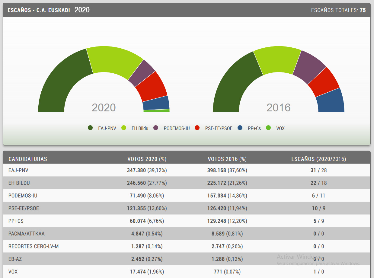 Lo cierto es que no ha habido demasiadas sorpresas respecto a lo que apuntaban las encuestas. El PNV gana tres escaños respecto a 2016 y alcanza 31 de los 75 que estaban en juego; EH Bildu gana cuatro y se sitúa en 22, el PSE gana uno y se queda con 10, Elkarrekin Podemos se desfonda perdiendo cinco escaños hasta obtener seis, PP-Ciudadanos pierde cuatro escaños hasta quedarse con cinco y Vox irrumpe con un escaño en el Parlamento vasco gracias a votos en Araba.