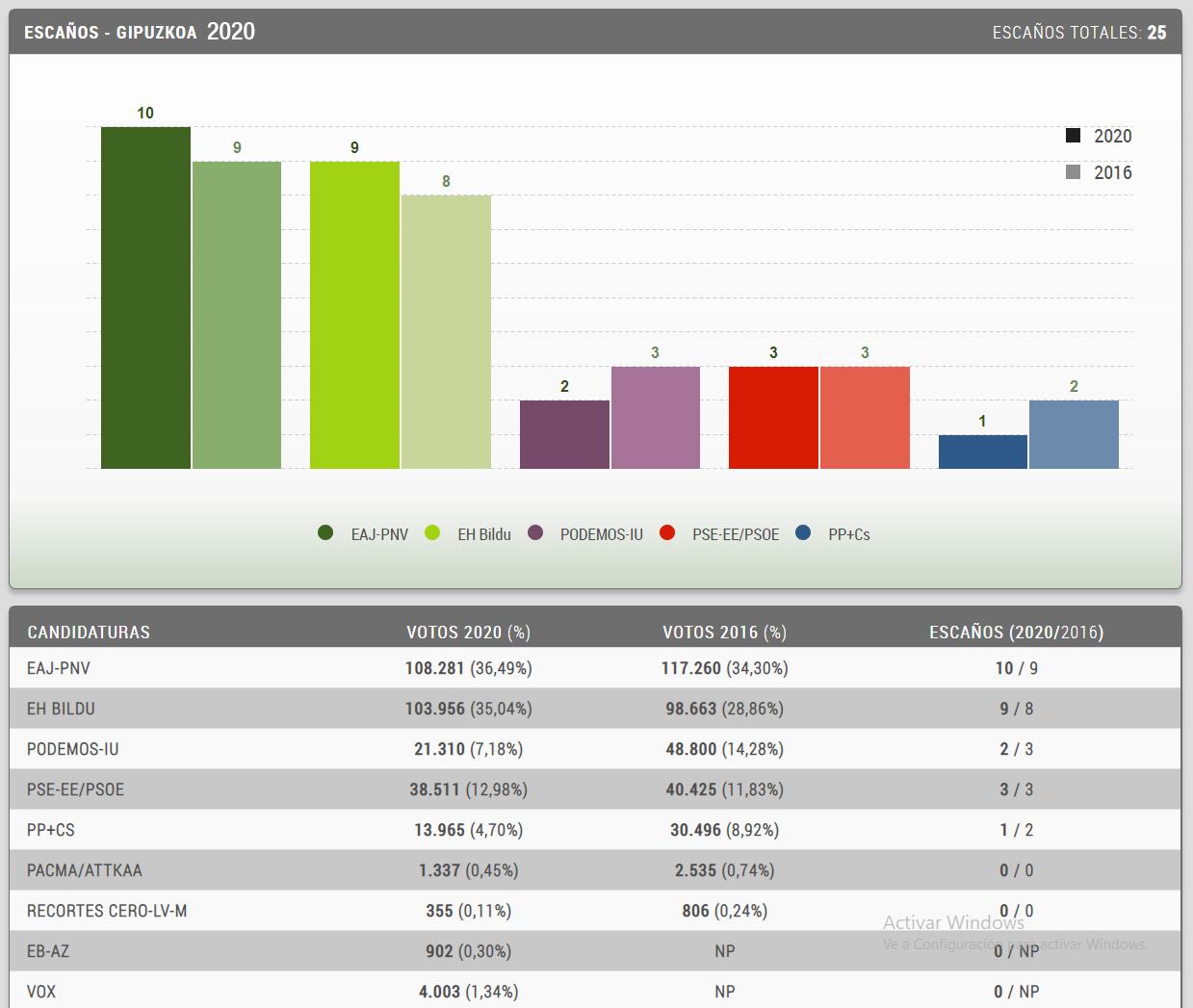 En Gipuzkoa no hay cambios abruptos respecto a 2016: los jeltzales ganan un escaño y se quedan con diez, igual que hace EH Bildu que se queda con 9; el PSE, tercera fuerza, repite con tres escaños, Elkarrekin Podemos pierde uno y se queda con dos y PP-Ciudadanos también pierde un escaño y conserva otro.
