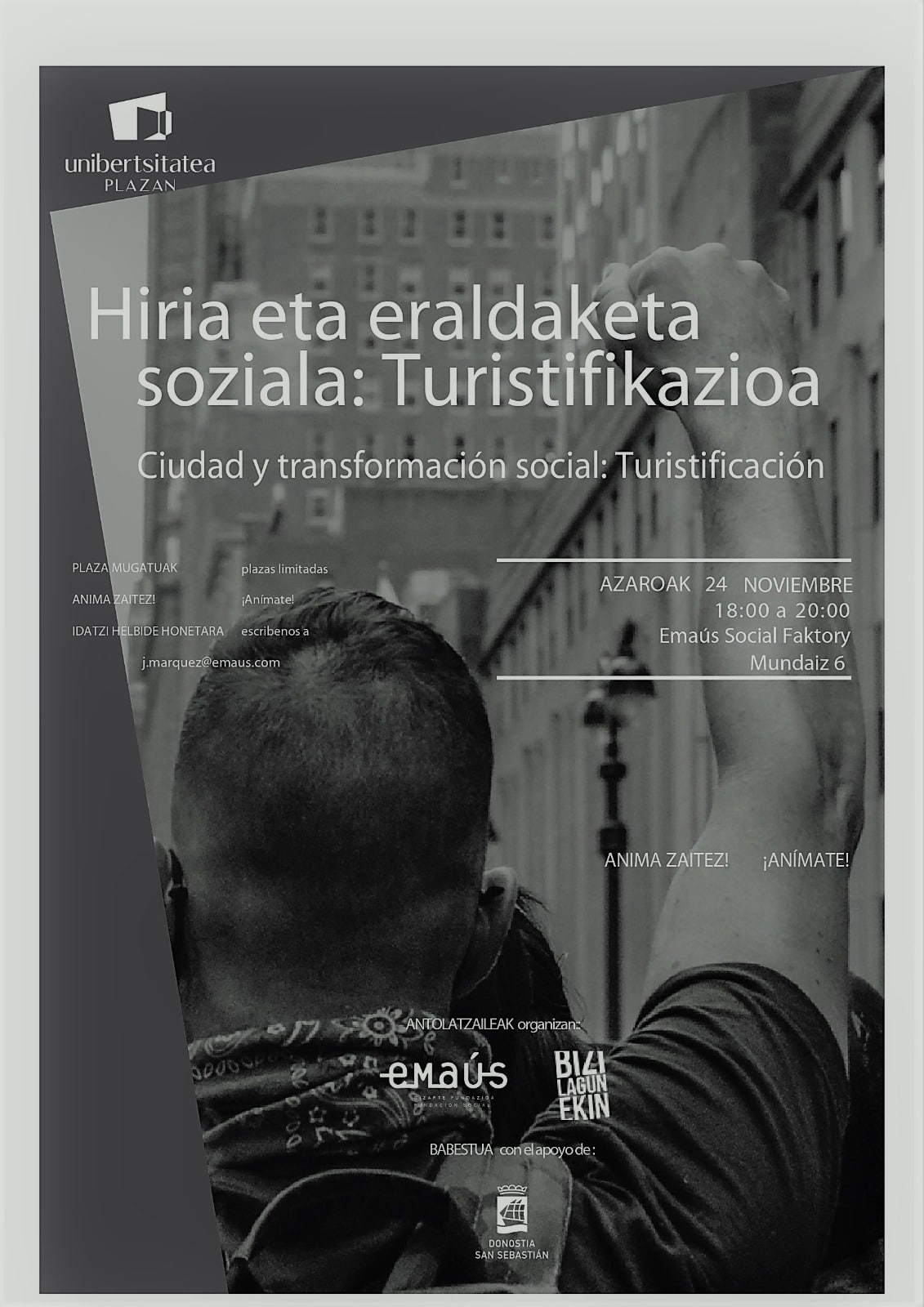 Emaús y Bizilagunekin han organizado una jornada para el día 24 de noviembre con el objeto de debatir sobre el turismo y sus efectos. «En Donostia se puede observar que el incremento de la actividad turística genera consecuencias que condicionan la vida de los donostiarras», advierten, llamando a participar a miembros de grupos, asociaciones y agentes sociales, investigadores universitarios y a toda persona interesada en el tema.