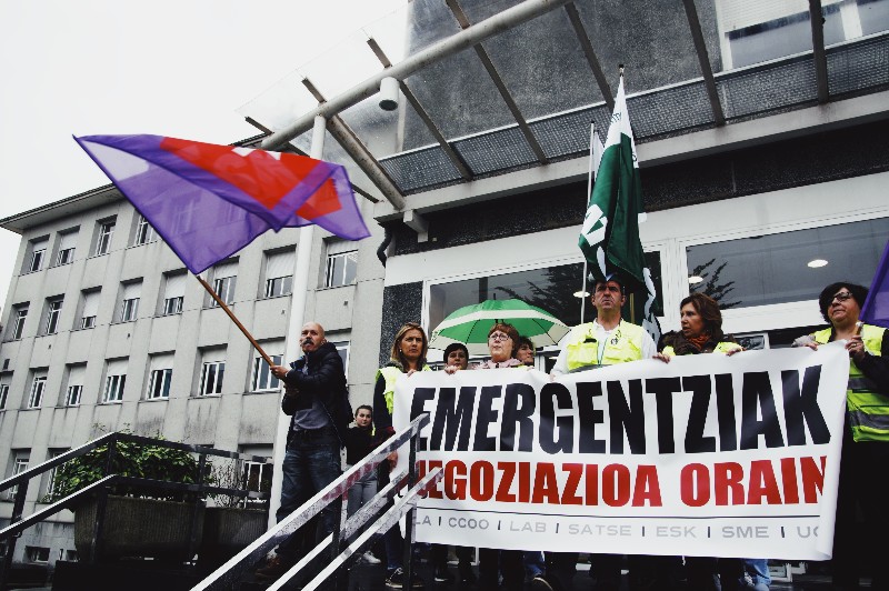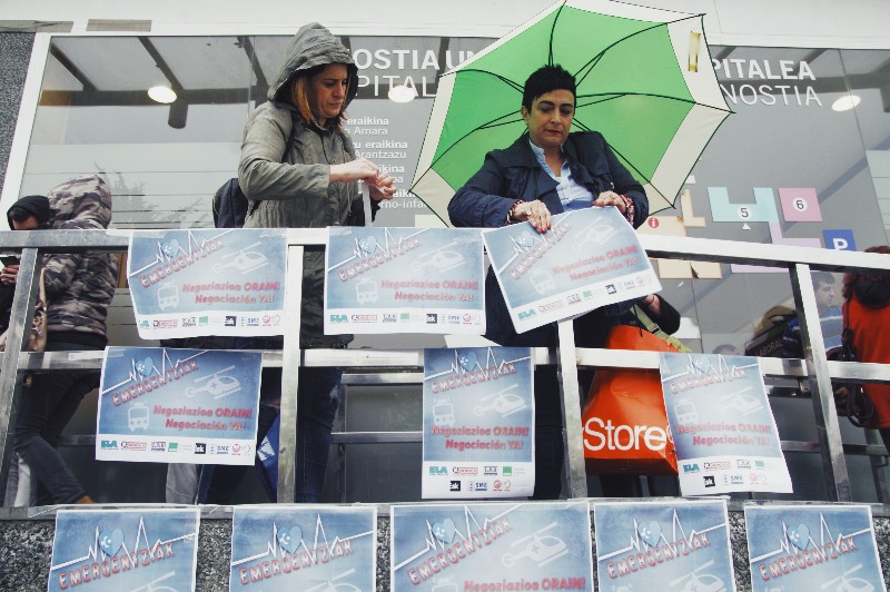 La plantilla de Emergencias de Osakidetza se ha concentrado hoy en el Hospital Donostia. Emergencias de Osakidetza junto a los sindicatos ELA, CCOO, LAB, SATSE, ESK, SME y UGT han enviado un escrito a la Dirección de Recursos Humanos y al Consejero de Salud solicitando «interlocutores válidos a los que puedan plantear la problemática real del servicio. «Los temas para negociar no se limitan a tres», denuncian los representantes de los trabajadores, que apuntan a «reivindicaciones históricas».