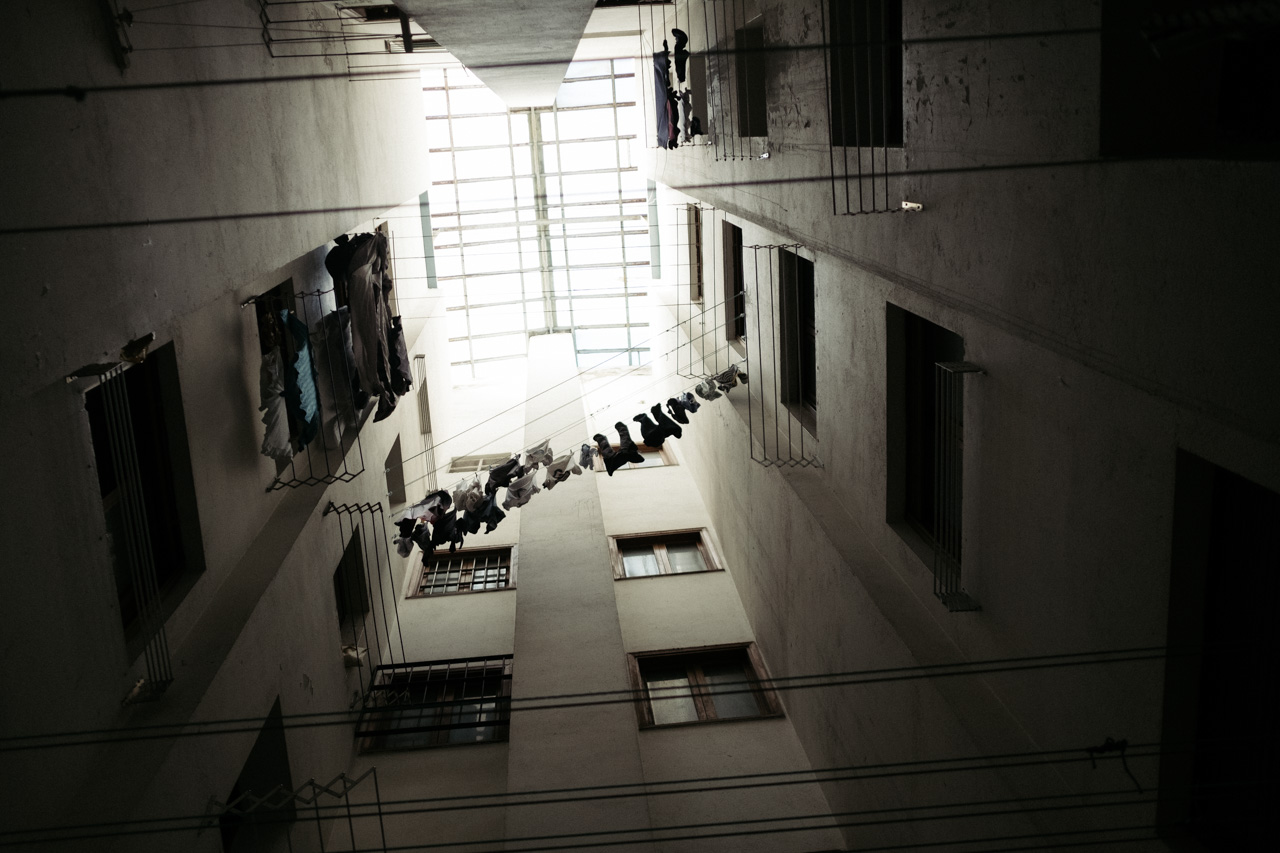 Hasta la planta número 12 una estría parte por la mitad la fachada que da a la calle principal. Después, en los pisos 13 y 14 se construyeron varios dúplex. Las últimas plantas cuentan a su vez con un patio interior cubierto donde los vecinos pueden colgar su ropa a resguardo del mal tiempo. Hoy el día es espléndido, el sol inunda el espacio. Una nota pegada en la puerta avisa de una incidencia: “En varias ocasiones ha faltado ropa de los tenderetes. Si alguien observa algo en el patio, rogamos lo comunique a los vecinos de la planta. Gracias”.