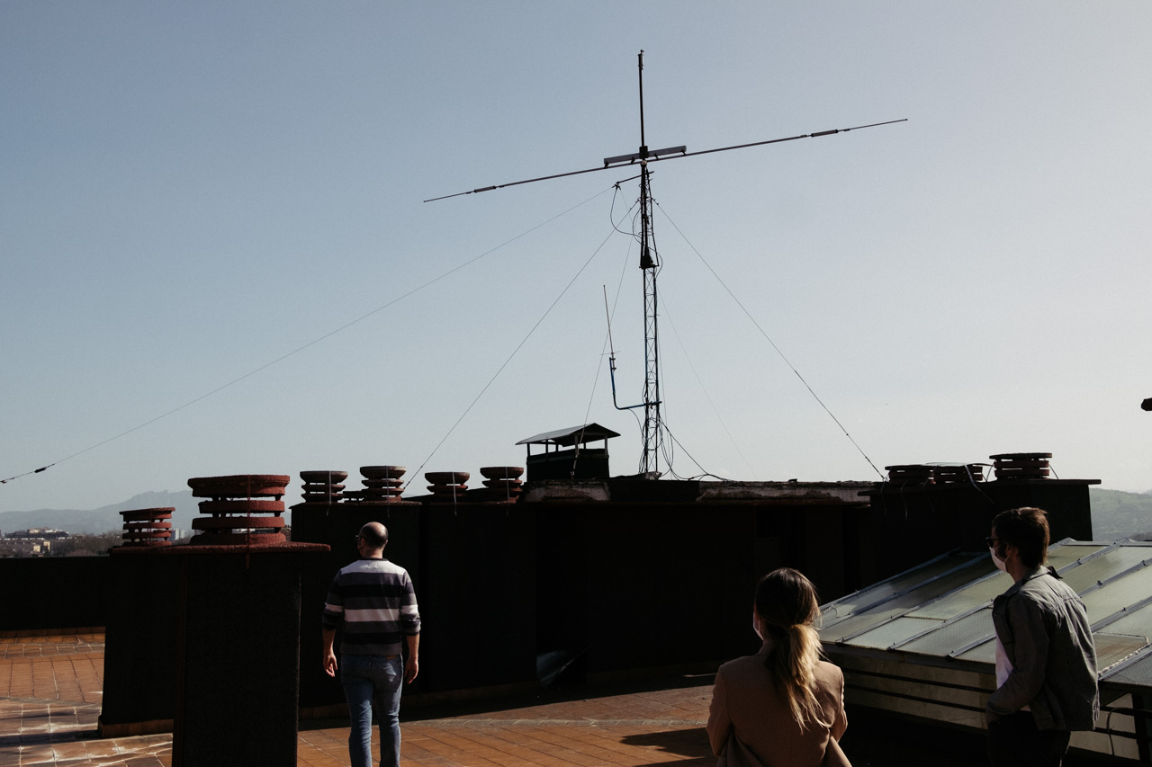 Una vez superada la planta 19, la del fallido restaurante-mirador, llegamos a la cumbre. Se abre la puerta. El viento sopla con fuerza y prueba de ello son los cascotes de un tejado que se esparcen por una enorme terraza donde reina la sobriedad. Varias chimeneas, el techo de cristal del patio interior y una antena con forma de ele son sus únicos habitantes. “De vez en cuando vienen algunos vecinos a tomar el sol”, apunta Mújica. Un murete de seguridad de más de metro y medio rodea la azotea, lo que impide disfrutar al completo de la experiencia visual como si fuera una pantalla circular de 360 grados. Hay que asomarse al borde, por ejemplo, para poder imaginar cómo se veían desde aquí los partidos de la Real en el antiguo campo de Atotxa. Se cumple a rajatabla el famoso hándicap: la grada sur tapaba la vista de aquellos que subían para ver jugar a su equipo.