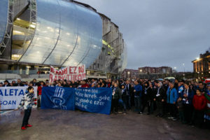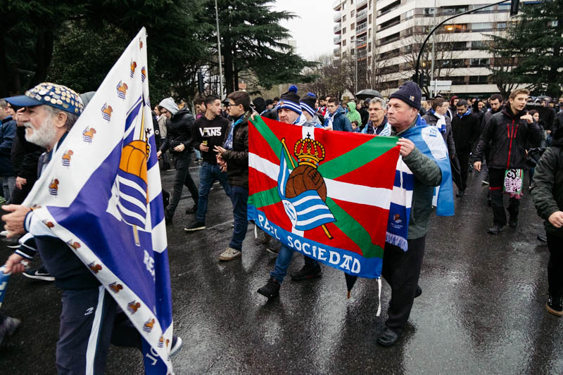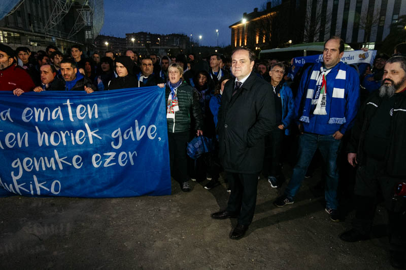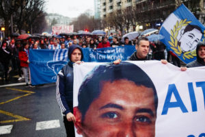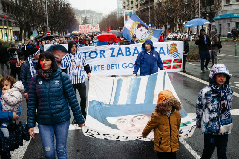 Aficionados al fútbol, seguidores de la Real Sociedad, familia, amigos… han sido muchos los que hoy han marchado desde el Centro hasta Anoeta en nombre de Aitor Zabaleta cuando se cumplen 20 años de su asesinato en el Vicente Calderón. La marcha ha terminado en el monolito de Anoeta, donde también el presidente del club, Jokin Aperribay, ha participado en la ofrenda floral. Además los jugadores han saltado al campo con una camiseta en su memoria.