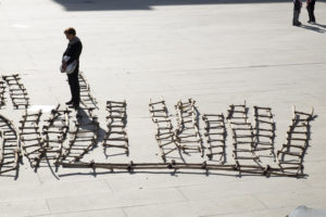 La obra ‘Muga’ llega a la Bienal de la mano de la Escuela de Arquitectura de Toledo y de la Escuela Técnica Superior de Arquitectura de la UPV/EHU, cuyos estudiantes se han encargado de la instalación a lo largo de este viernes. La instalación permanecerá en la Plaza Zuloaga hasta mediados de noviembre.