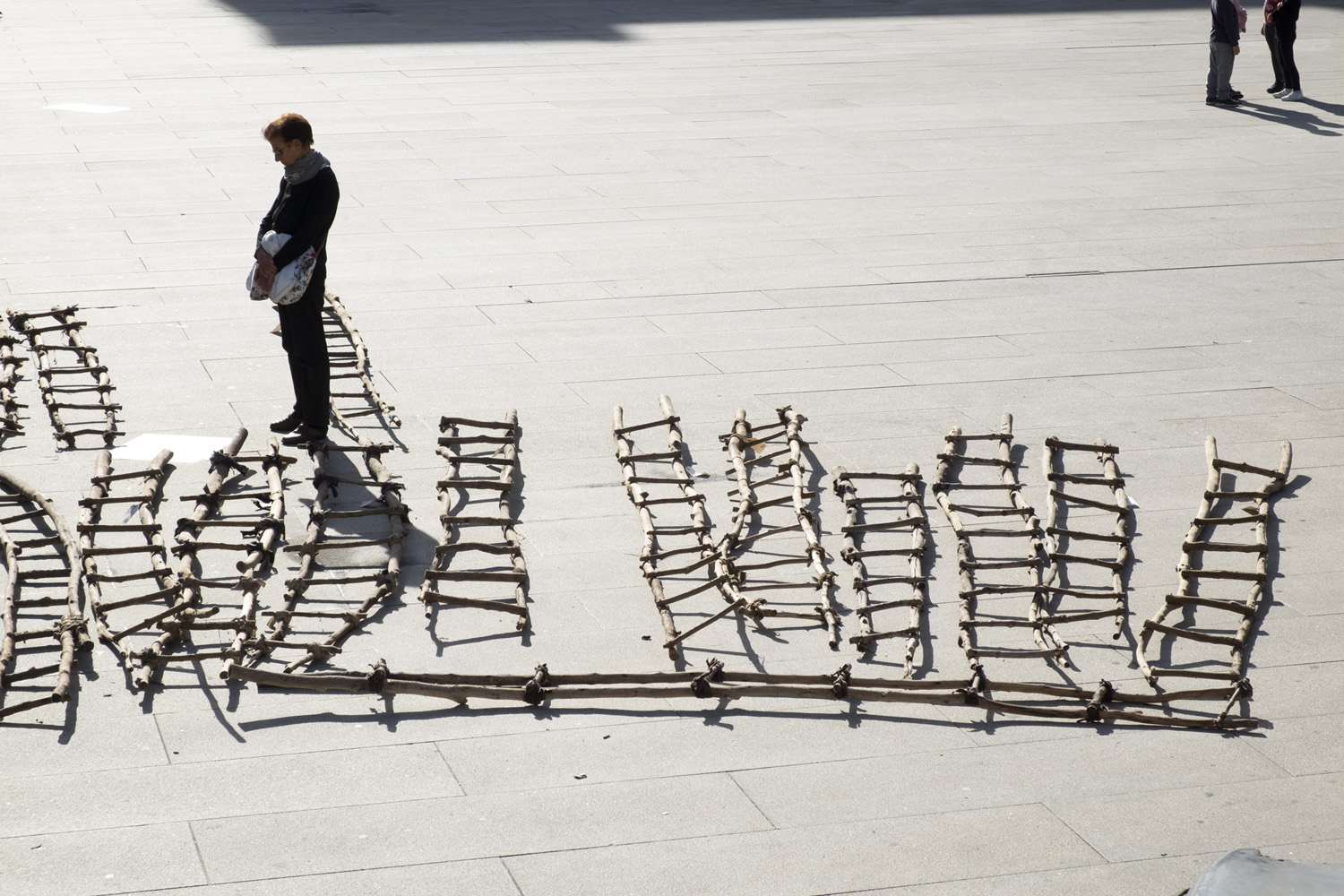 La Bienal MUGAK ha culminado hoy la ‘Semana de las Escuelas de Arquitectura’ con dos instalaciones que se fijan en las fronteras desde perspectivas diferentes. Por un lado en plena fachada de San Telmo Museoa se ha colocado cerca de un centenar de escaleras construidas por personas migrantes que las utilizaron para saltar la valla de Melilla, obra del artista Fernando Clavería. Por otro, la plaza de la Trinidad, se ha inaugurado la intervención escultórica ‘islas Hub’, obra del artista Juan Aizpitarte, metáfora de la convivencia social relacionada con la isla fronteriza habitada más pequeña del mundo, ubicada entre EE UU y Canadá.