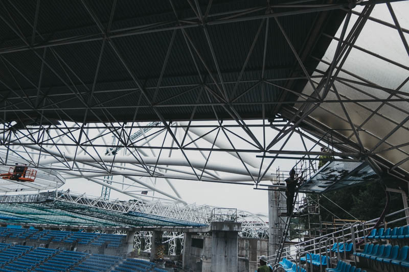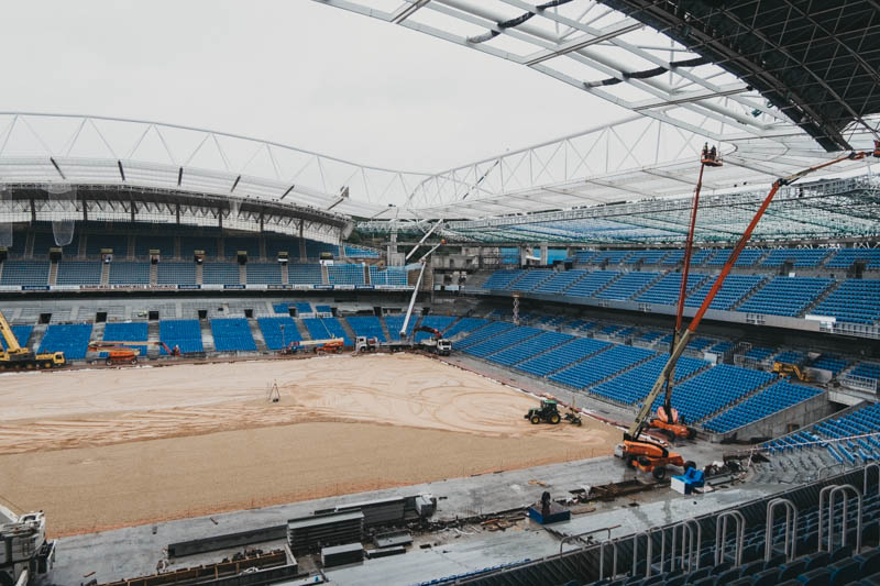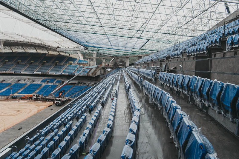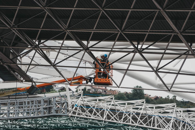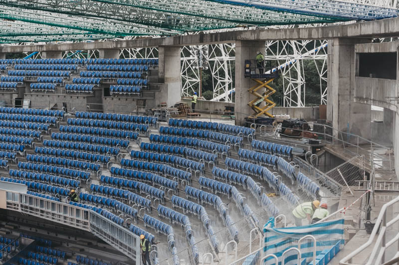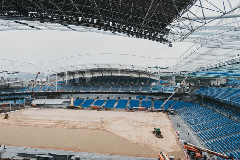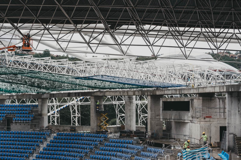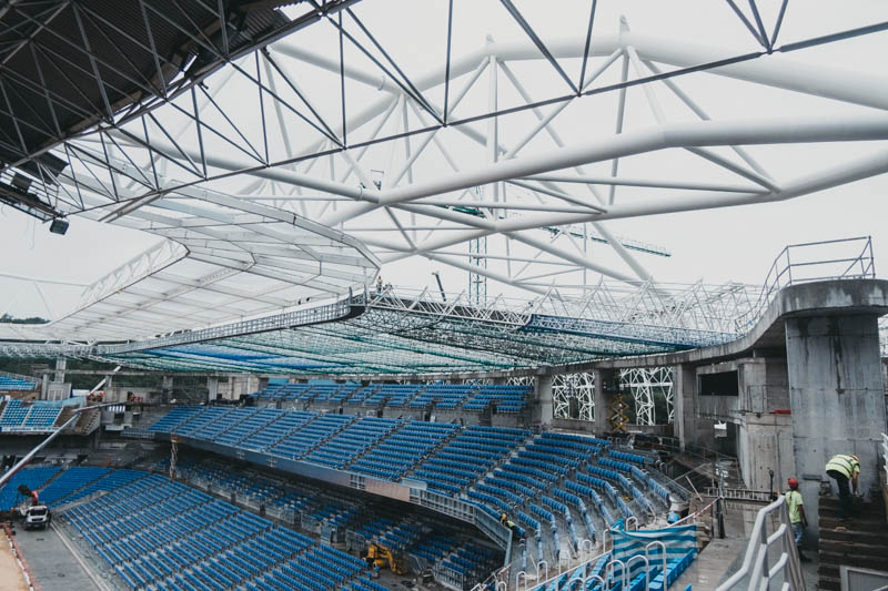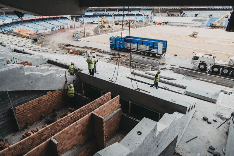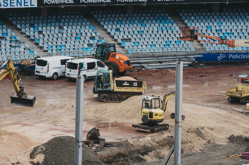 Ahora se está rematando el fondo sur, se han colocado las cerchas que servirán para soportar la nueva cubierta y se ha rebajado en un metro y medio la cota del campo, en el que aún no se ha colocado el césped. Al nuevo campo le queda aún derribo y construcción del fondo norte así como toda la remodelación interior de sus instalaciones.