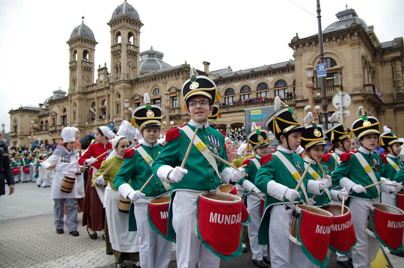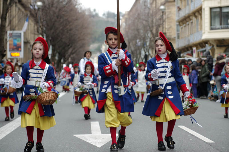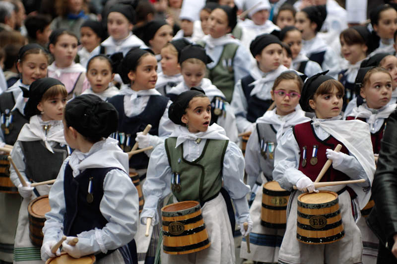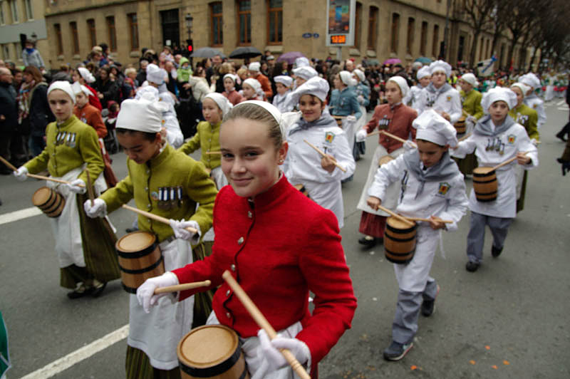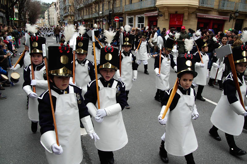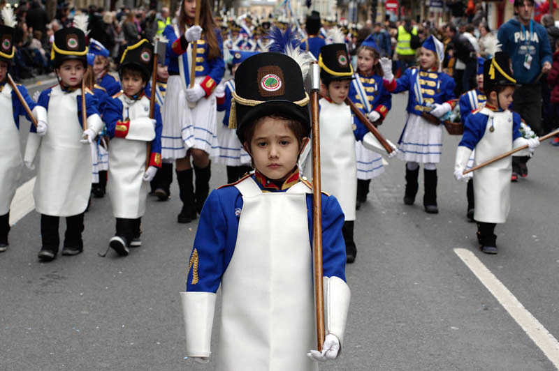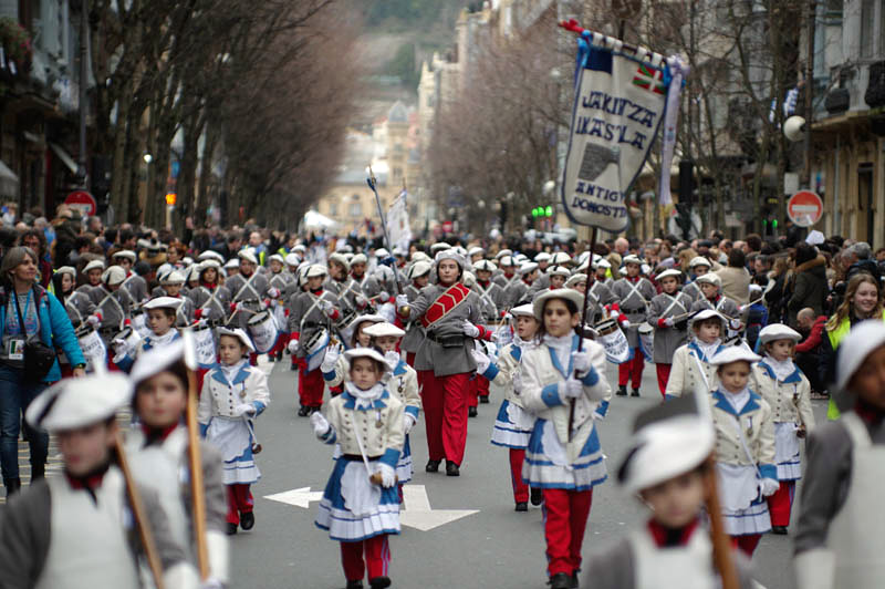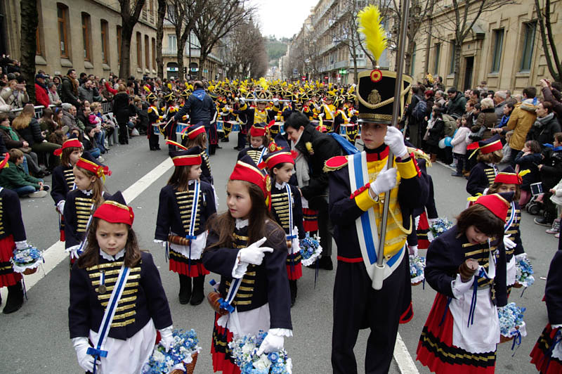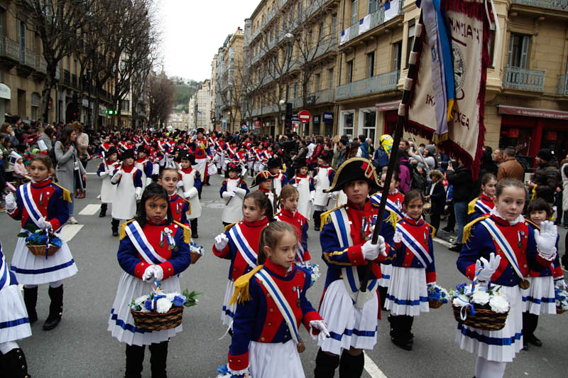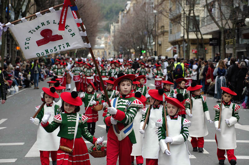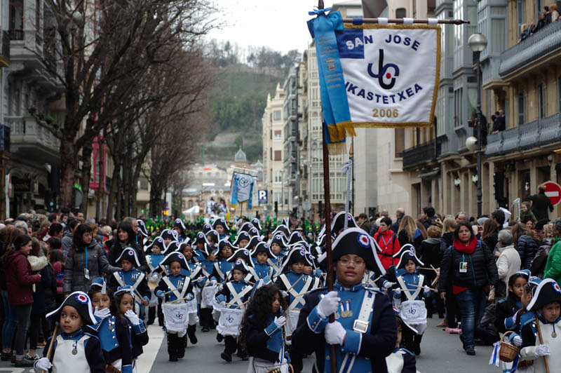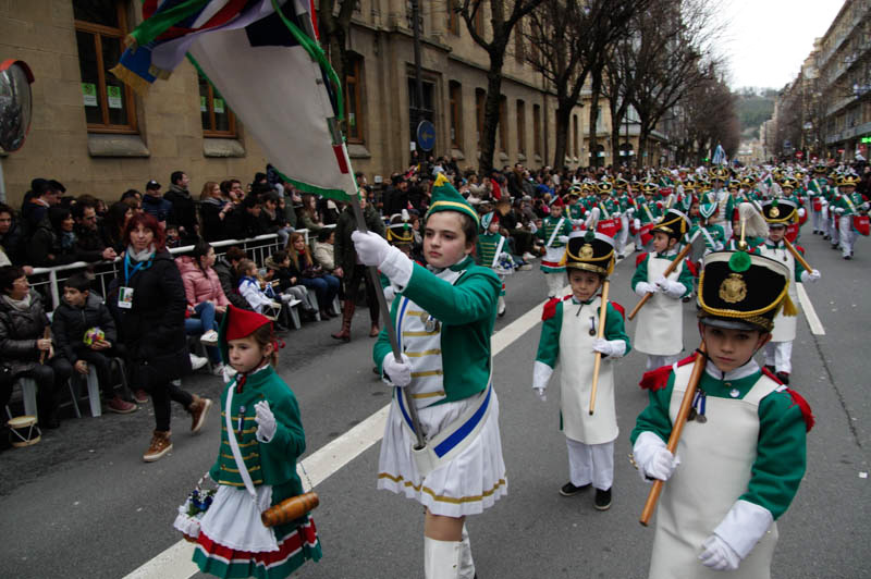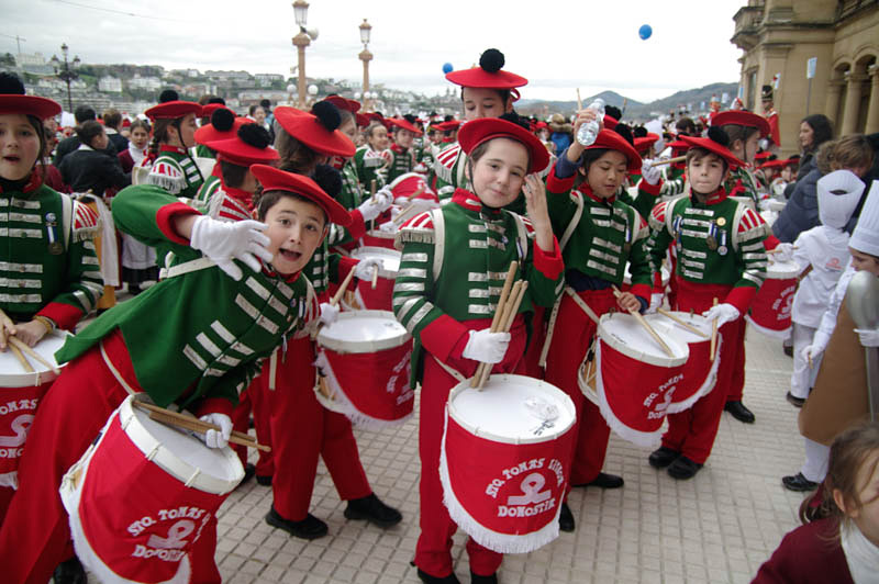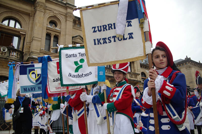 Cinco mil pequeños donostiarras han desfilado en sus compañías, cada cual con su colegio, desde las doce del mediodía. Con puntualidad. El Santo se ha portado y no ha querido aguar la fiesta. Distinto va a ser con la Arriada.