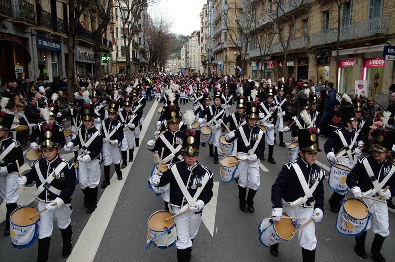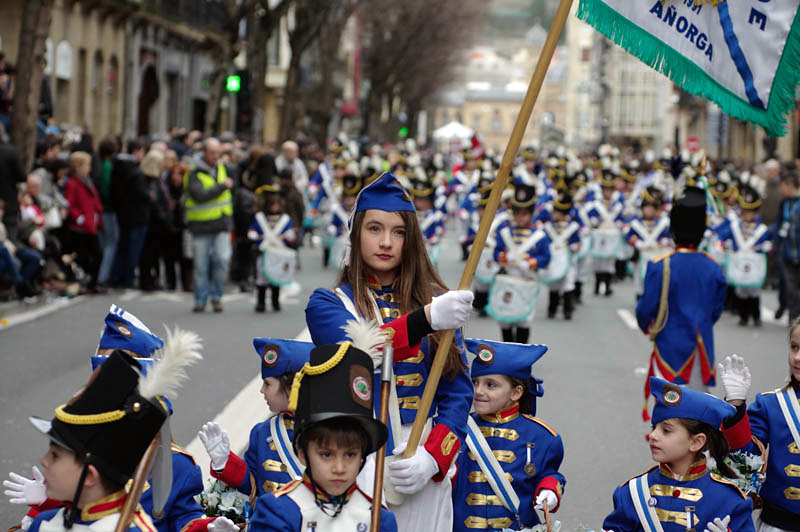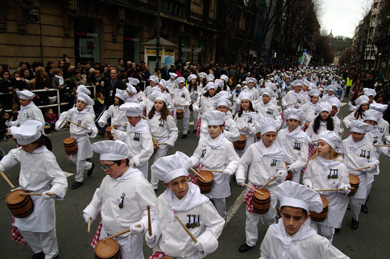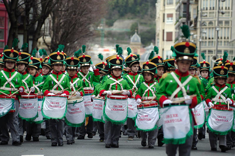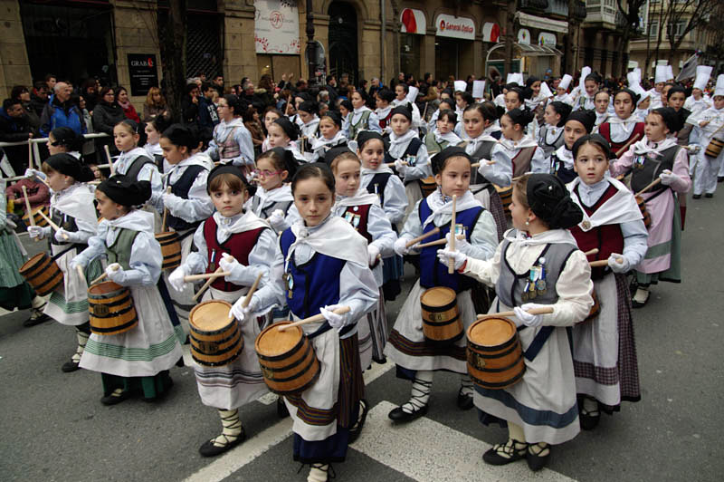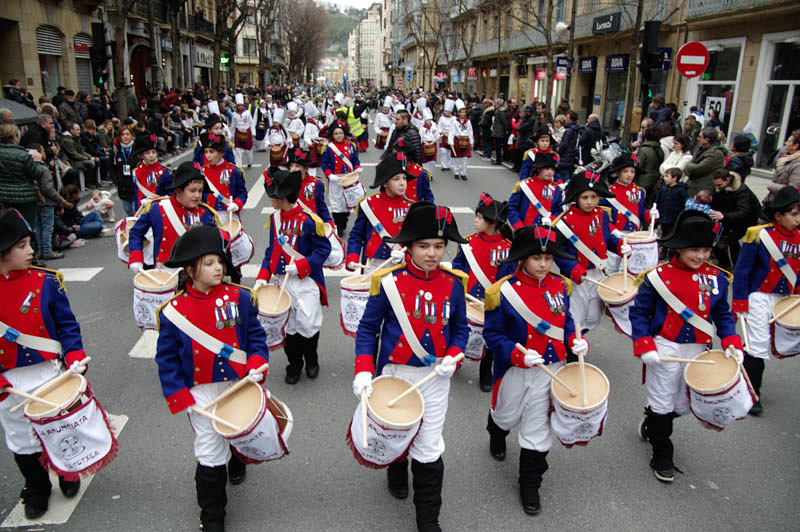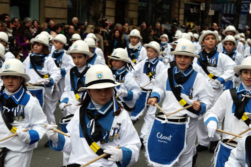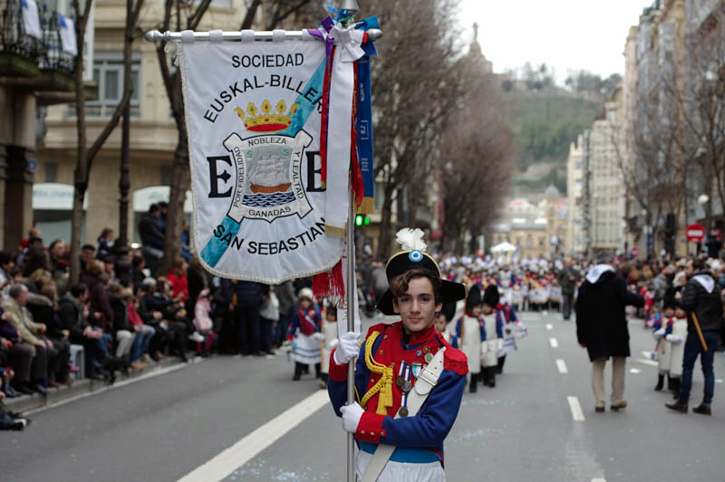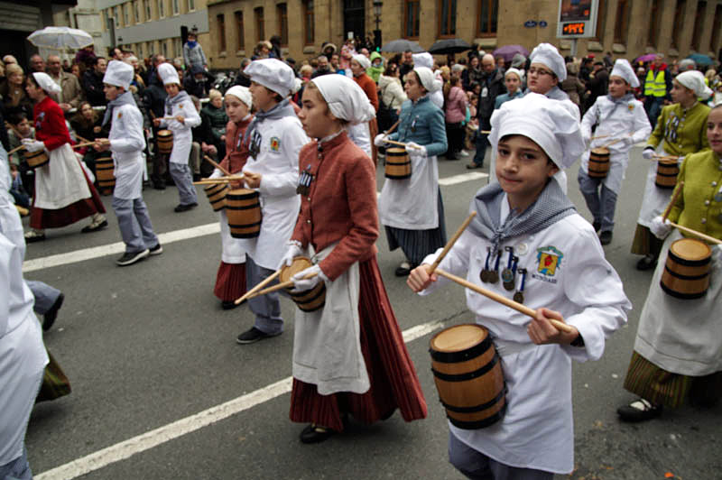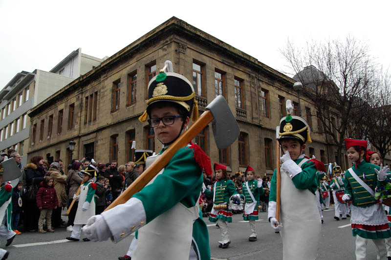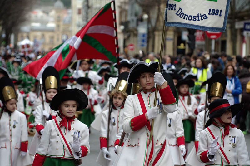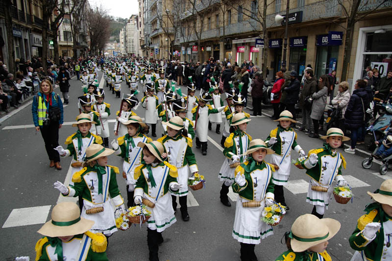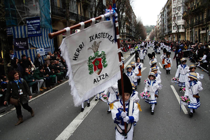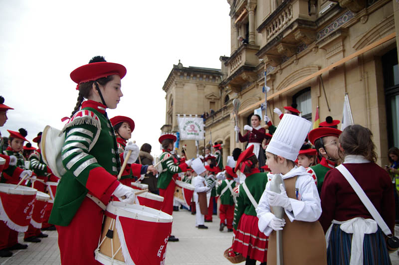 Cinco mil pequeños donostiarras han desfilado en sus compañías, cada cual con su colegio, desde las doce del mediodía. Con puntualidad. El Santo se ha portado y no ha querido aguar la fiesta. Distinto va a ser con la Arriada.