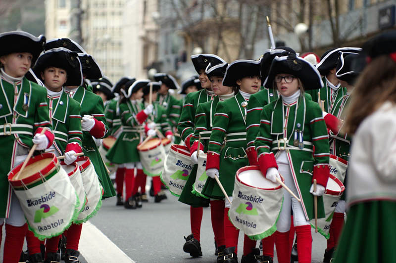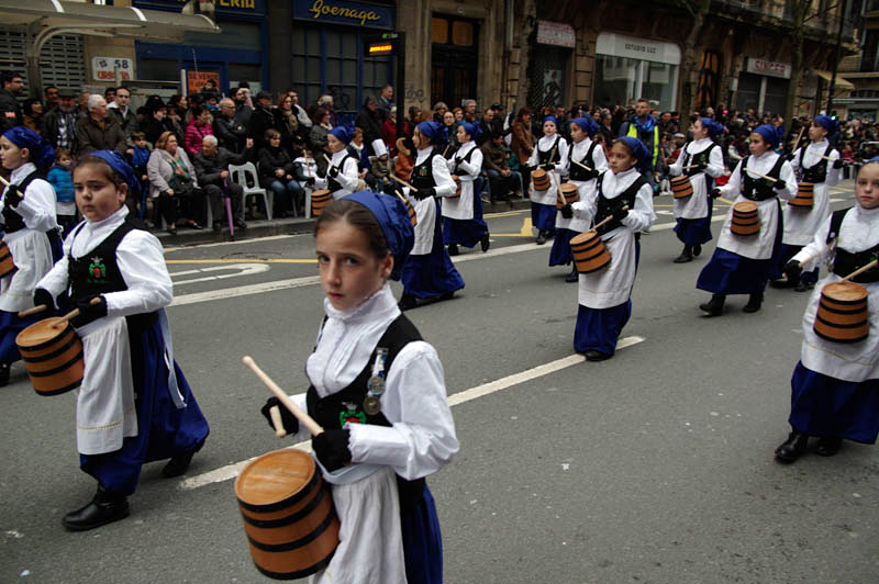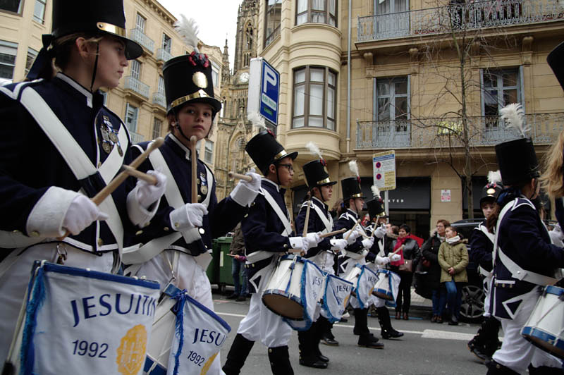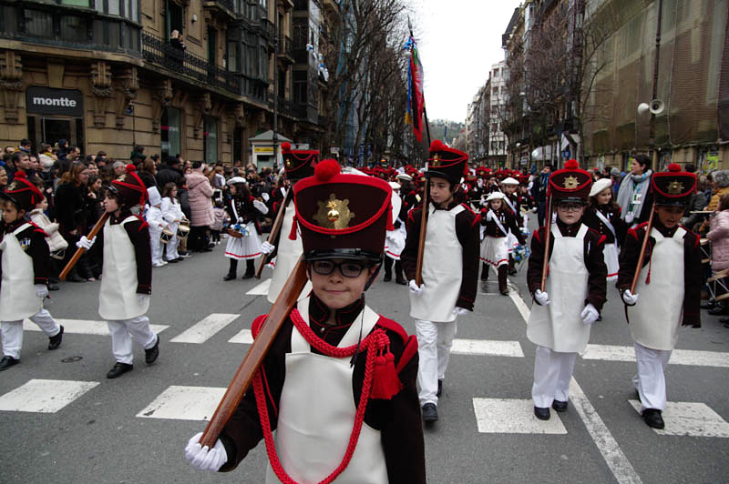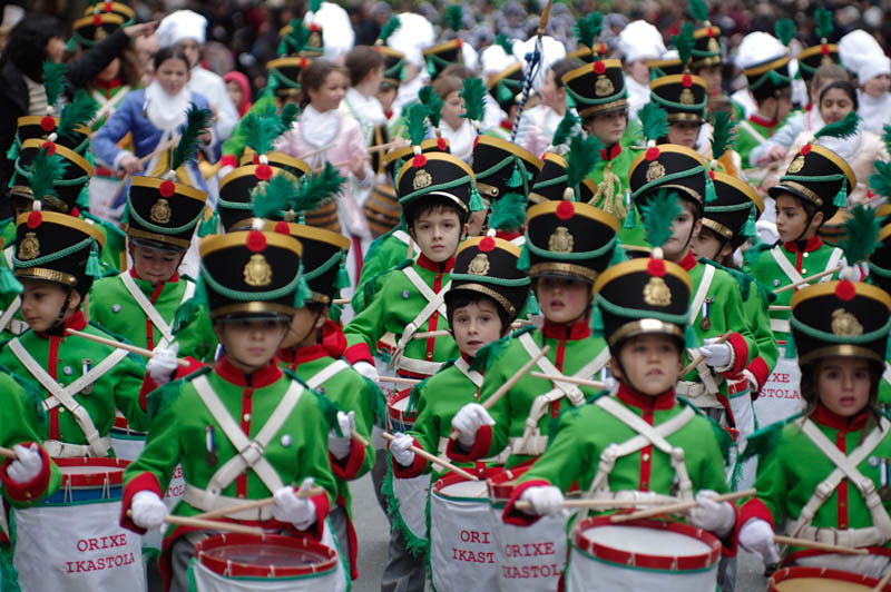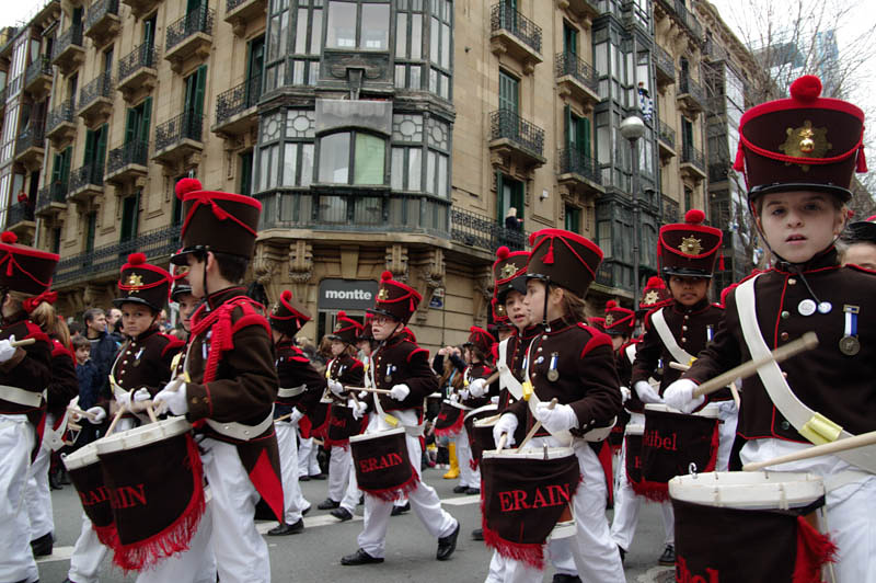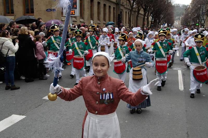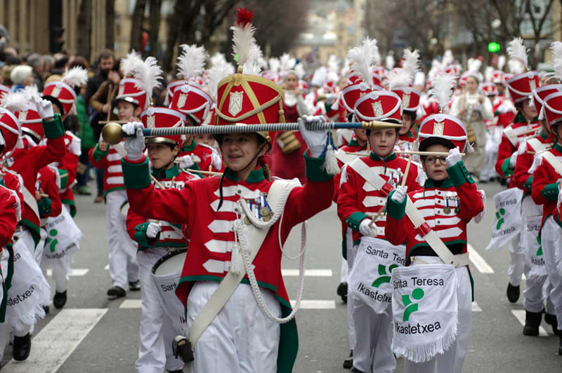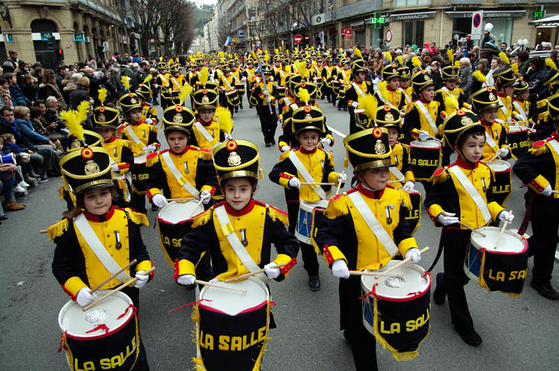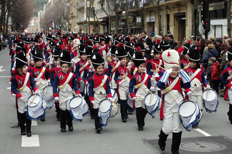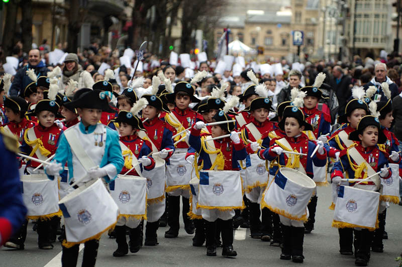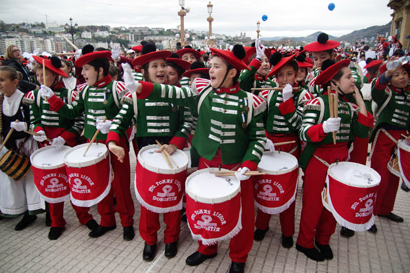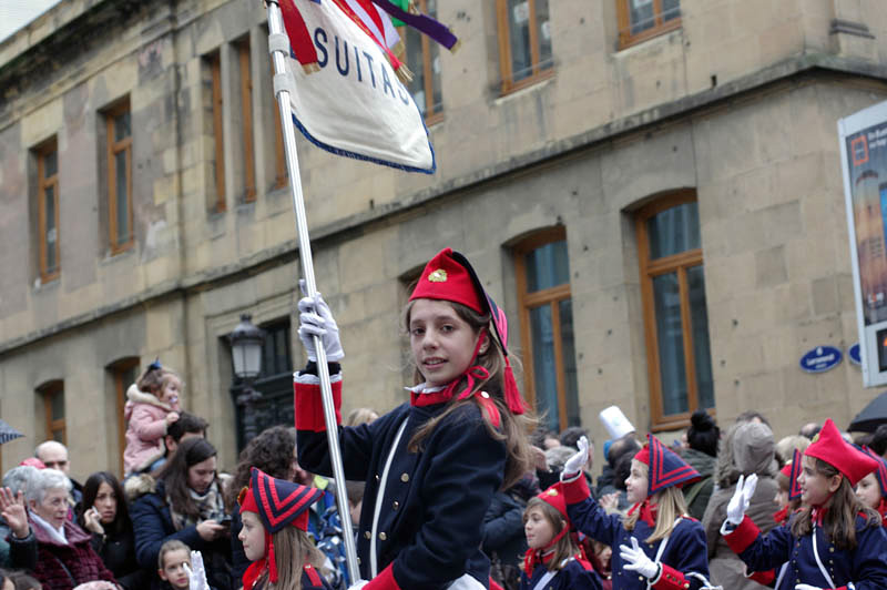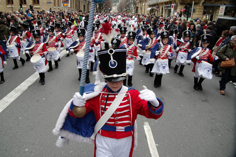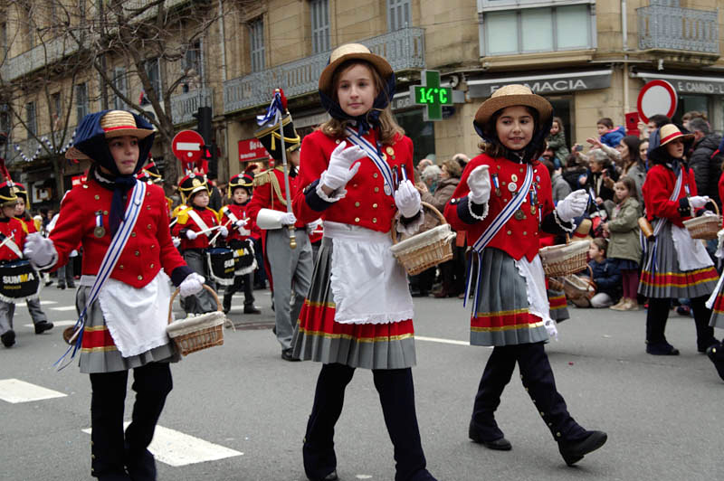 Cinco mil pequeños donostiarras han desfilado en sus compañías, cada cual con su colegio, desde las doce del mediodía. Con puntualidad. El Santo se ha portado y no ha querido aguar la fiesta. Distinto va a ser con la Arriada.