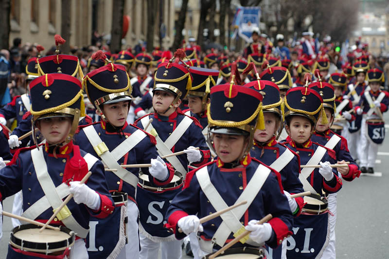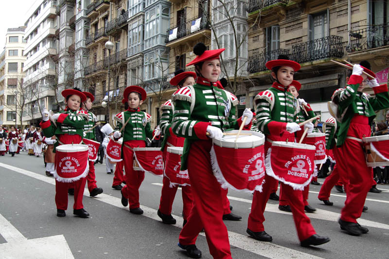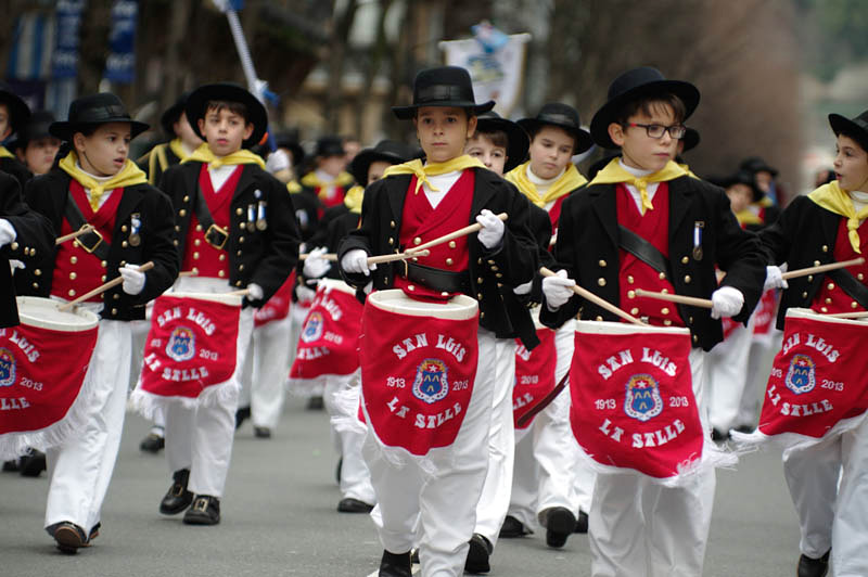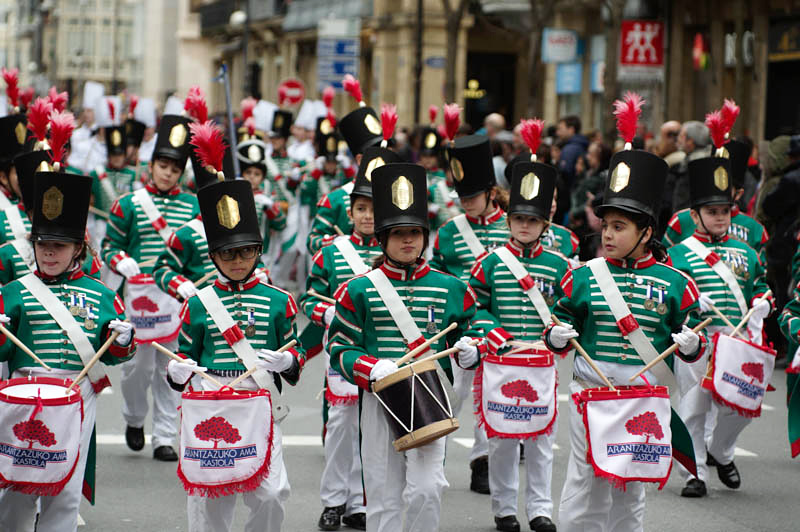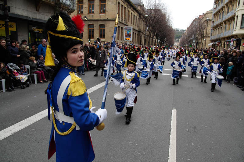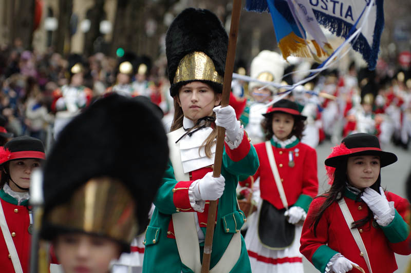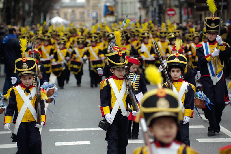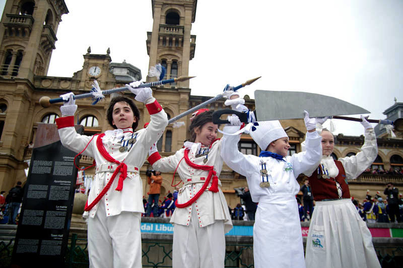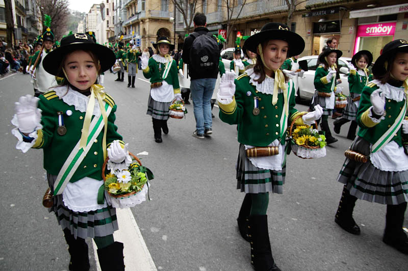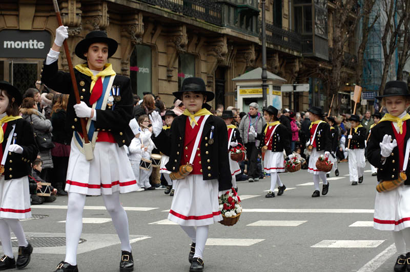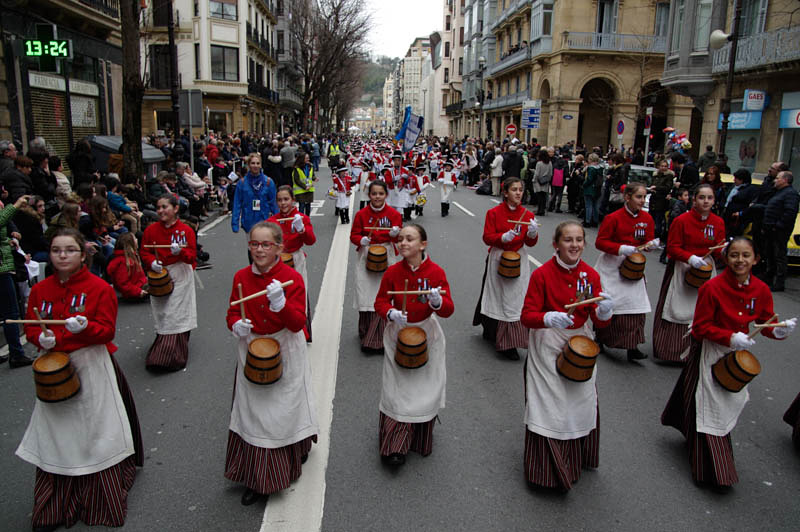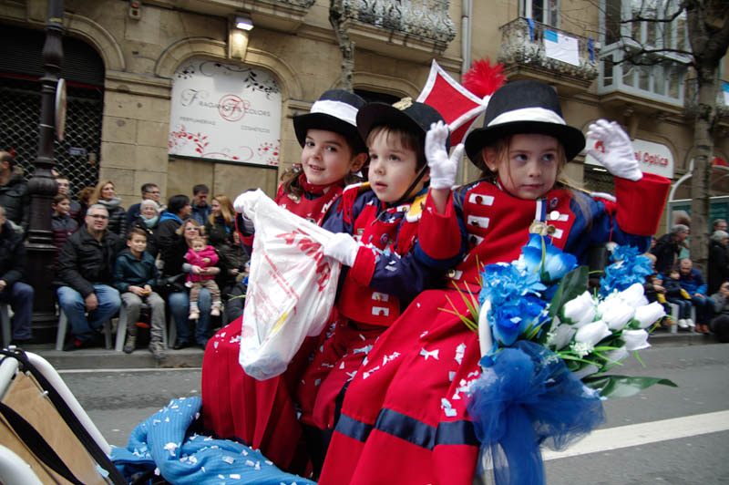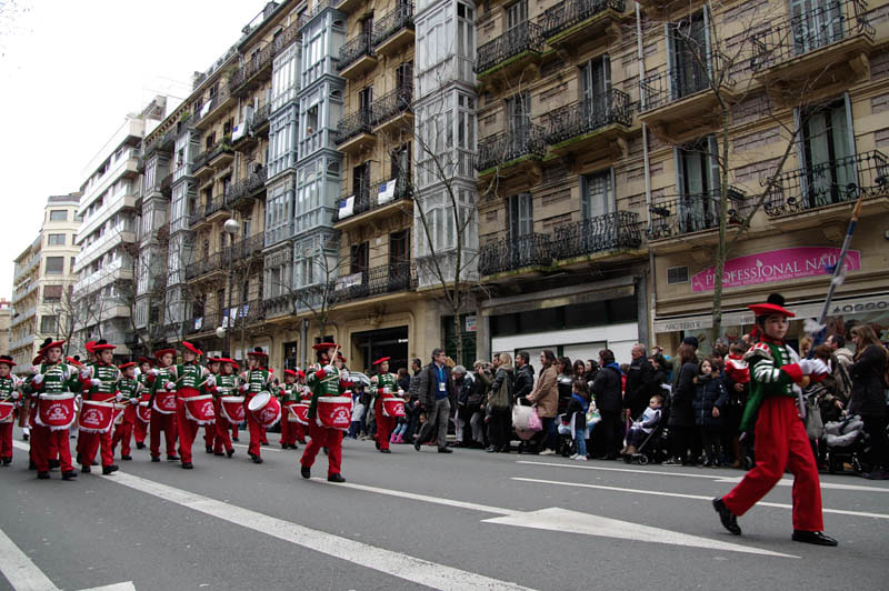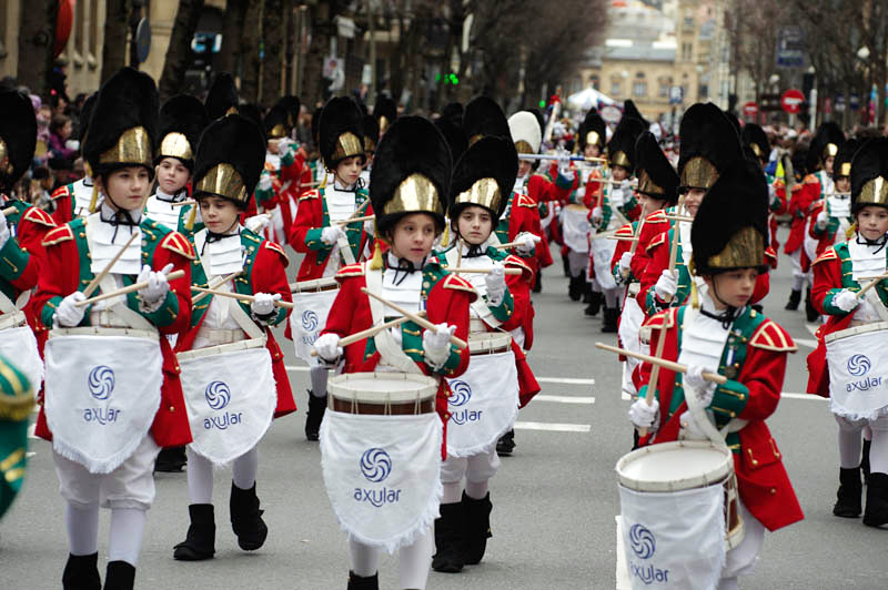 Cinco mil pequeños donostiarras han desfilado en sus compañías, cada cual con su colegio, desde las doce del mediodía. Con puntualidad. El Santo se ha portado y no ha querido aguar la fiesta. Distinto va a ser con la Arriada.