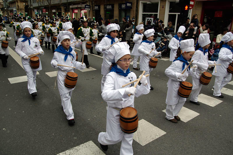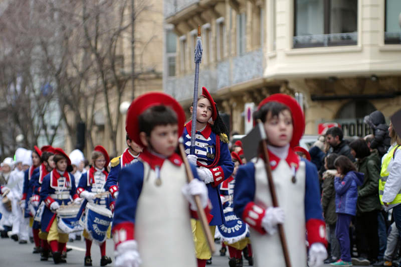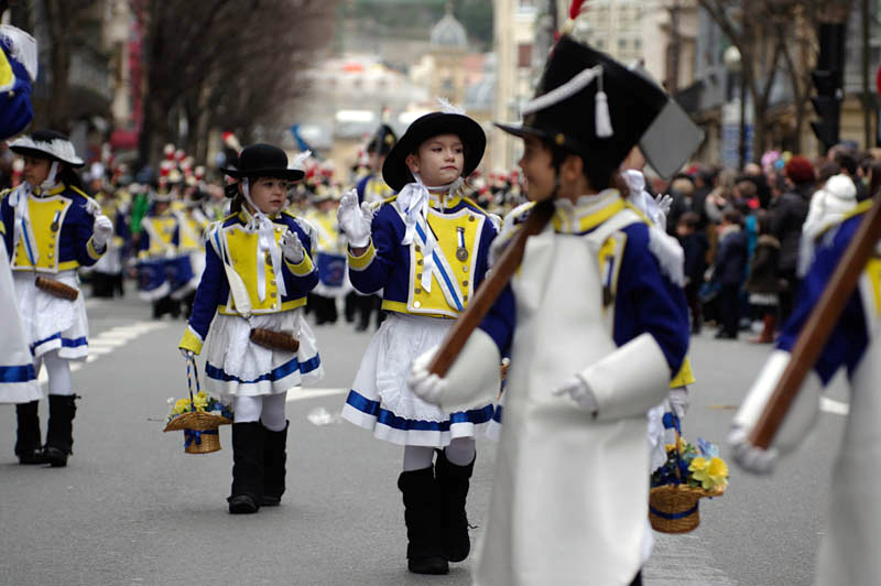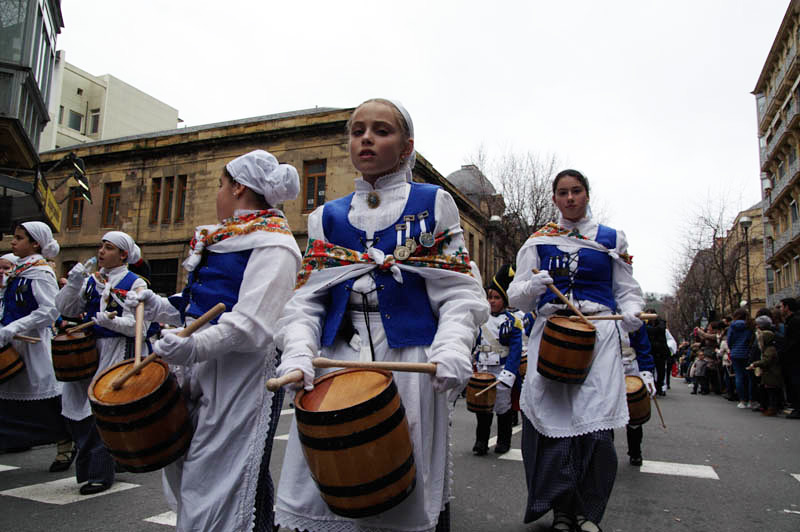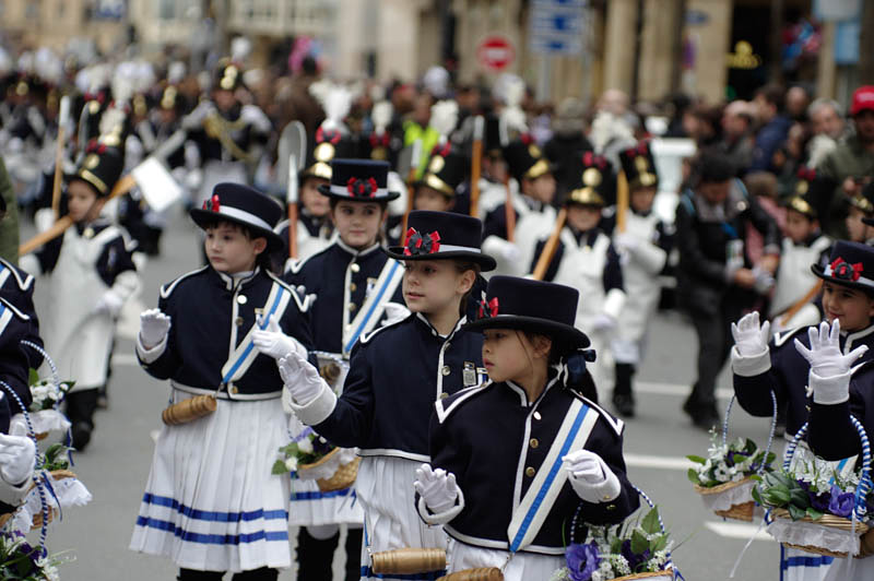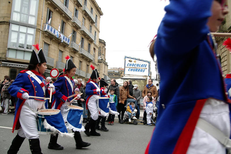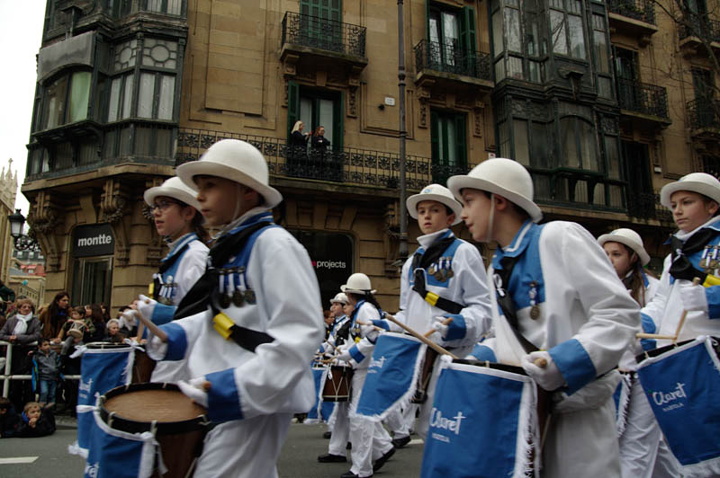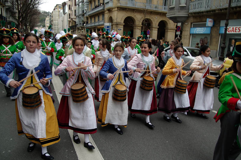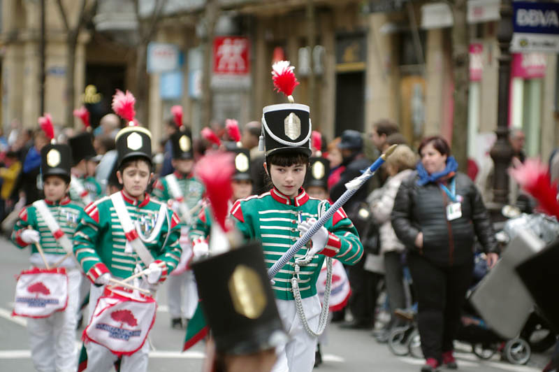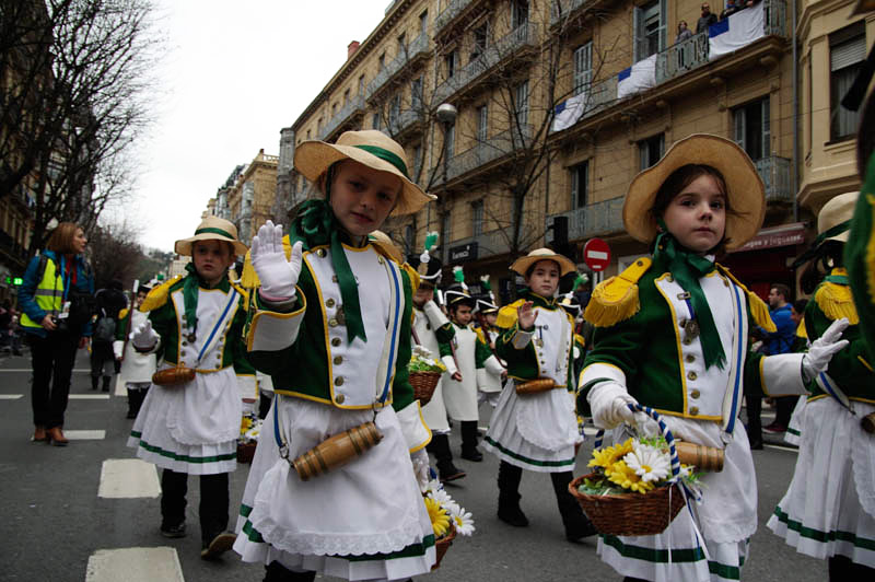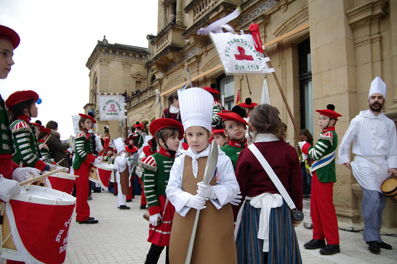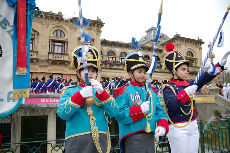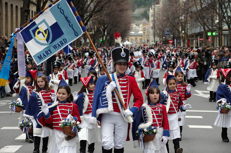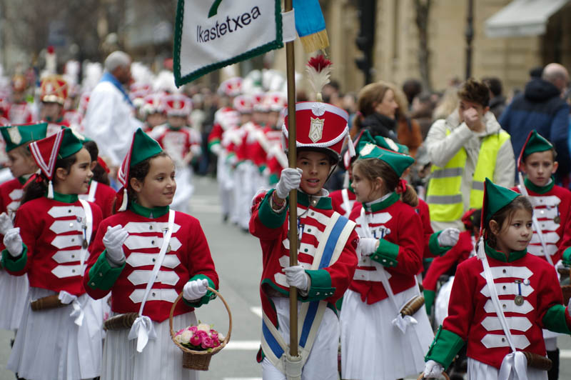 Cinco mil pequeños donostiarras han desfilado en sus compañías, cada cual con su colegio, desde las doce del mediodía. Con puntualidad. El Santo se ha portado y no ha querido aguar la fiesta. Distinto va a ser con la Arriada.