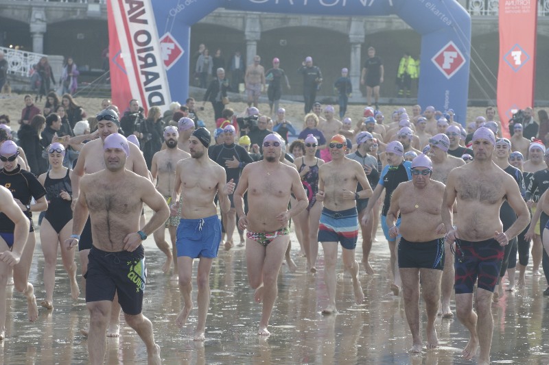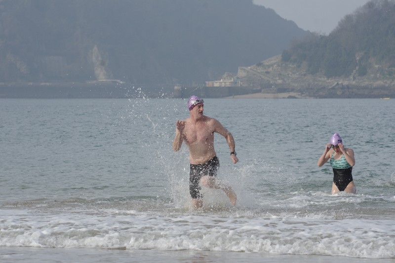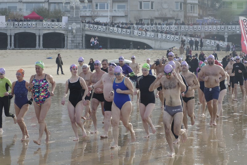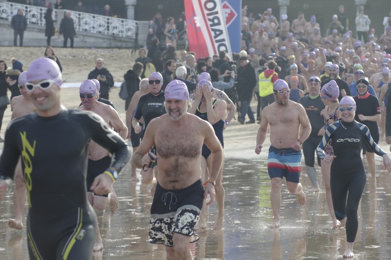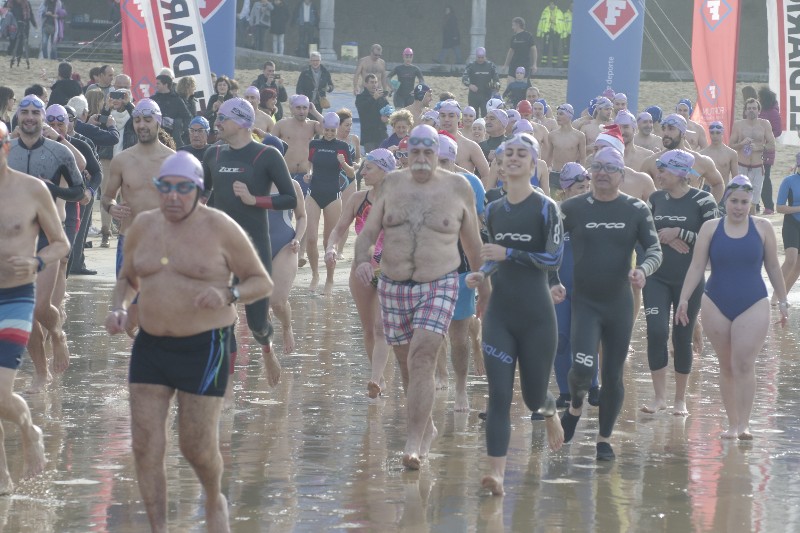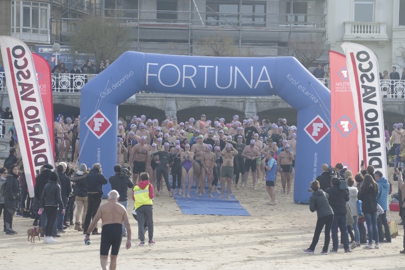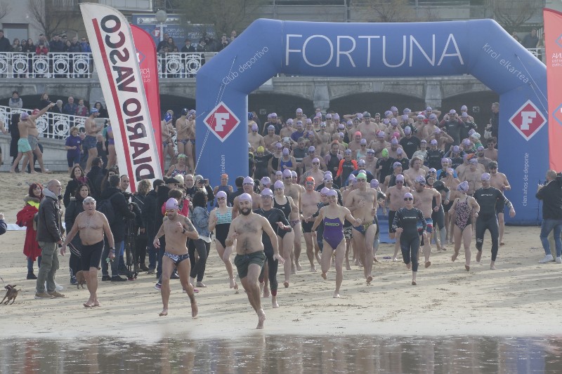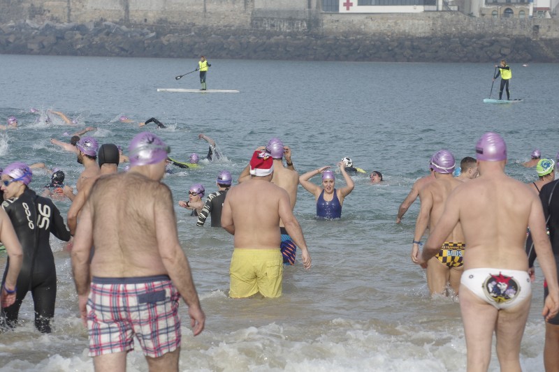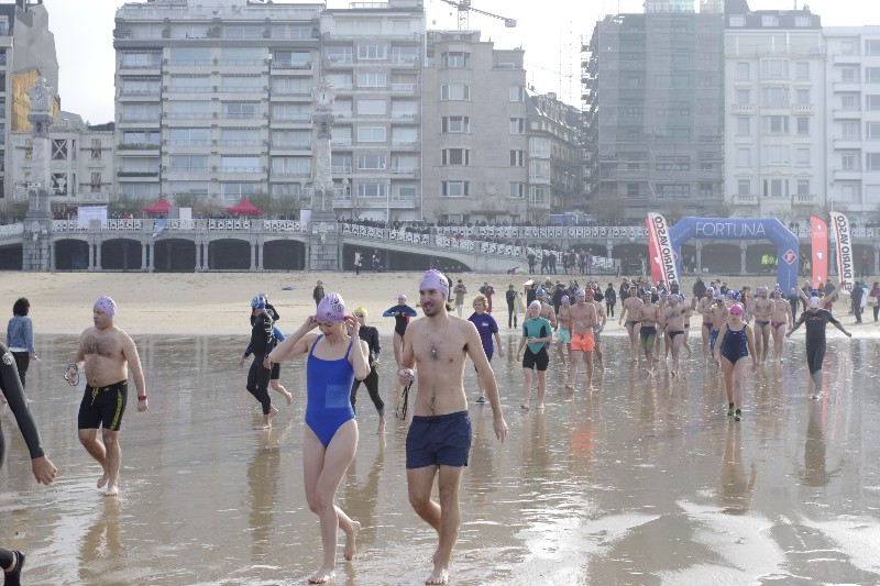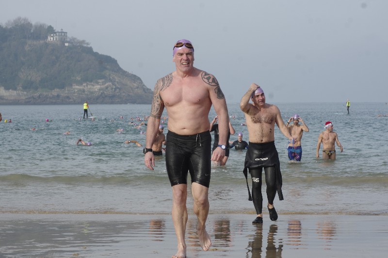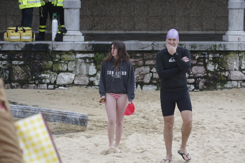 Los más valientes y también los más fieles a una cita que se repite y suma adeptos se han bañado hoy en la costa donostiarra como corresponde y con motivo del Kontxapuzón del CD Fortuna, que se ha celebrado este mediodía, Día de Navidad, en una jornada con luz pero fresca.