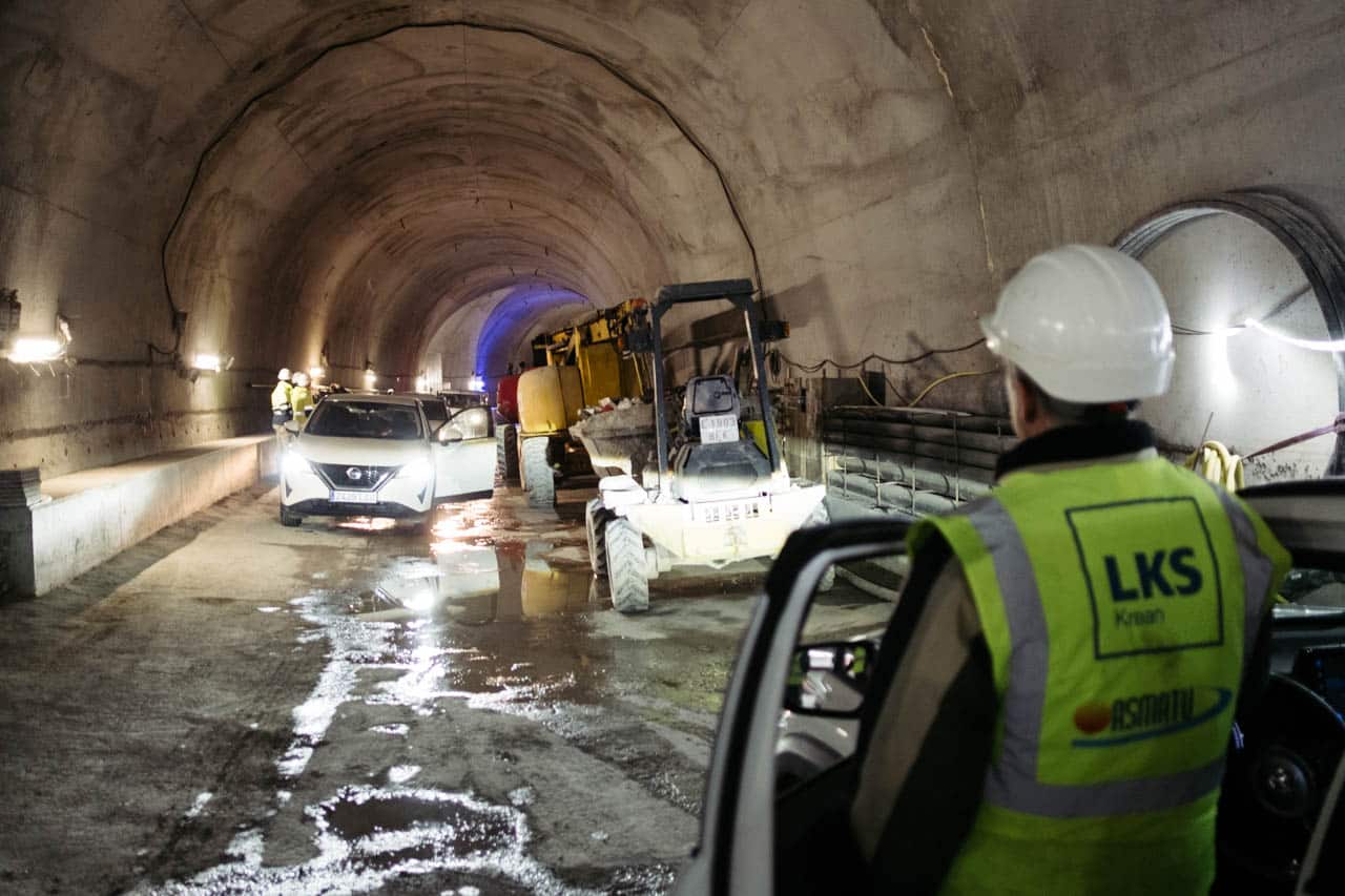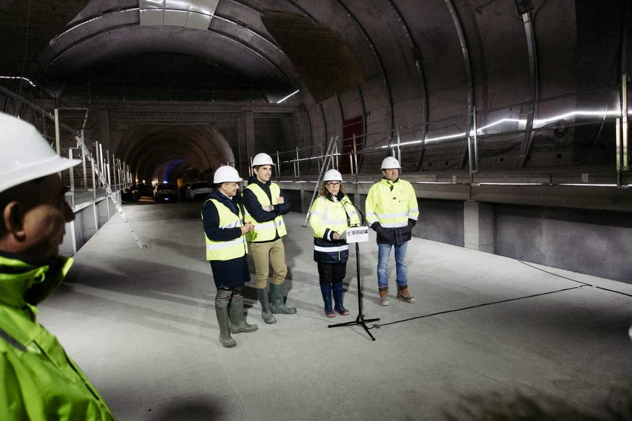 La consejera de Movilidad Sostenible, Susana García Chueca, acompañada del alcalde de Donostia, Jon Insausti, del viceconsejero de Infraestructuras y Movilidad Sostenible, Miguel Ángel Páez, y del director general de ETS, Antonio López, ha visitado este lunes el interior de la caverna para conocer de primera mano la situación del tajo.