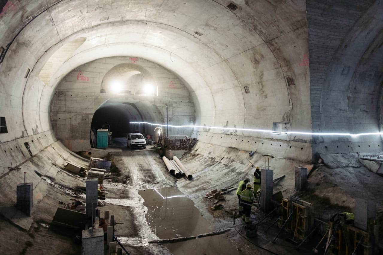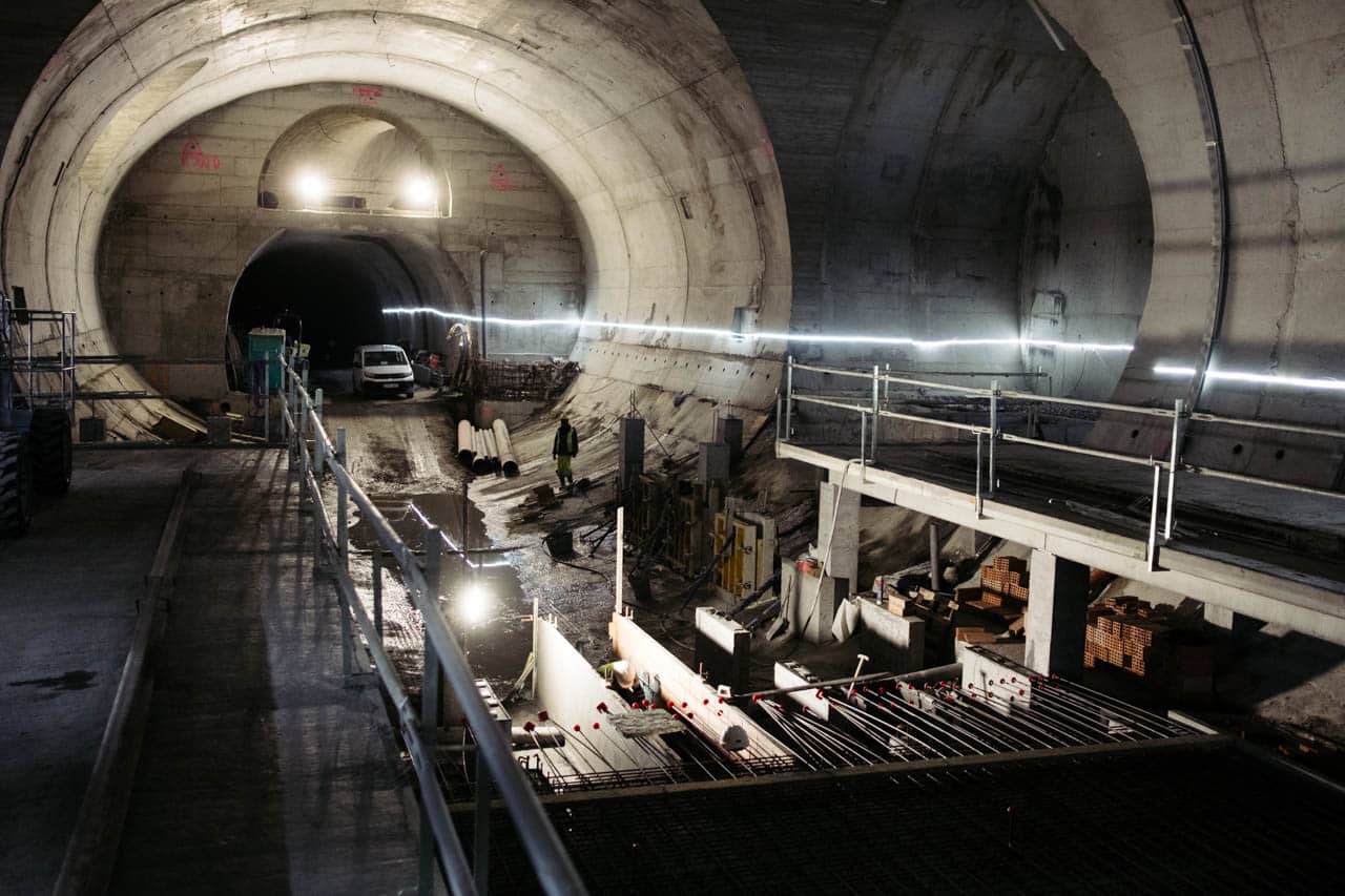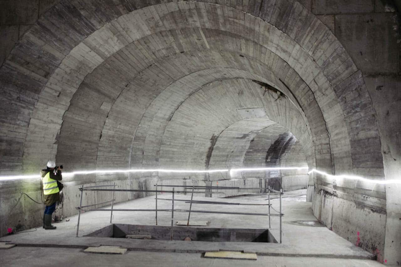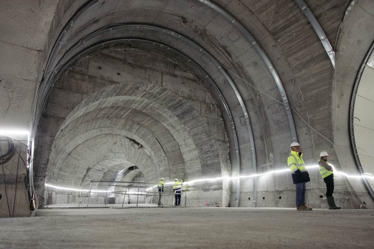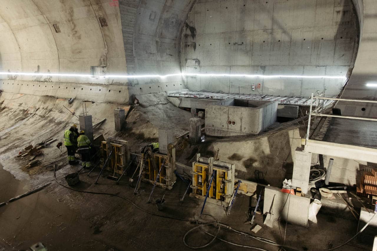Con la caverna prácticamente abierta -casi como una sección de una infografía-, es posible apreciar las distintas partes que componen una estación en construcción. Desde uno de los andenes ya ejecutados, la comitiva ha podido observar los huecos destinados a canalizar el agua filtrada, las ventilaciones bajo andén y las comunicaciones e instalaciones propias de una infraestructura ferroviaria.