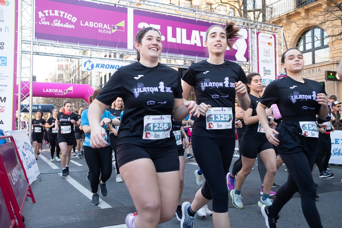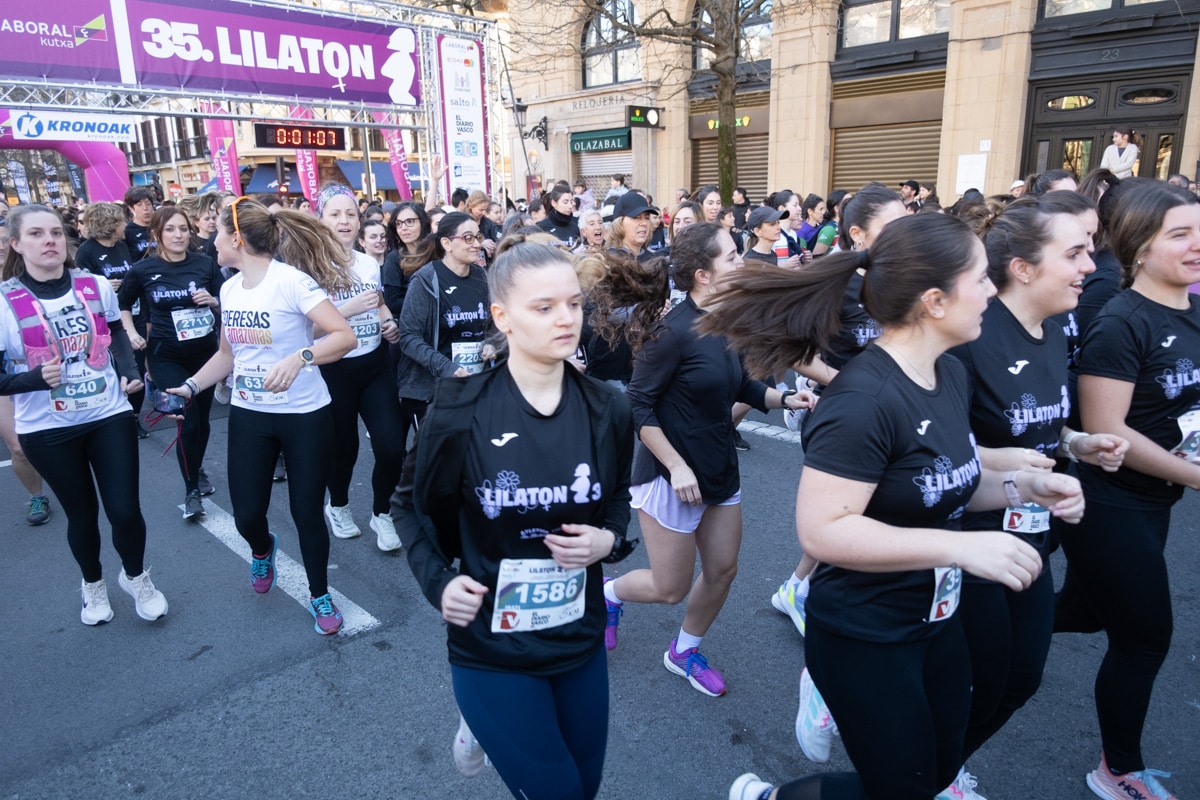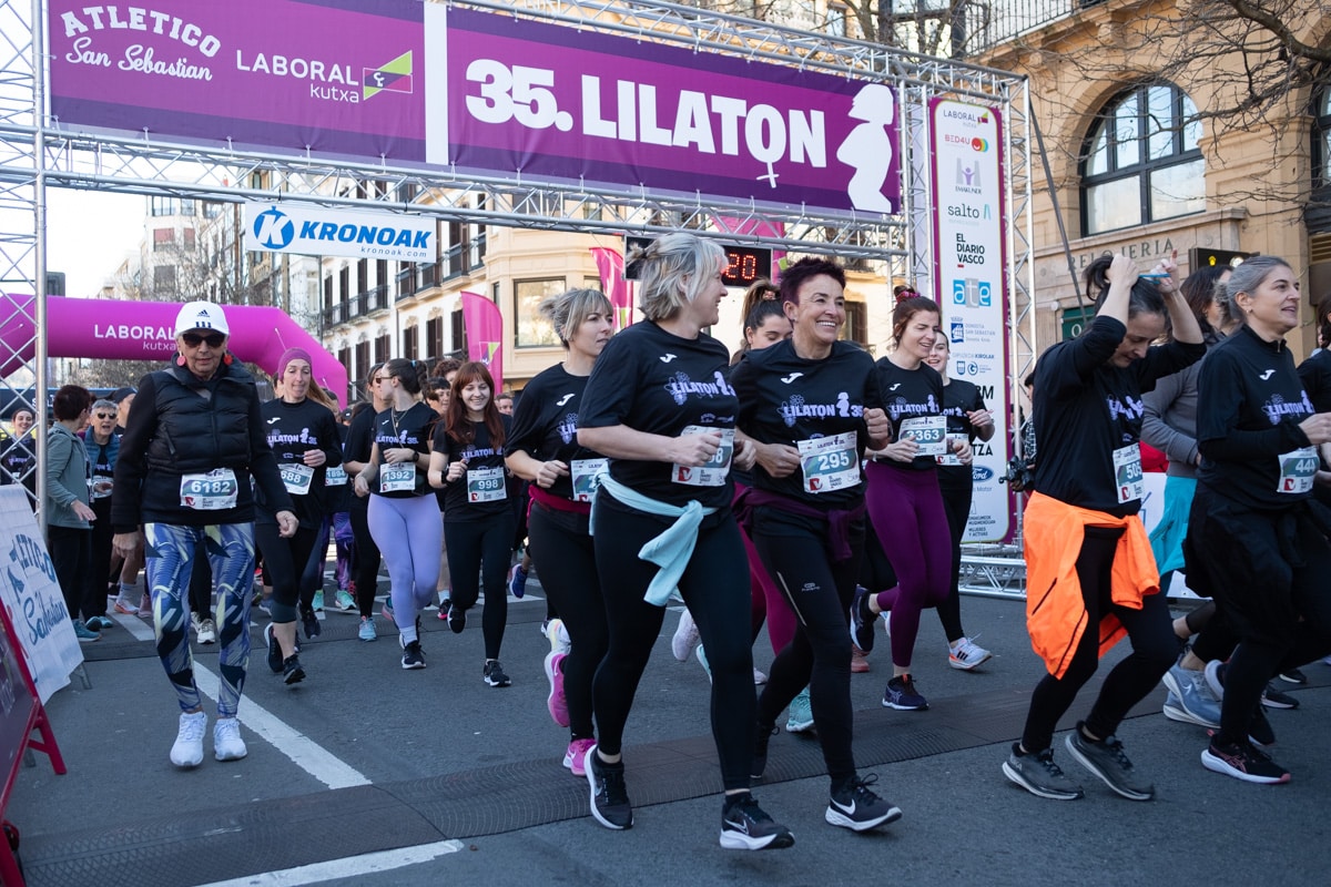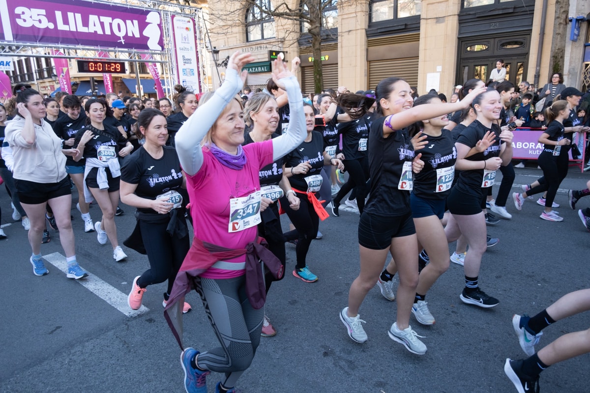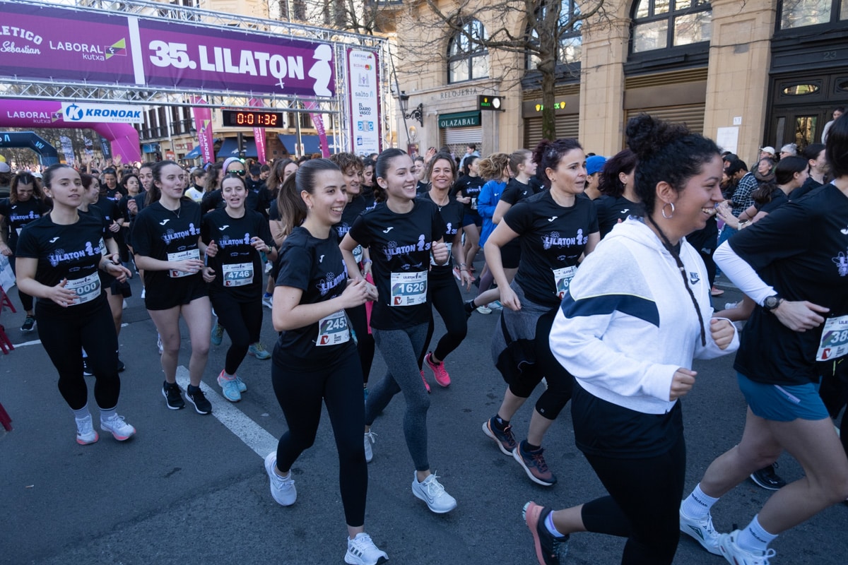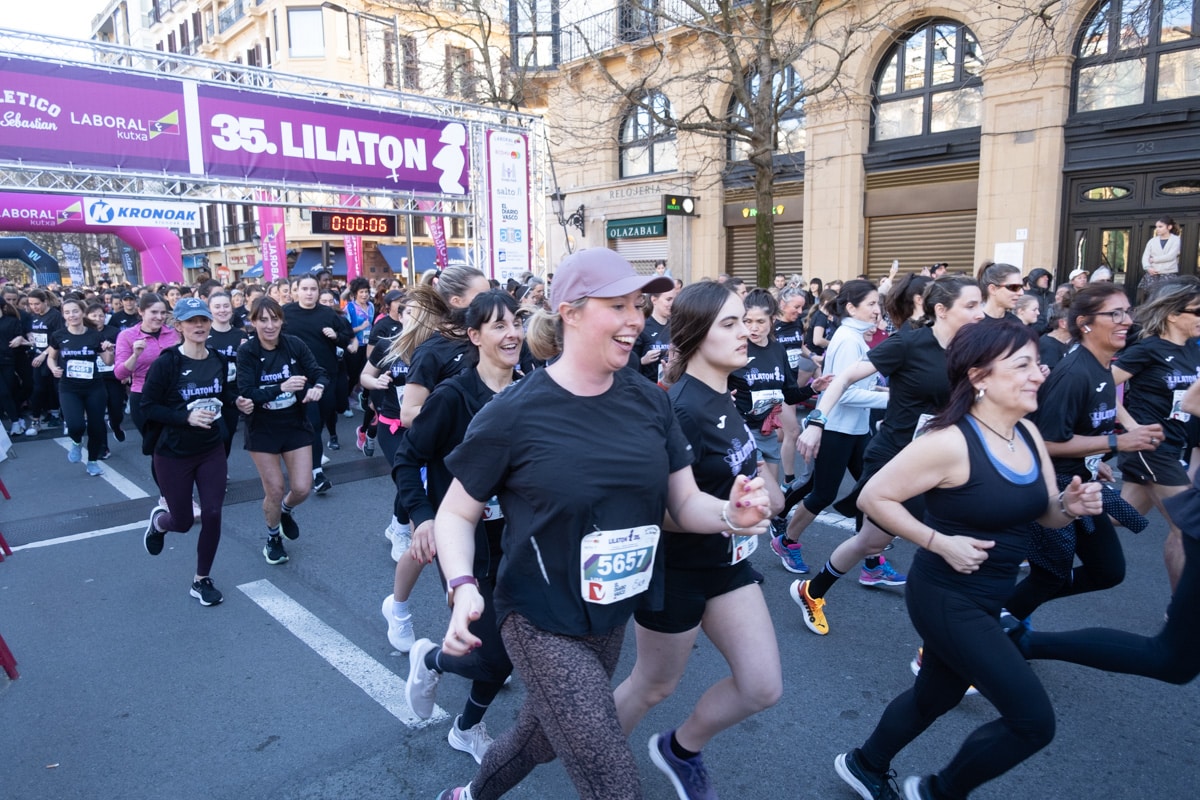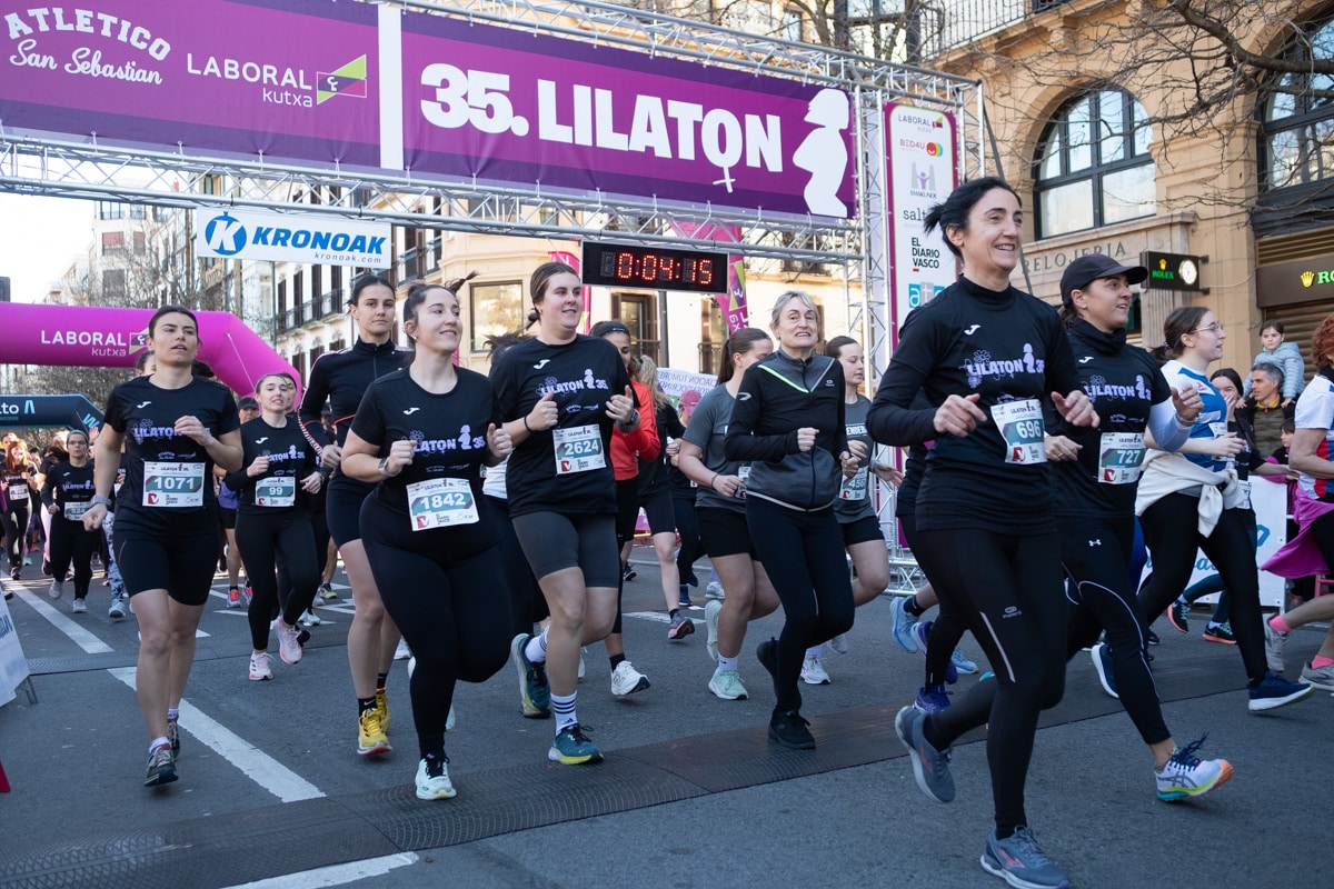 Ambientazo en una edición más, y van 35, de la Lilatón, la carrera femenina y feminista de 5 kilómetros del Club Deportivo Atlético de San Sebastian. Carrera solidaria, también, ya que un euro de cada inscripción será donado a la Asociación Contra el Cáncer de Gipuzkoa. La cita, en la que se habían inscrito 6.200 mujeres, ha comenzado con una sesión de zumba y terminará con el Lilapote.