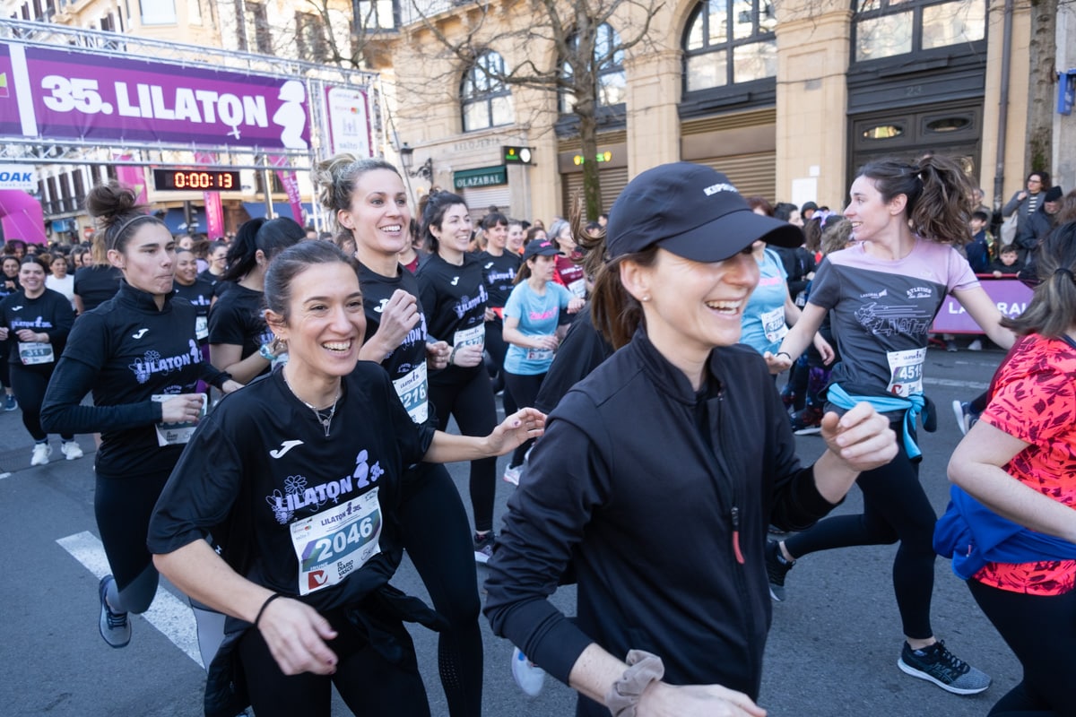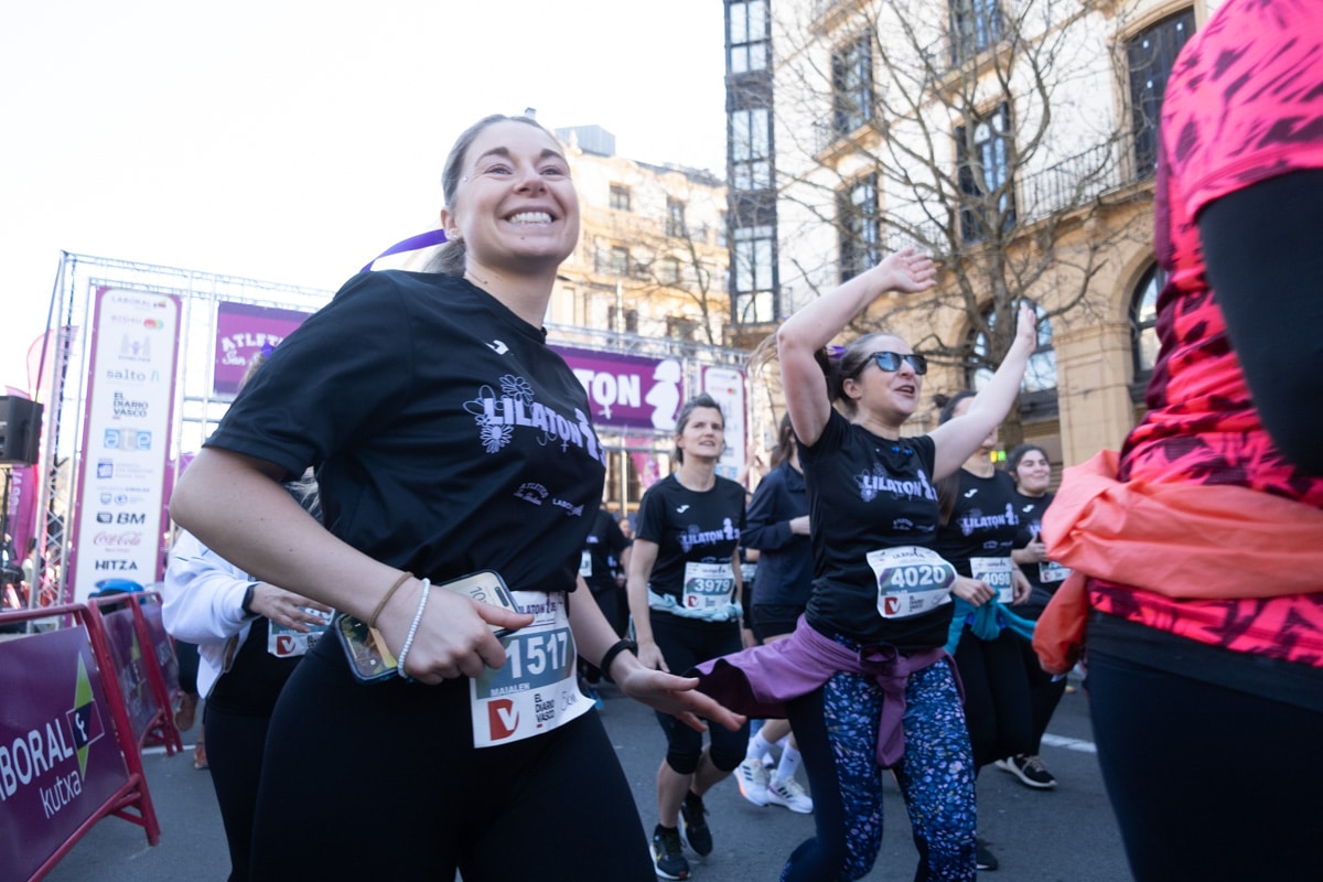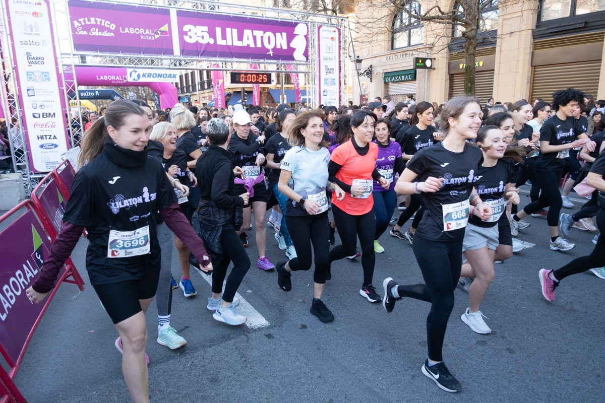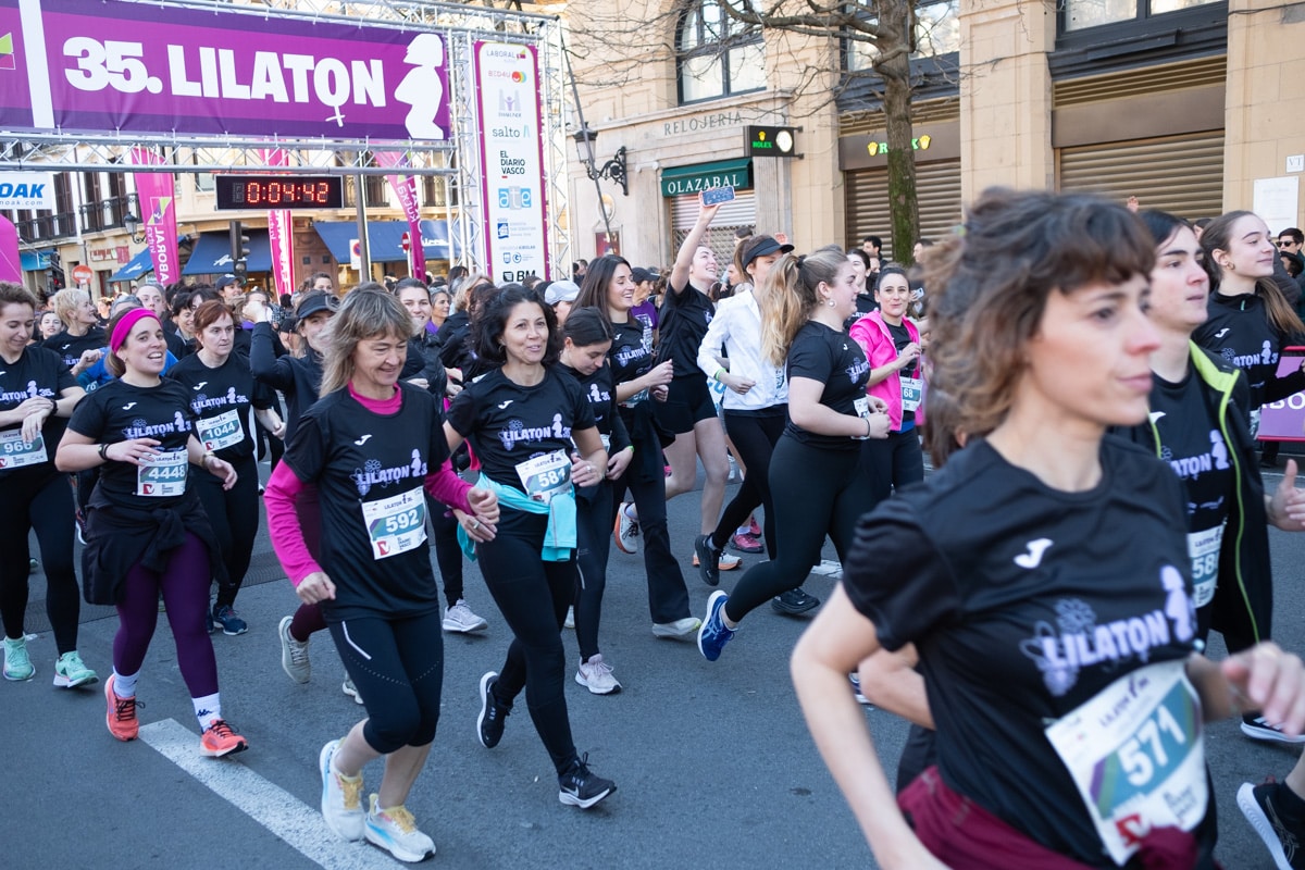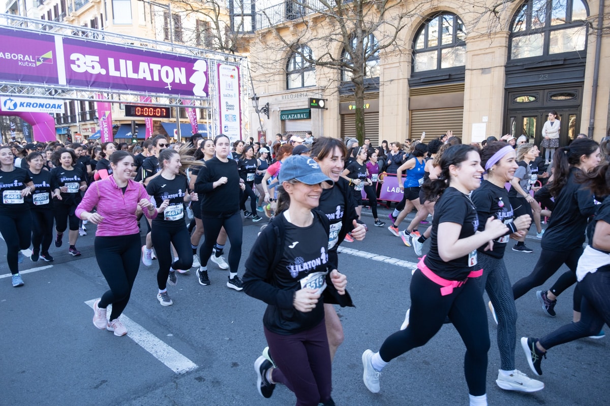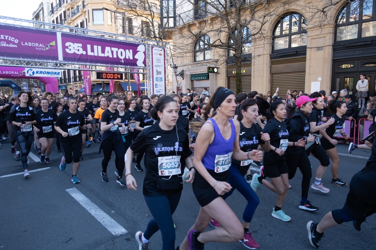 Ambientazo en una edición más, y van 35, de la Lilatón, la carrera femenina y feminista de 5 kilómetros del Club Deportivo Atlético de San Sebastian. Carrera solidaria, también, ya que un euro de cada inscripción será donado a la Asociación Contra el Cáncer de Gipuzkoa. La cita, en la que se habían inscrito 6.200 mujeres, ha comenzado con una sesión de zumba y terminará con el Lilapote.