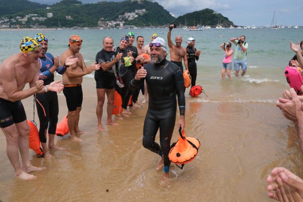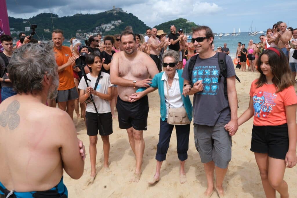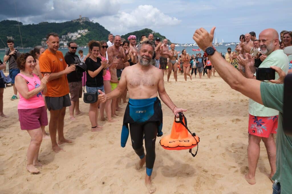 Uno de los momentos más emotivos del día fue la llegada del nadador Toño Ramiro, que partió a las 6:15 h desde Getaria y logró completar la travesía hasta Donostia pese a las duras condiciones del mar en el tramo inicial. A su llegada a la Concha, fue recibido entre aplausos por su madre Paqui Castro, diagnosticada de EM hace 30 años, familiares, amigos, autoridades y la presidenta de ADEMGI, María Luisa Ustarroz.