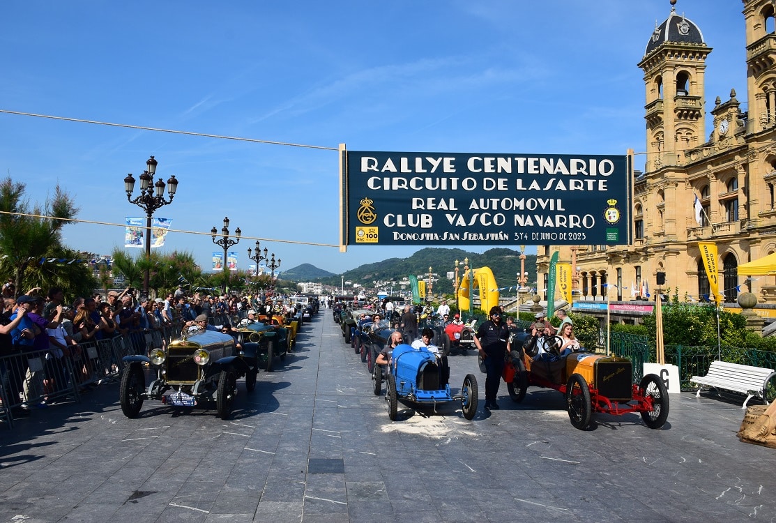 La exhibición estaba organizada por el Real Automóvil Club Vasco Navarro (RACVN) y por la Federación de Vehículos Antiguos (FEVA) y las 10:30 de la mañana el presidente del RACVN, Pedro Martínez de Artola, ha izado la bandera para dar salida a los participantes y dar comienzo de forma oficial al rallye que conmemora los cien años desde el primer gran premio celebrado en el legendario Circuito de Lasarte y el nacimiento del club automovilista (promotor de las pruebas de automovilismo y motociclismo organizadas en el circuito).