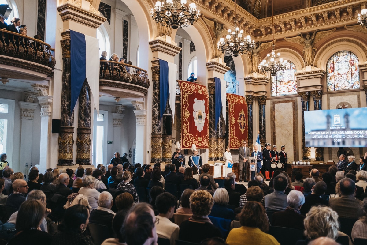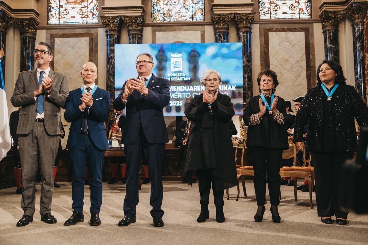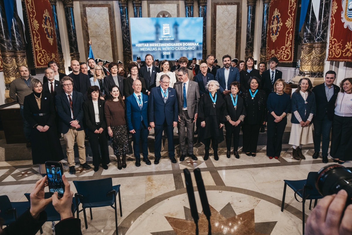 El Ayuntamiento de Donostia ha entregado esta mañana las Medallas al Mérito Ciudadano 2025. «Vuestro desempeño nos hace mejor como ciudad», ha expresado el alcalde Eneko Goia a la Asociación Mestiza, el Banco de Alimentos de Gipuzkoa, Contxu Uzkudun, Iñaki Almandoz y Radio San Sebastián, que han sido las entidades y personas reconocidas con este honor. (Próximamente más fotos)