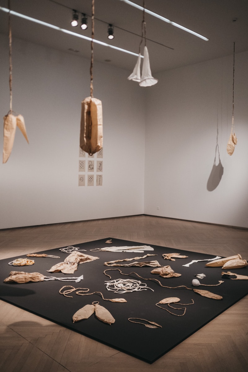 En el piso superior, junto a un conjunto de dibujos de cordeles, nos adentramos en la Habitación de Manila (1993), una serie de piezas hechas de papel de Manila durante una estancia en Lanzarote, durante la cual la artista estuvo realizando una serie de grabados y que llama «piezas leves».