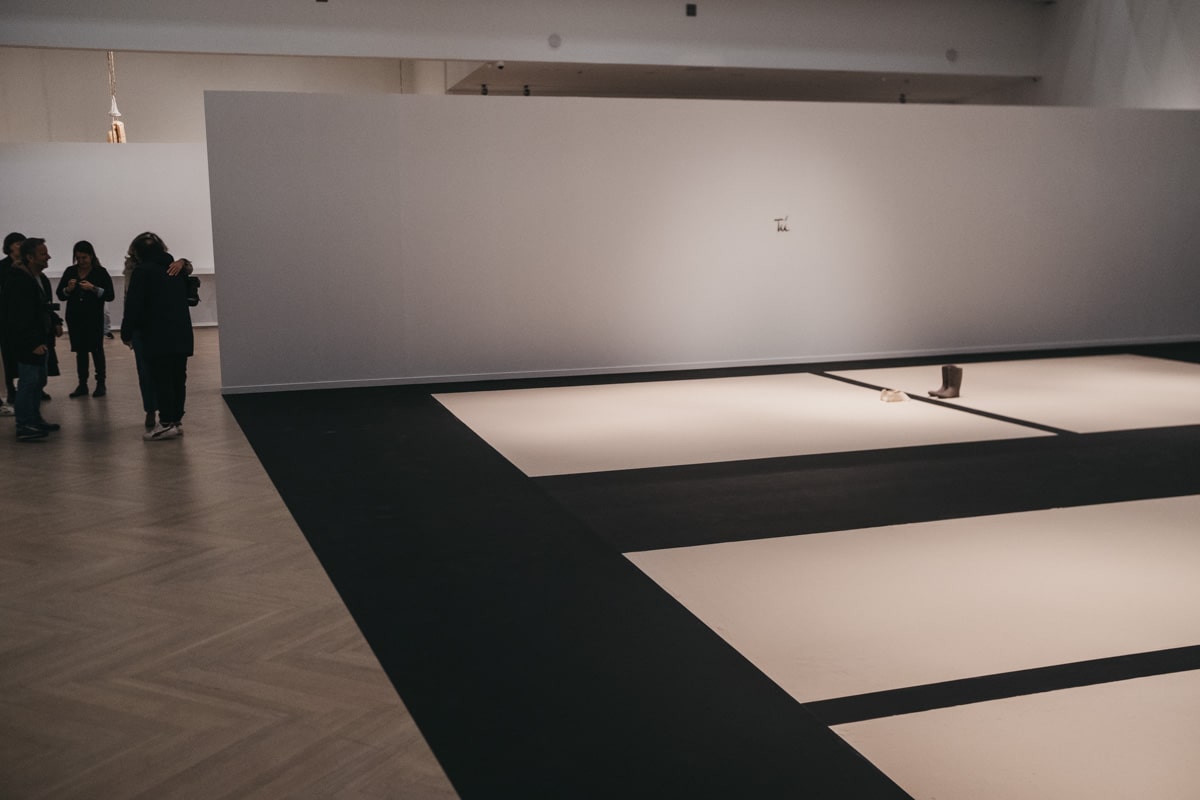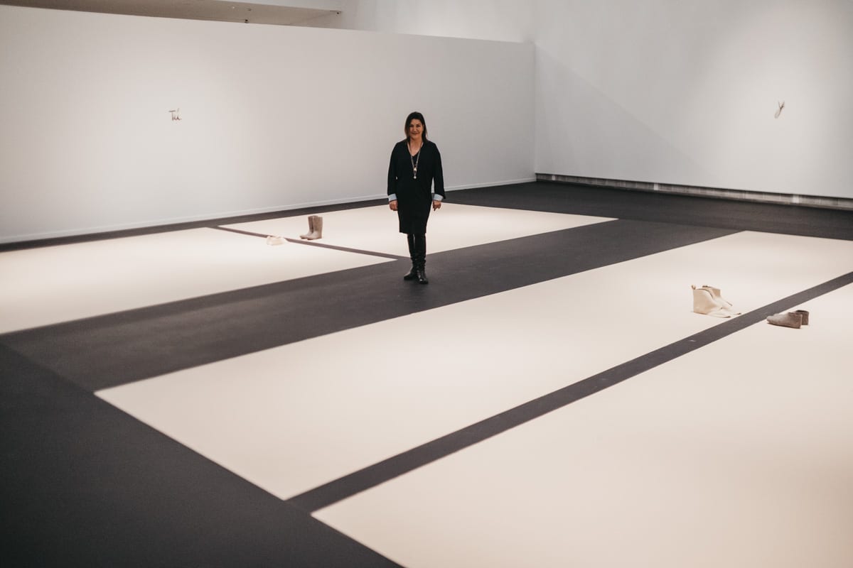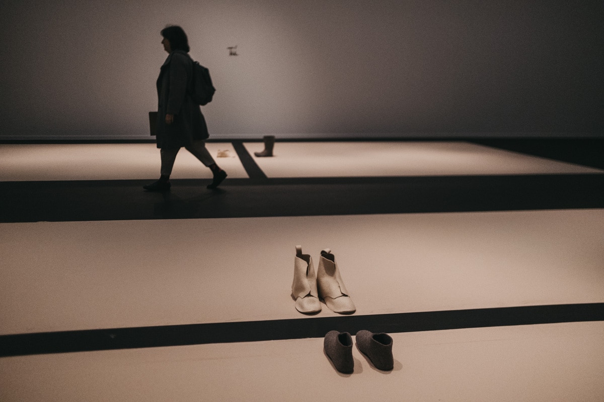 Tú y yo II (2000) unos pares de zapatos/botas de fieltro claros unos y oscuros los otros se enfrentan en cuatro campos de arena fina.