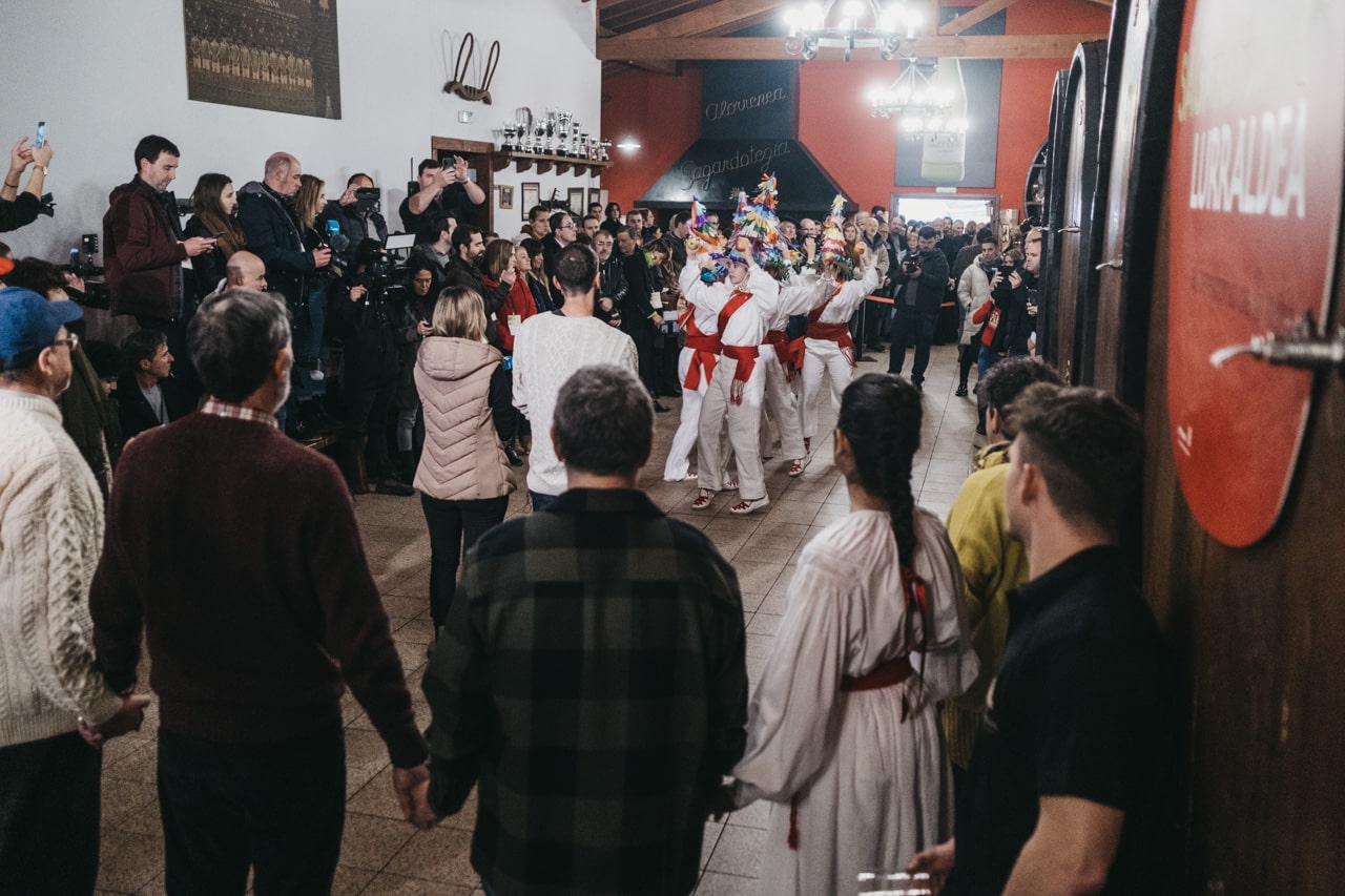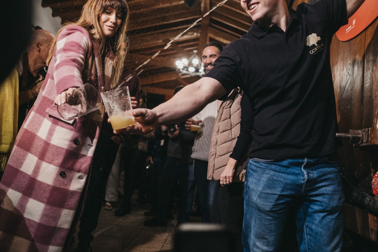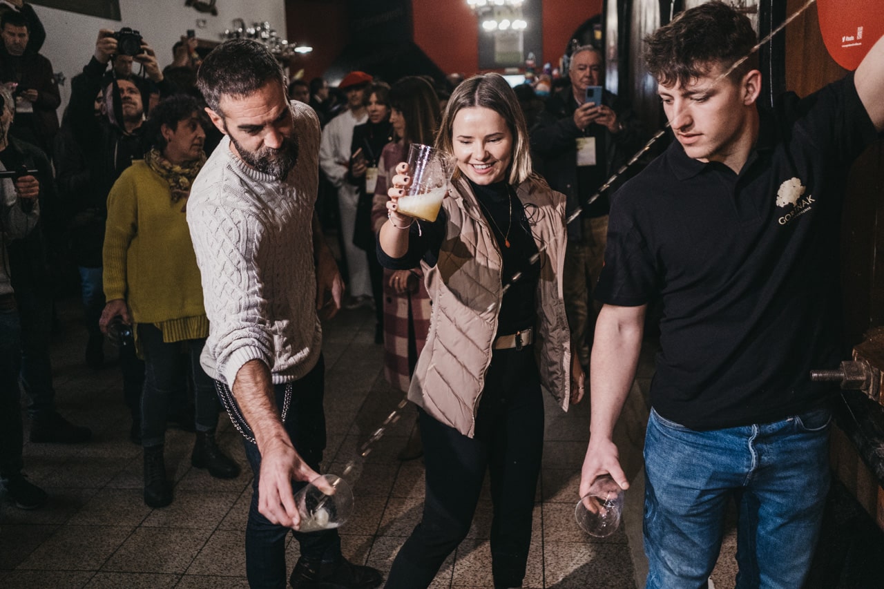 Los célebres intérpretes han degustado el primer vaso de sidra escanciado directamente de la «kupela» y, al tradicional grito de «Gure sagardo berria», han inaugurado la temporada de sidra al «txotx» en la sidrería Alorrenea de Astigarraga, el municipio que constituye el centro neurálgico de la tradición sidrera vasca.