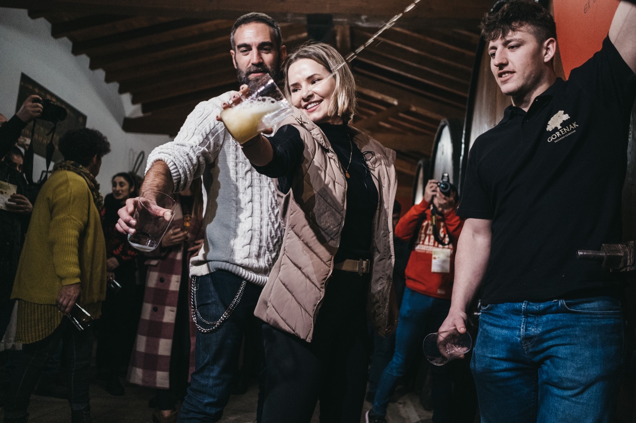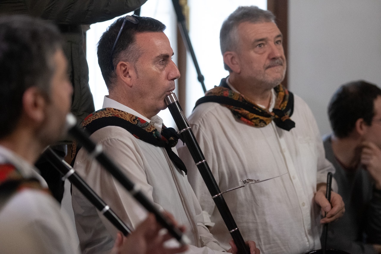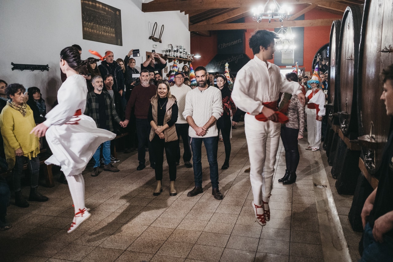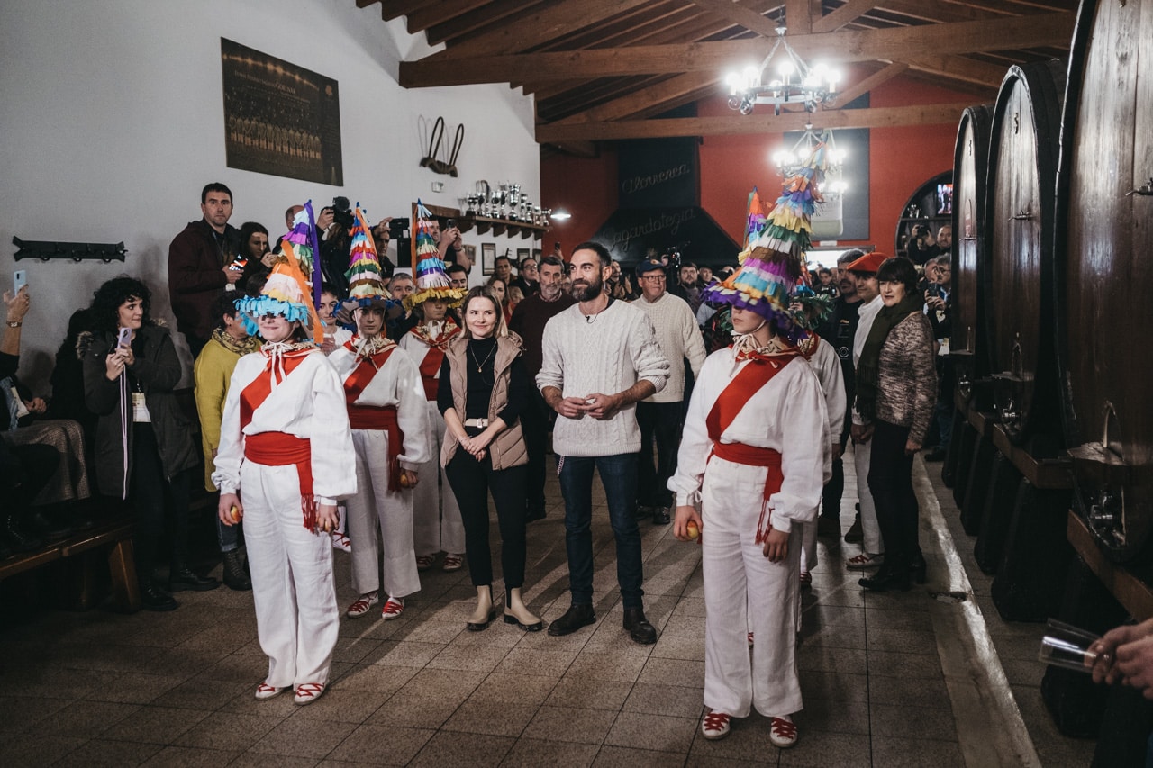 Los célebres intérpretes han degustado el primer vaso de sidra escanciado directamente de la «kupela» y, al tradicional grito de «Gure sagardo berria», han inaugurado la temporada de sidra al «txotx» en la sidrería Alorrenea de Astigarraga, el municipio que constituye el centro neurálgico de la tradición sidrera vasca.