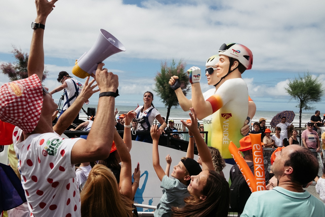 Antes de que el francés Victor Lafay del Cofidis llegara a la meta del Kursaal como campeón de la etapa, la Avenida de la Zurriola era una fiesta con público de todas las edades y nacionalidades pendiente de la caravana de coches oficiales (y pintorescos en muchos casos) que comenzó a llegar pasadas las 15 horas regalando camisetas, gorras y plásticos para hacer ruido. Y haciendo las delicias de los presentes.