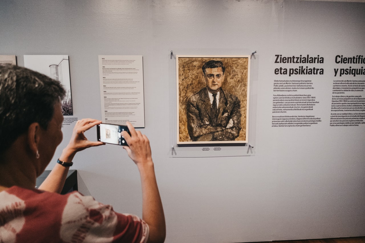 Fotografías, objetos personales de su práctica médica, textos inéditos, postales, apuntes de medicina y dibujos de anatomía ilustran la parte biográfica de la exposición así como su vinculación con personajes del mundo de la cultura como Gabriel Celaya, Eduardo Chillida y su compromiso político.
