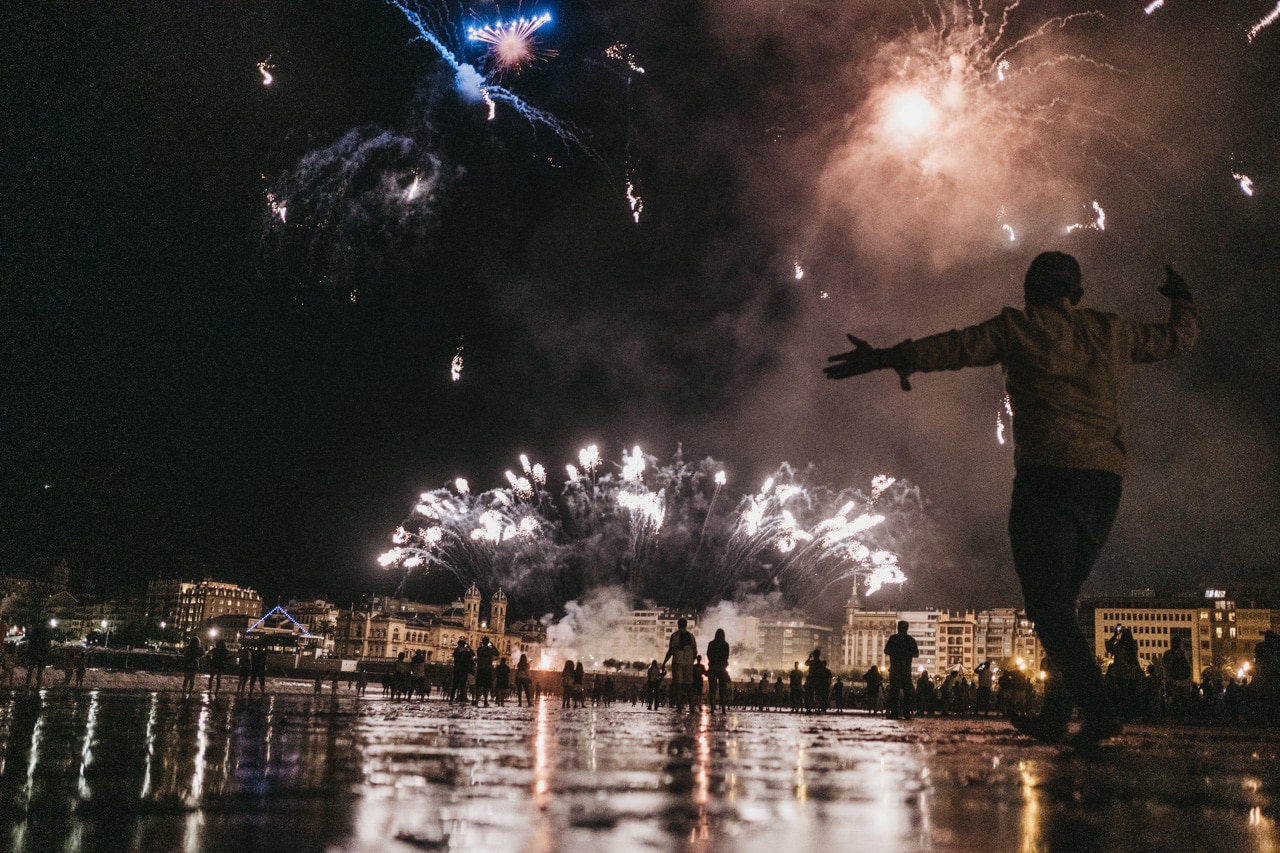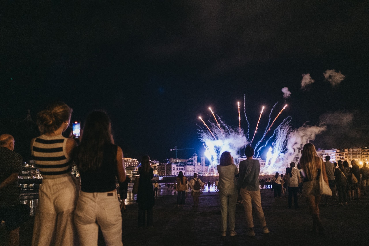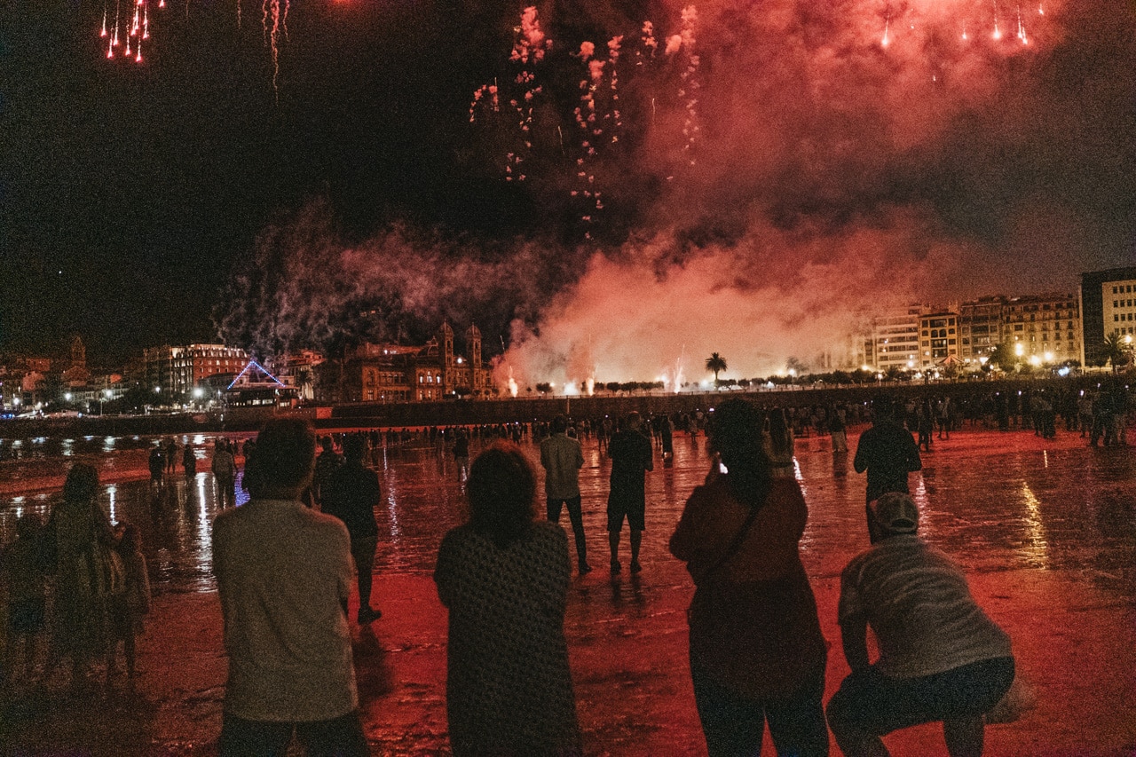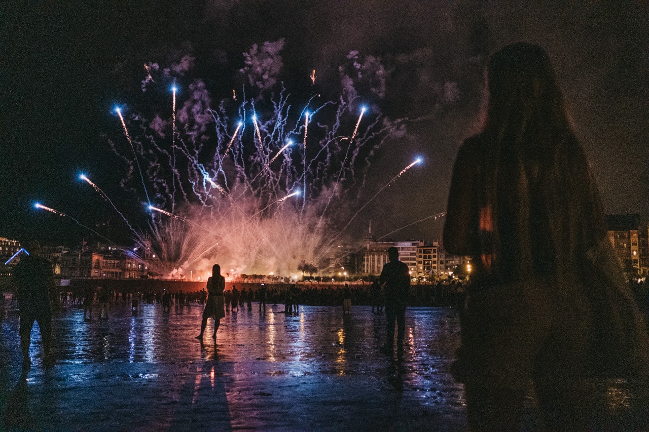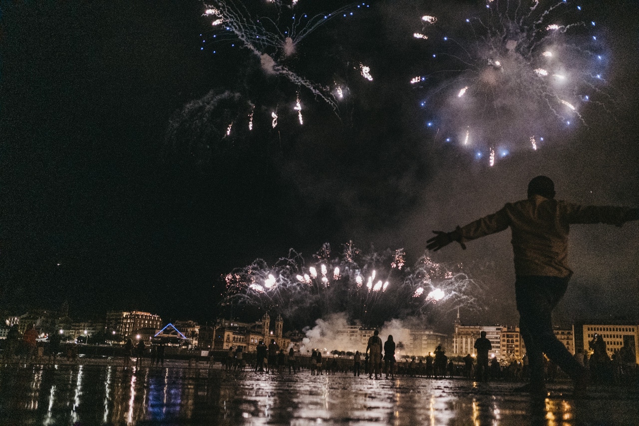 Era la última noche festiva, la del sábado, y la lluvia perdonó y reunió a miles de donostiarras en las calles y en la playa para disfrutar del espectáculo de fuegos y música con la pirotecnia portuguesa Oleirense.