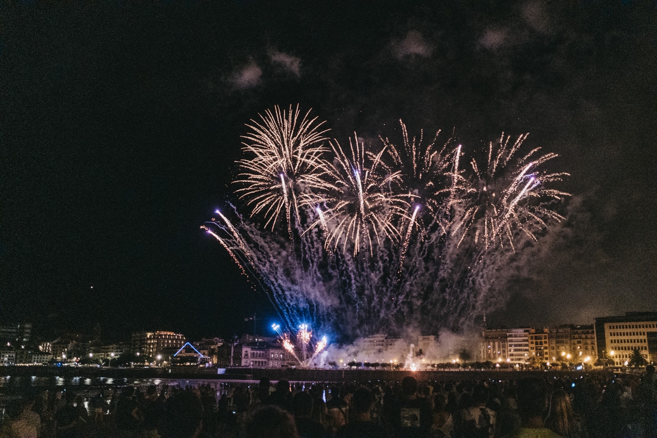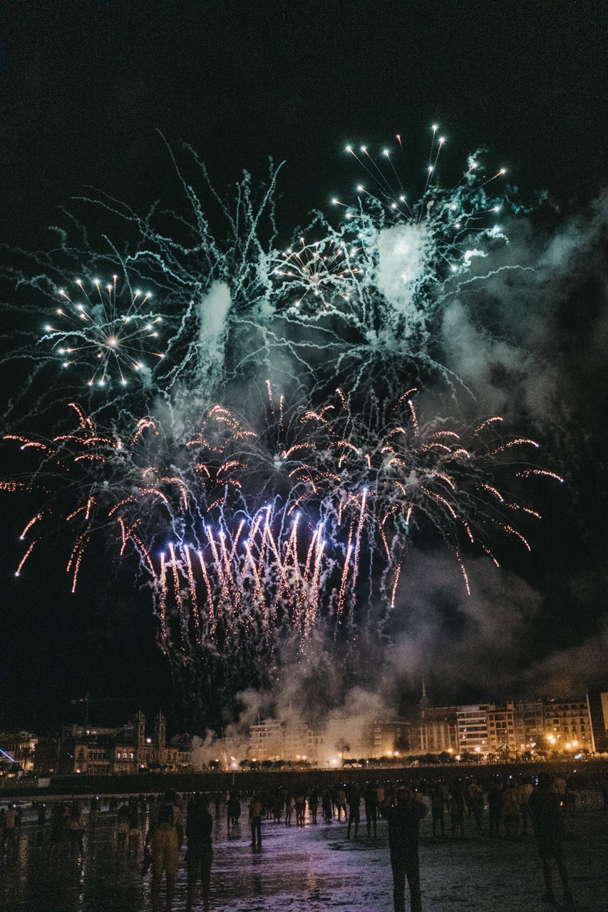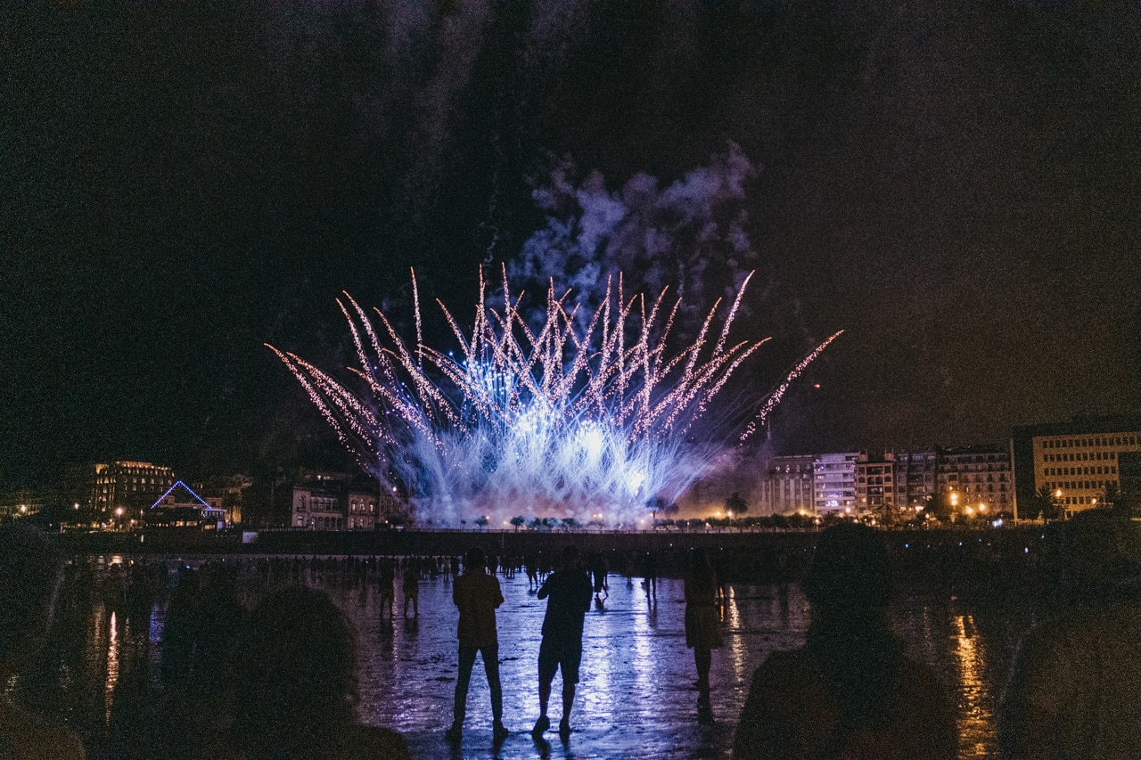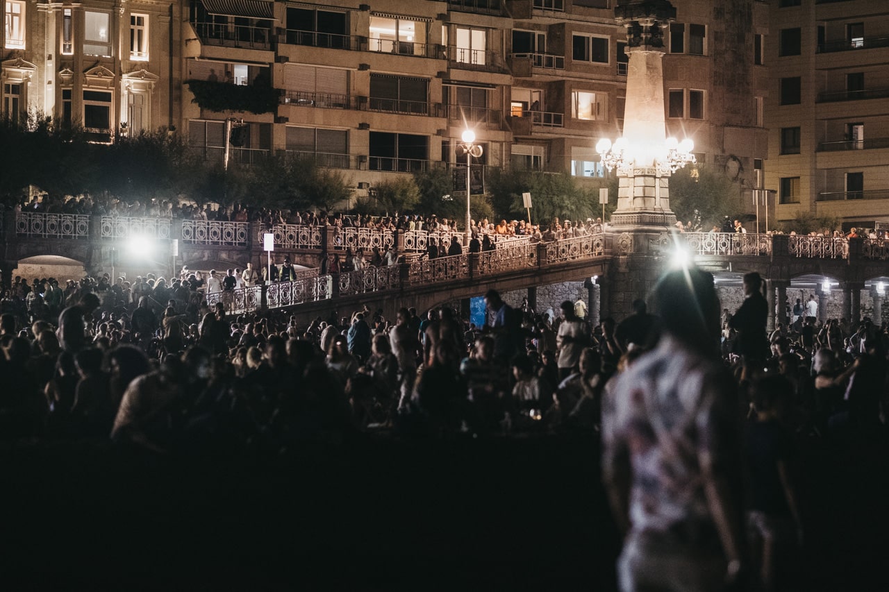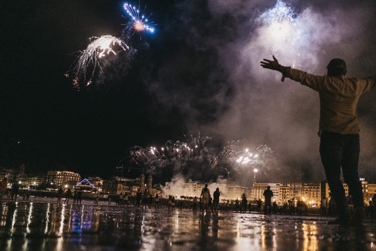Era la última noche festiva, la del sábado, y la lluvia perdonó y reunió a miles de donostiarras en las calles y en la playa para disfrutar del espectáculo de fuegos y música con la pirotecnia portuguesa Oleirense.