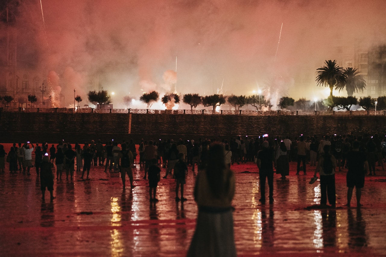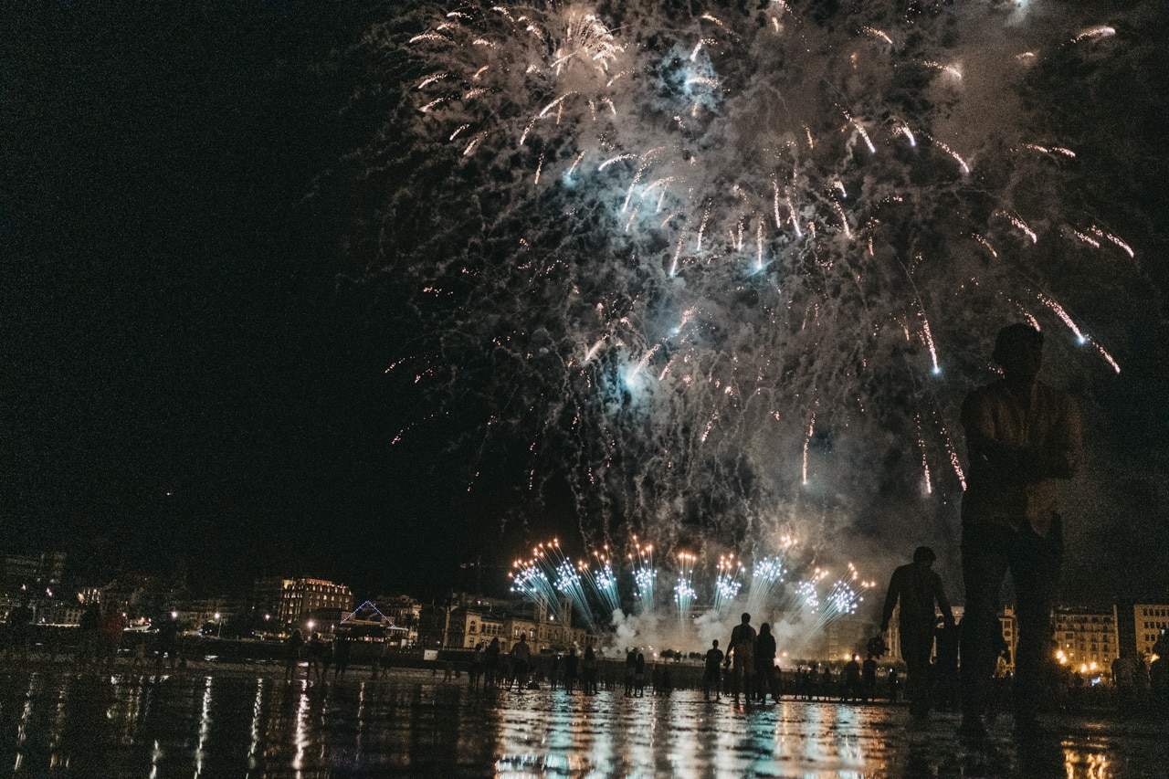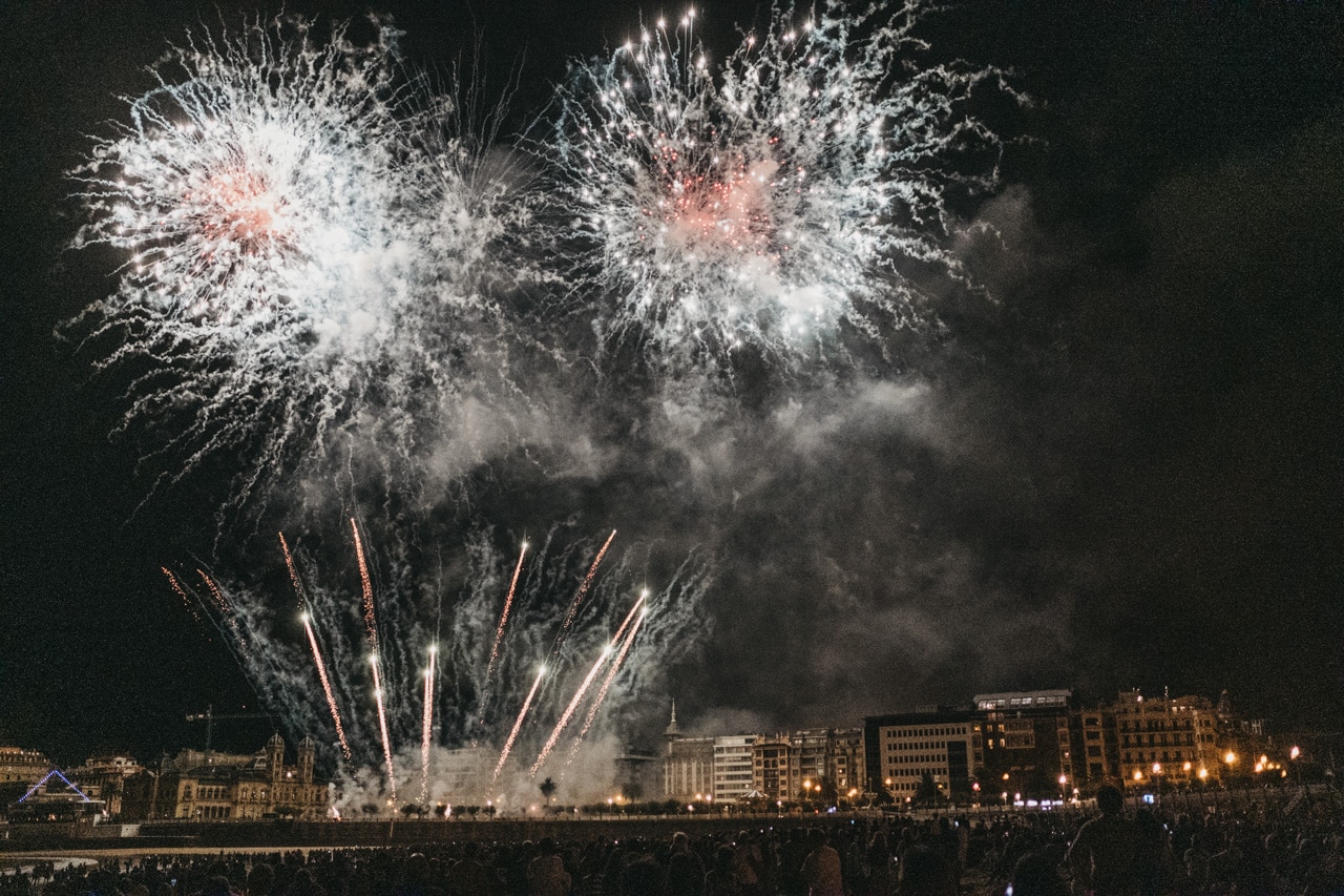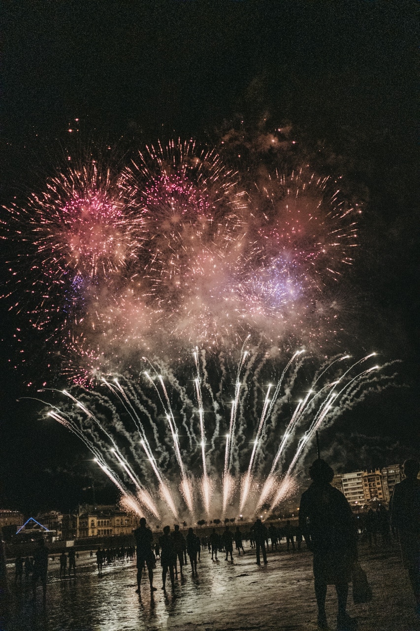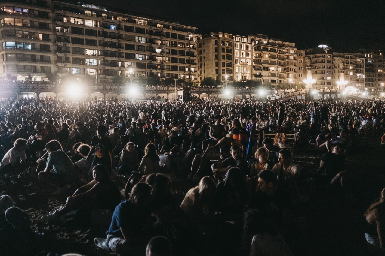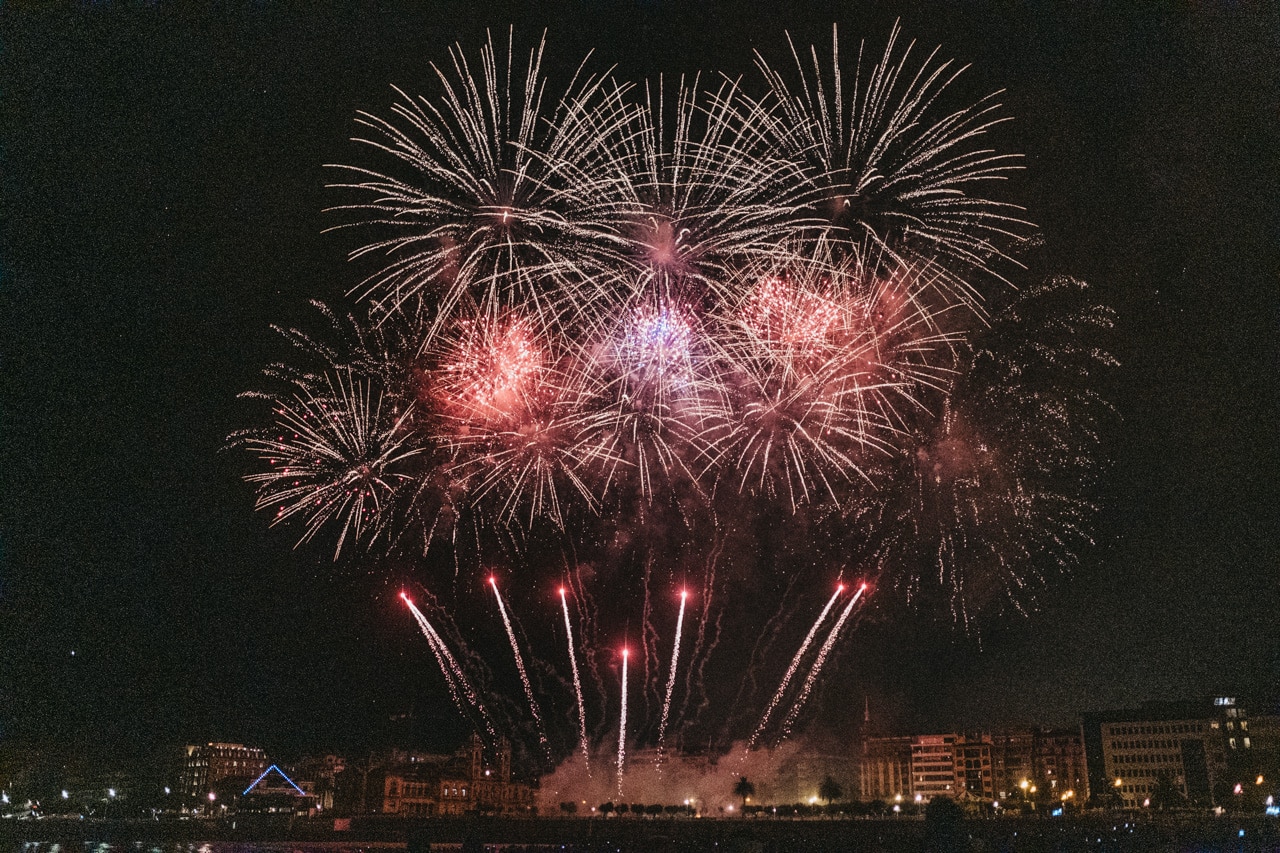 Era la última noche festiva, la del sábado, y la lluvia perdonó y reunió a miles de donostiarras en las calles y en la playa para disfrutar del espectáculo de fuegos y música con la pirotecnia portuguesa Oleirense.