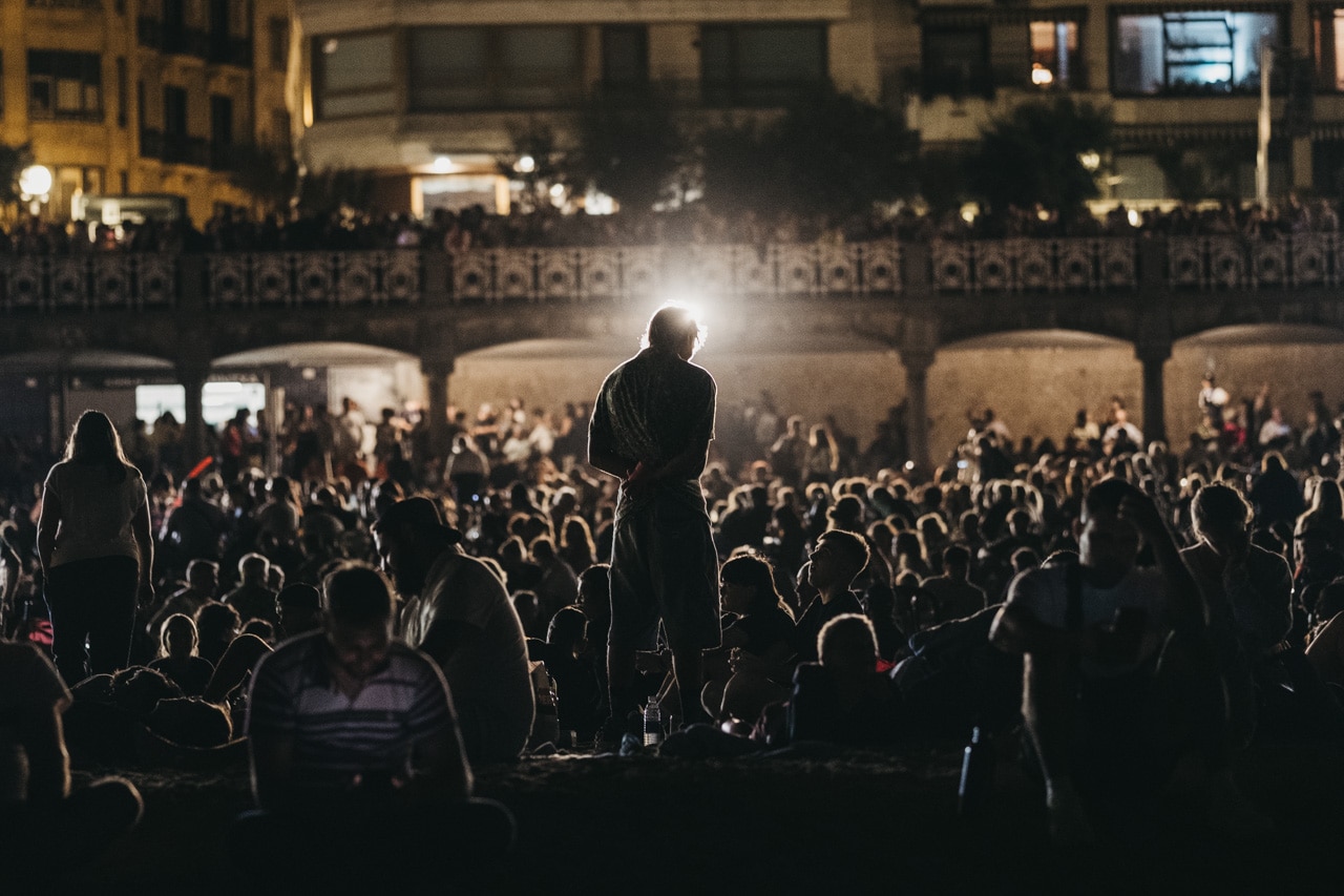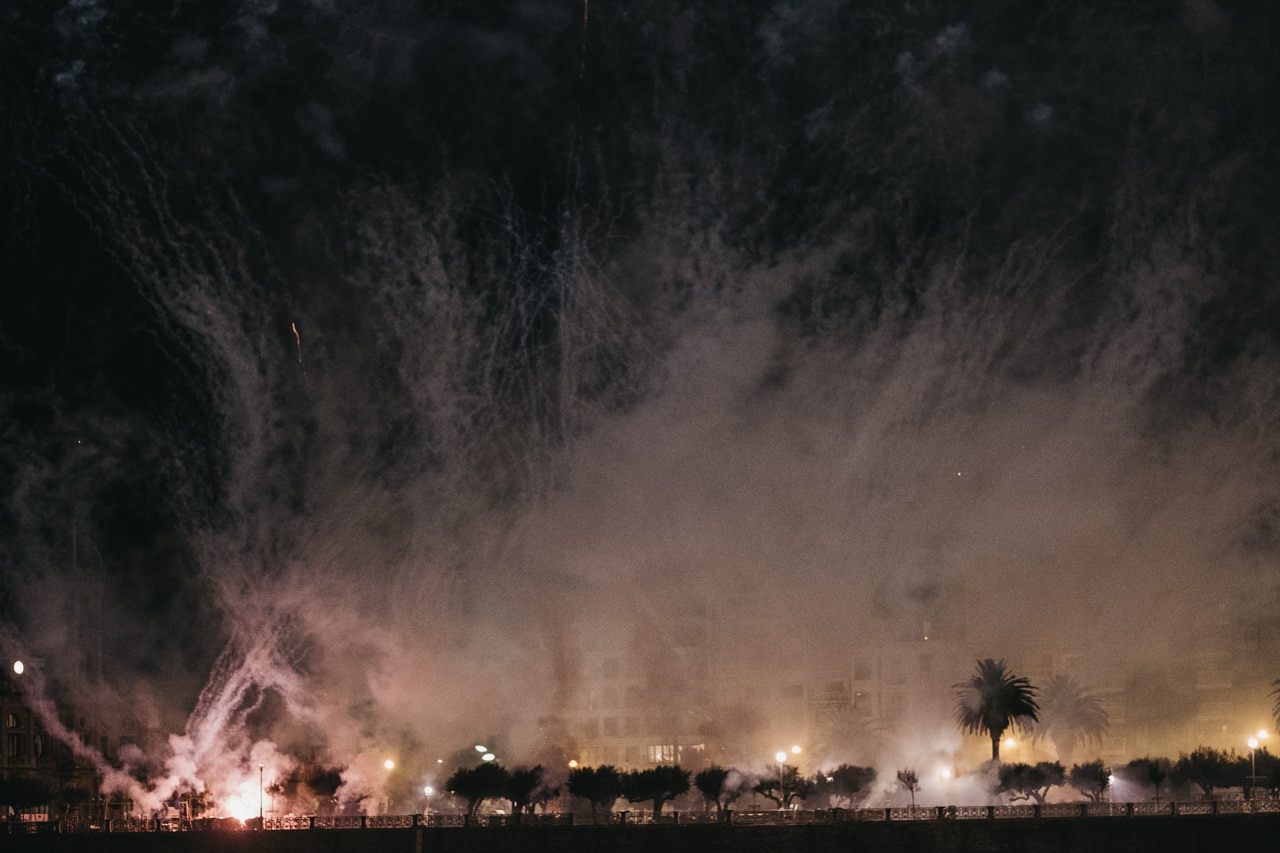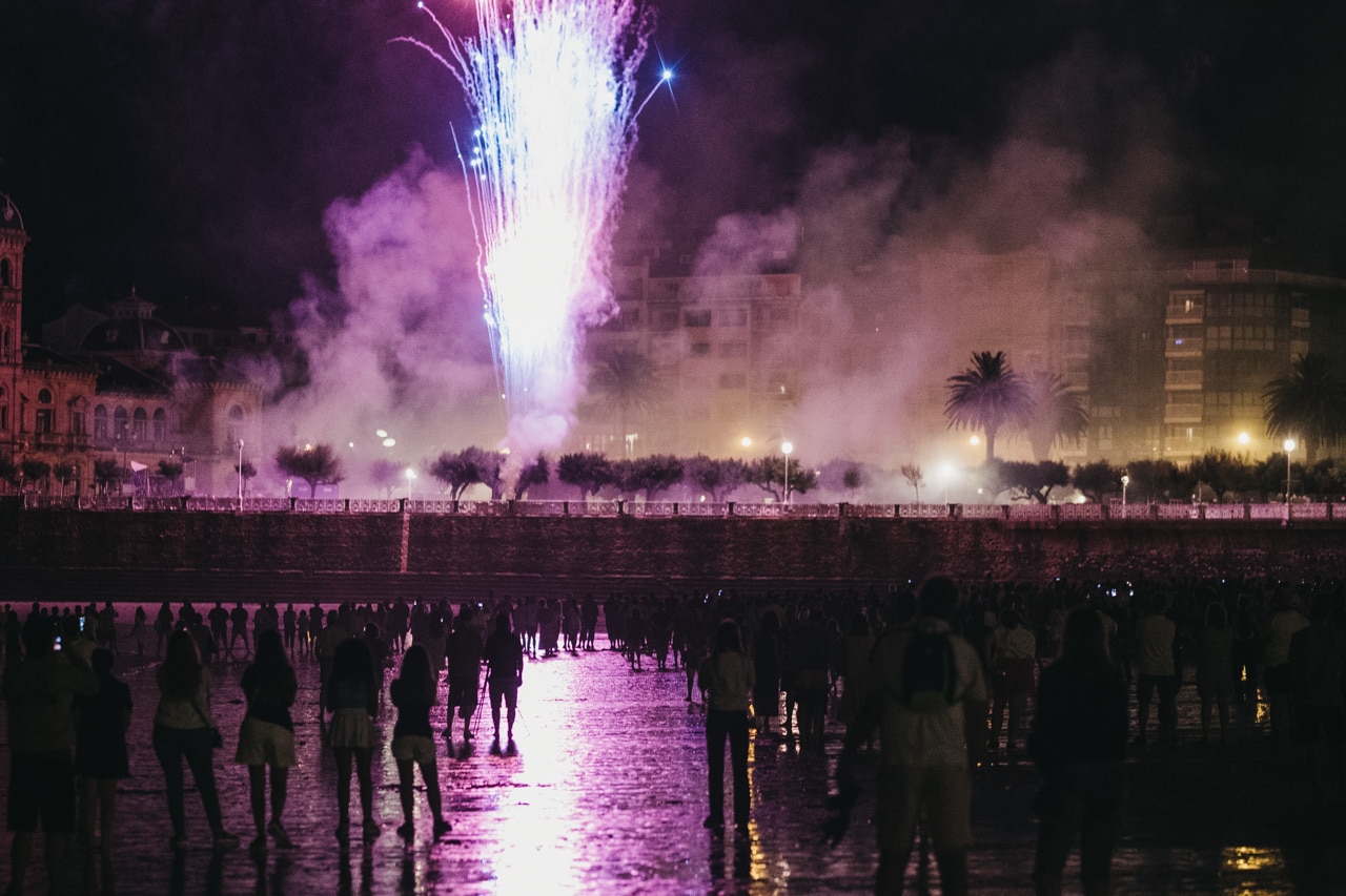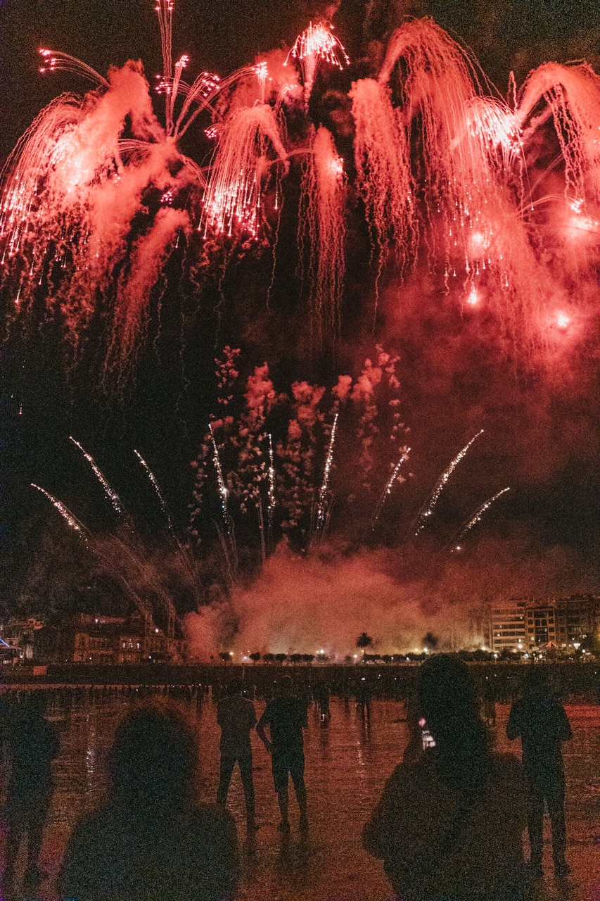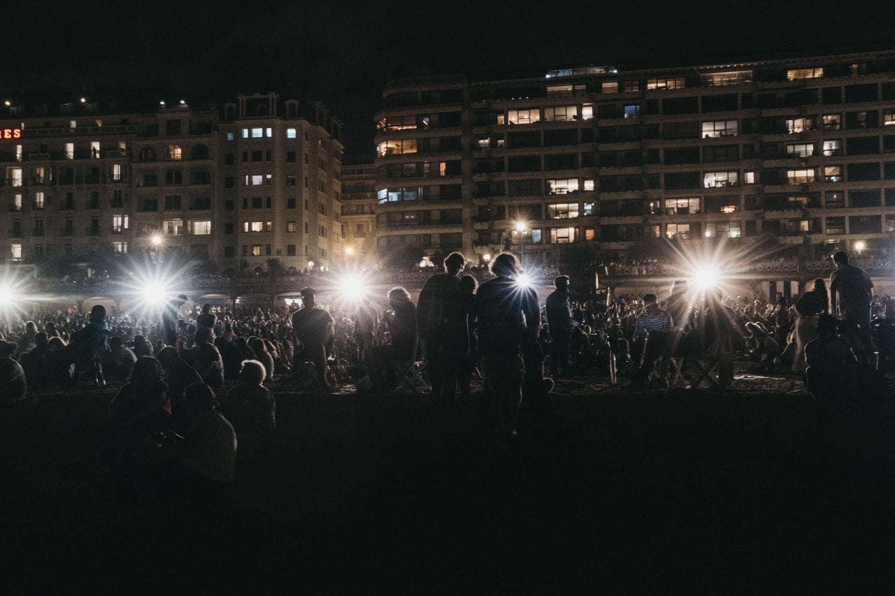 Era la última noche festiva, la del sábado, y la lluvia perdonó y reunió a miles de donostiarras en las calles y en la playa para disfrutar del espectáculo de fuegos y música con la pirotecnia portuguesa Oleirense.