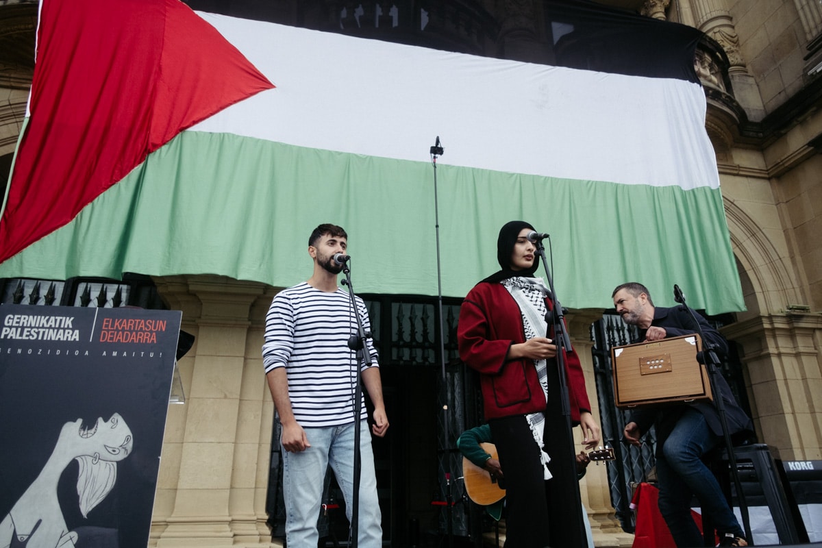 Además de esta representación, el acto ha contado con la música de Sol Band, la banda palestina que lleva meses residiendo en Donostia y que tras interpretar un tema propio ha cantado junto a Eñaut Elorrieta la canción ‘Gernika Gaza’. Después ha sonado ‘Baga, biga, higa’ de Mikel Laboa en las voces de un coro.